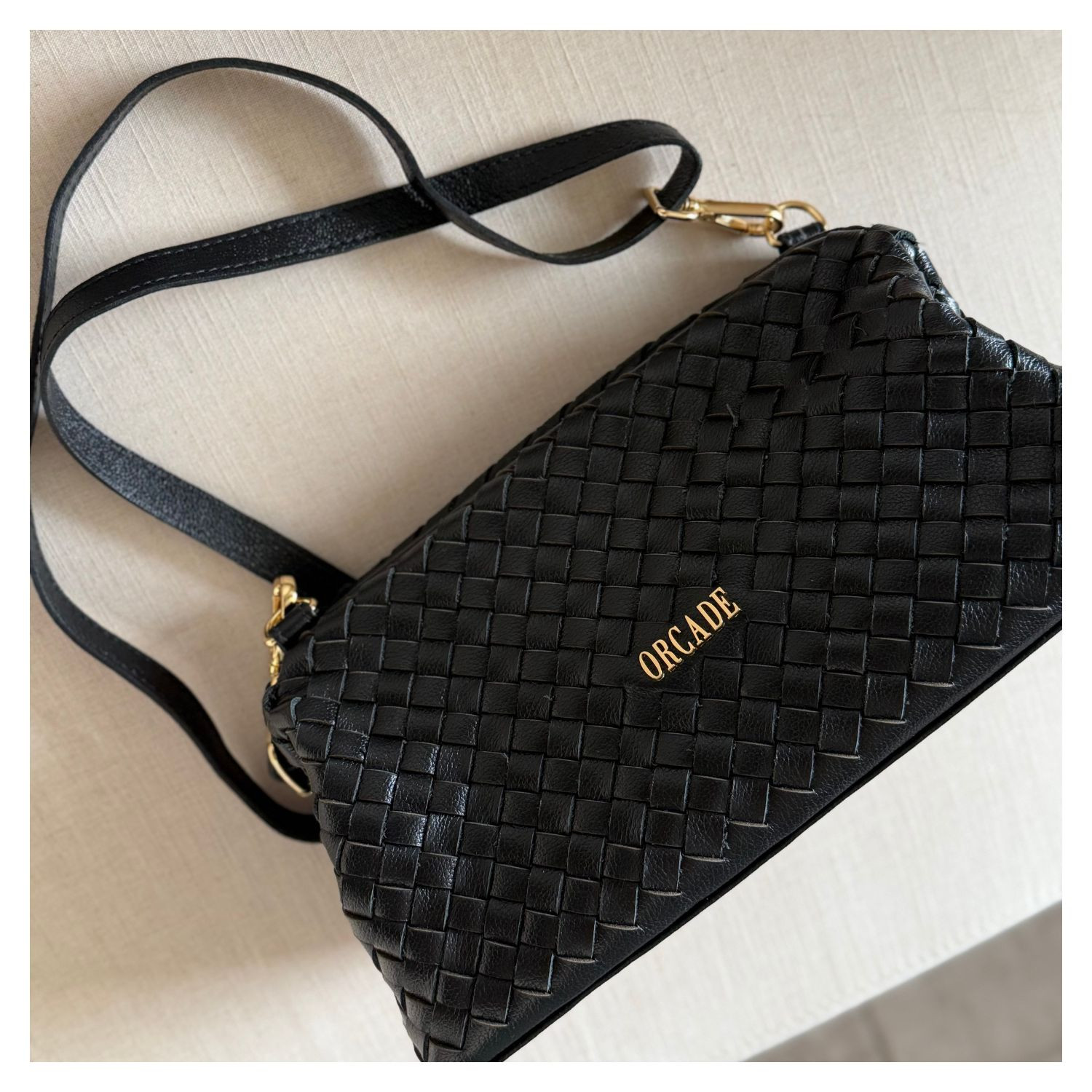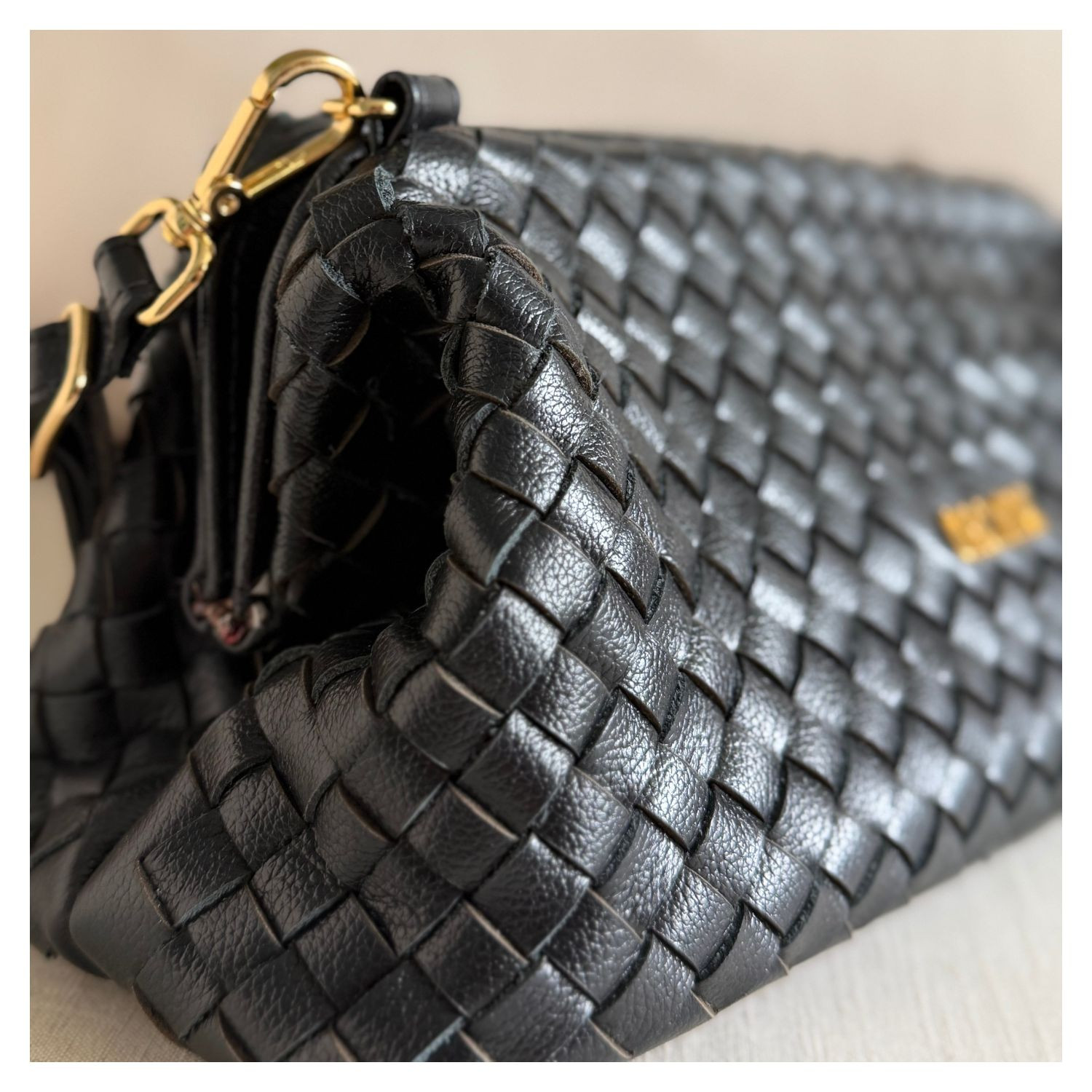 Bolsa em Couro Tramado Preto, Formado Retangular Com Alça Transversal e Fecho Imã.