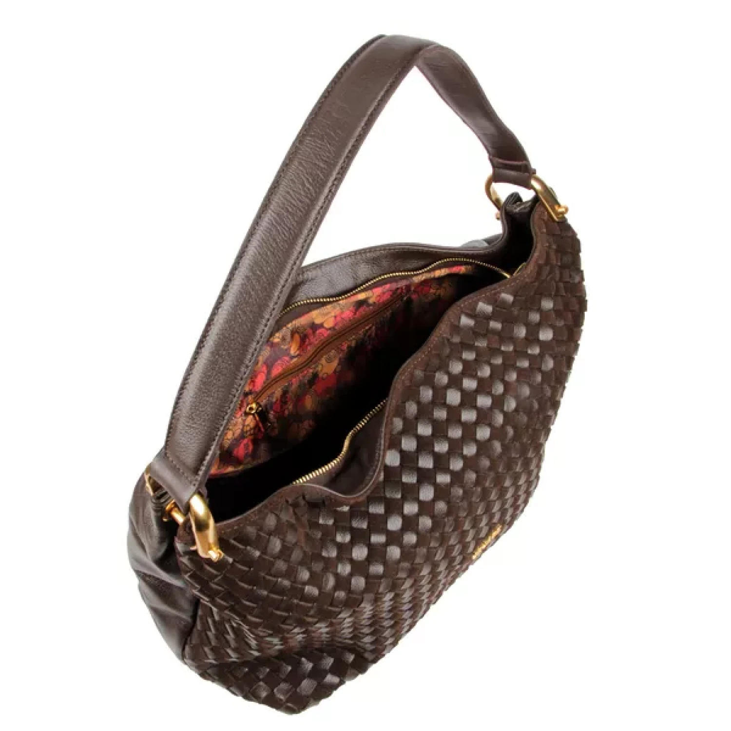 Bolsa confeccionada em couro camurça, o modelo se destaca pelo detalhe em couro liso tramado. Possui zíper principal além de abertura interna. Conta com duas opções de alça: de mão e transversal. 29cm de altura, 34cm de largura e 15cm de profundidade.