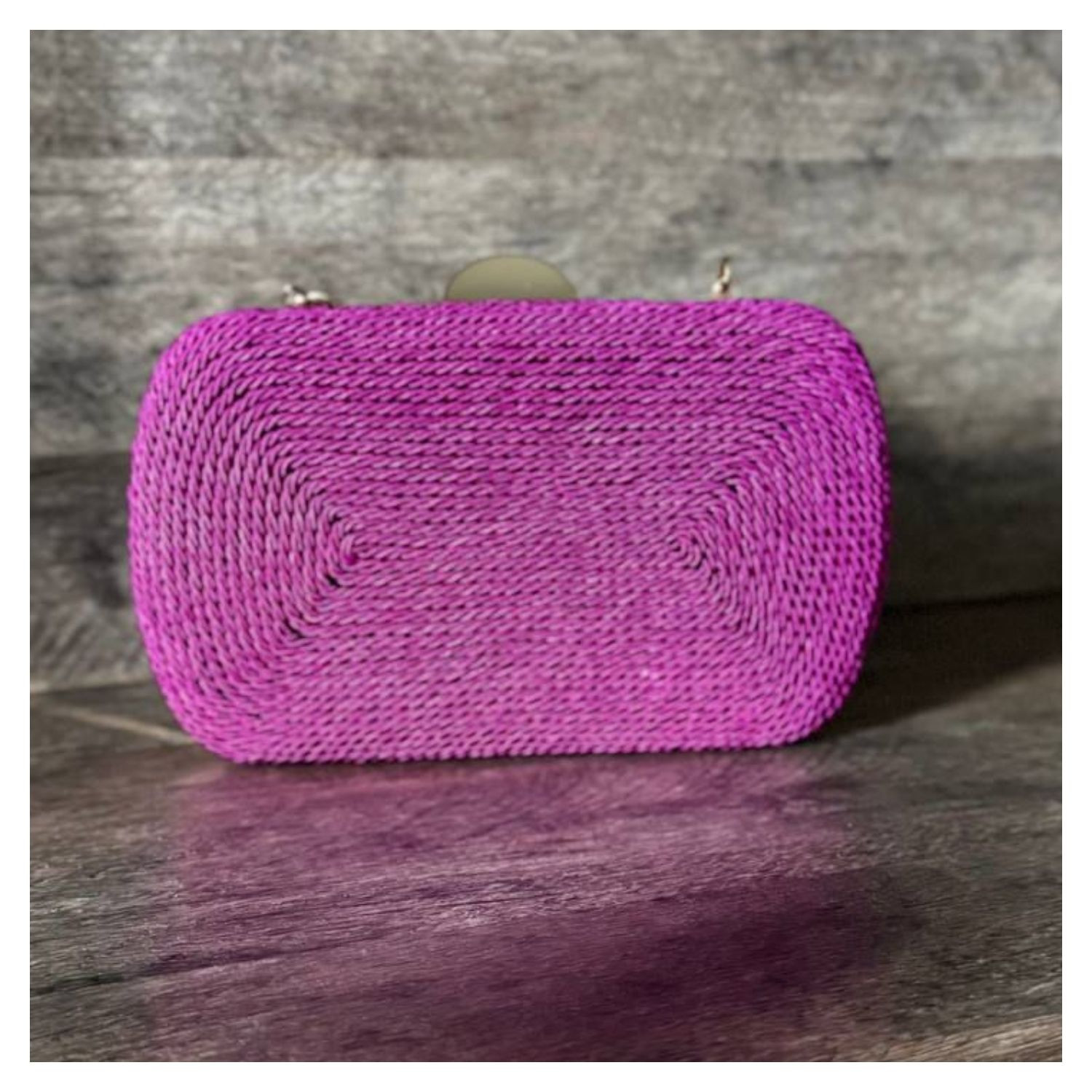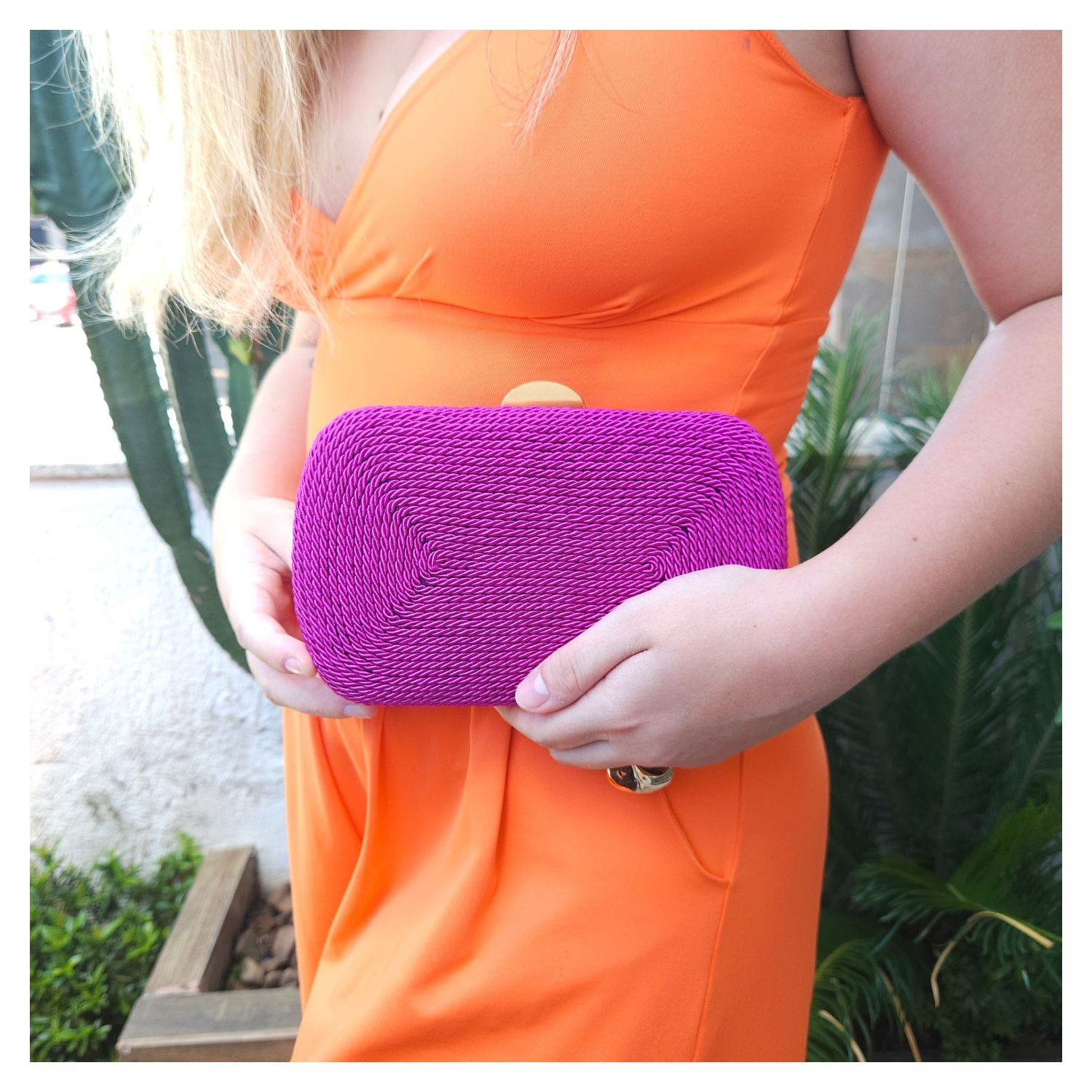 Clutch Retangular Toda em  Corda Fúcsia, Fecho Oval Dourado, Alça Corrente Removível, Inspiração