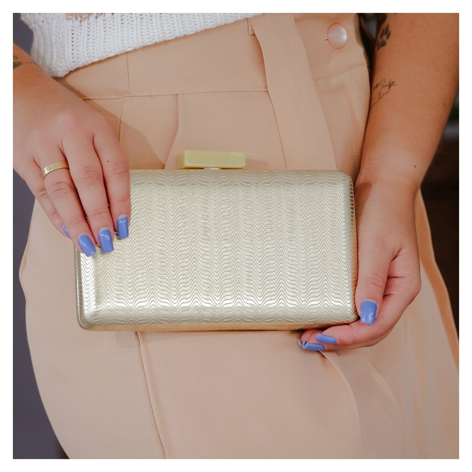 Clutch Estampa Dourada Metalizada, Fecho Acrílico com Alça Opcional de Corrente.