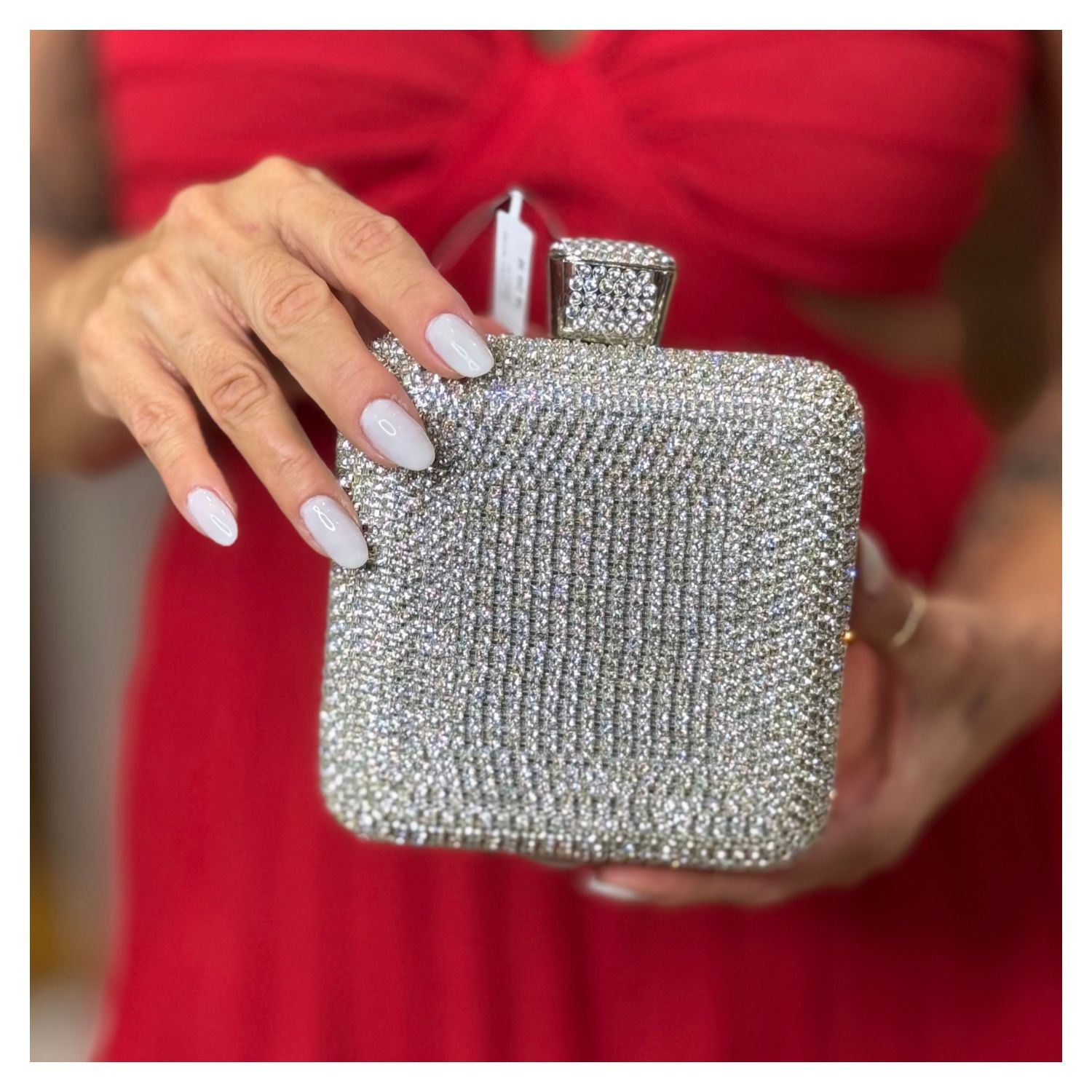 Bolsa Clutch Quadrada Metalizada, Toda em Strass Prateado, Fecho Quadrado, Alca Transversal .