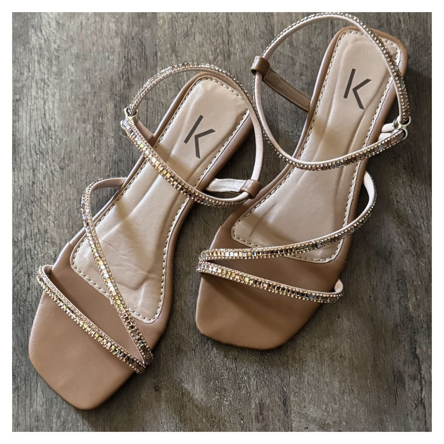 Rasteira Couro Ecológico Bege, Tiras Finas Em Z Com Strass Quadrados Rose, Ajuste No Tornozelo.