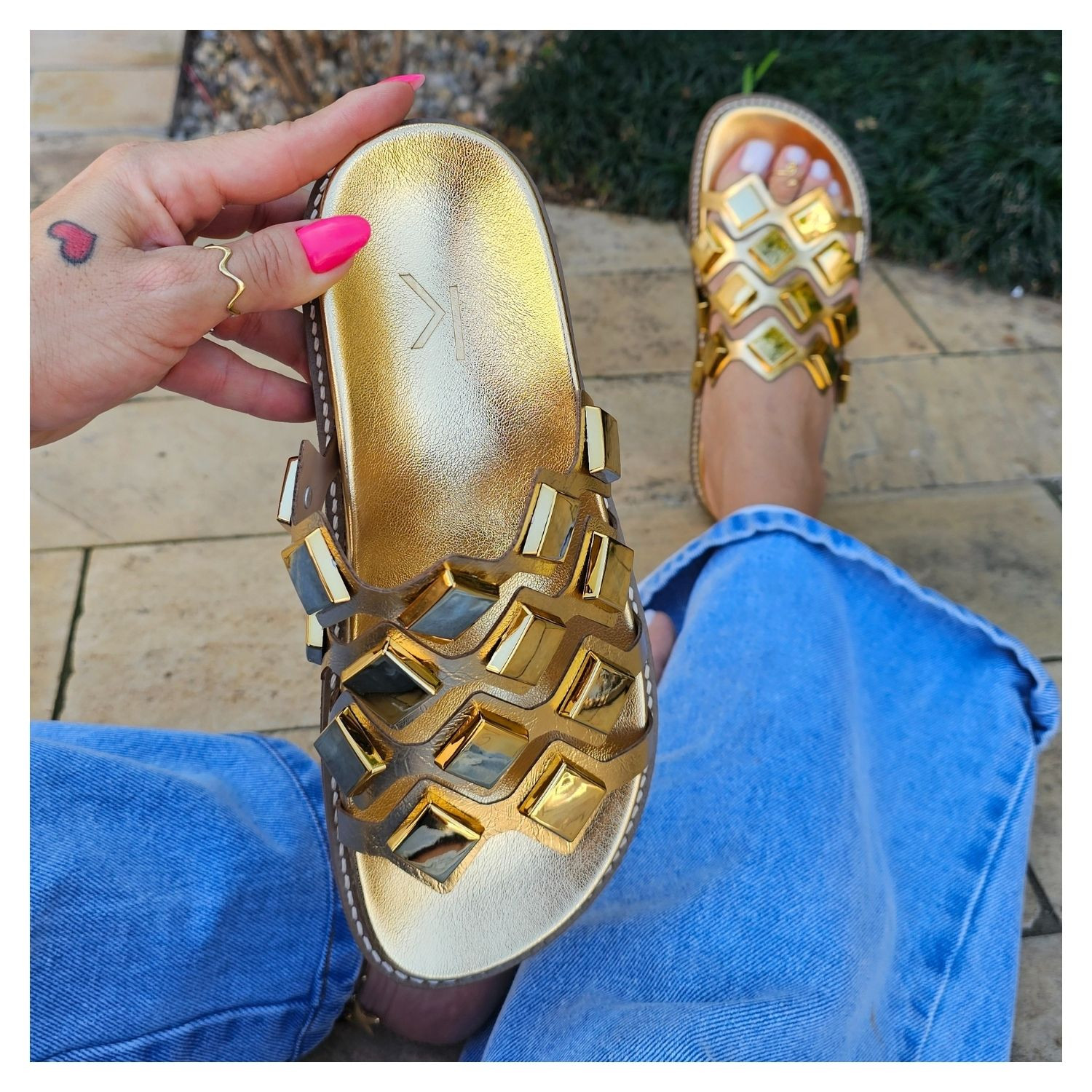 Birken Dourada Flat Quatro Tiras Com Aplicações Losangos Metalizados