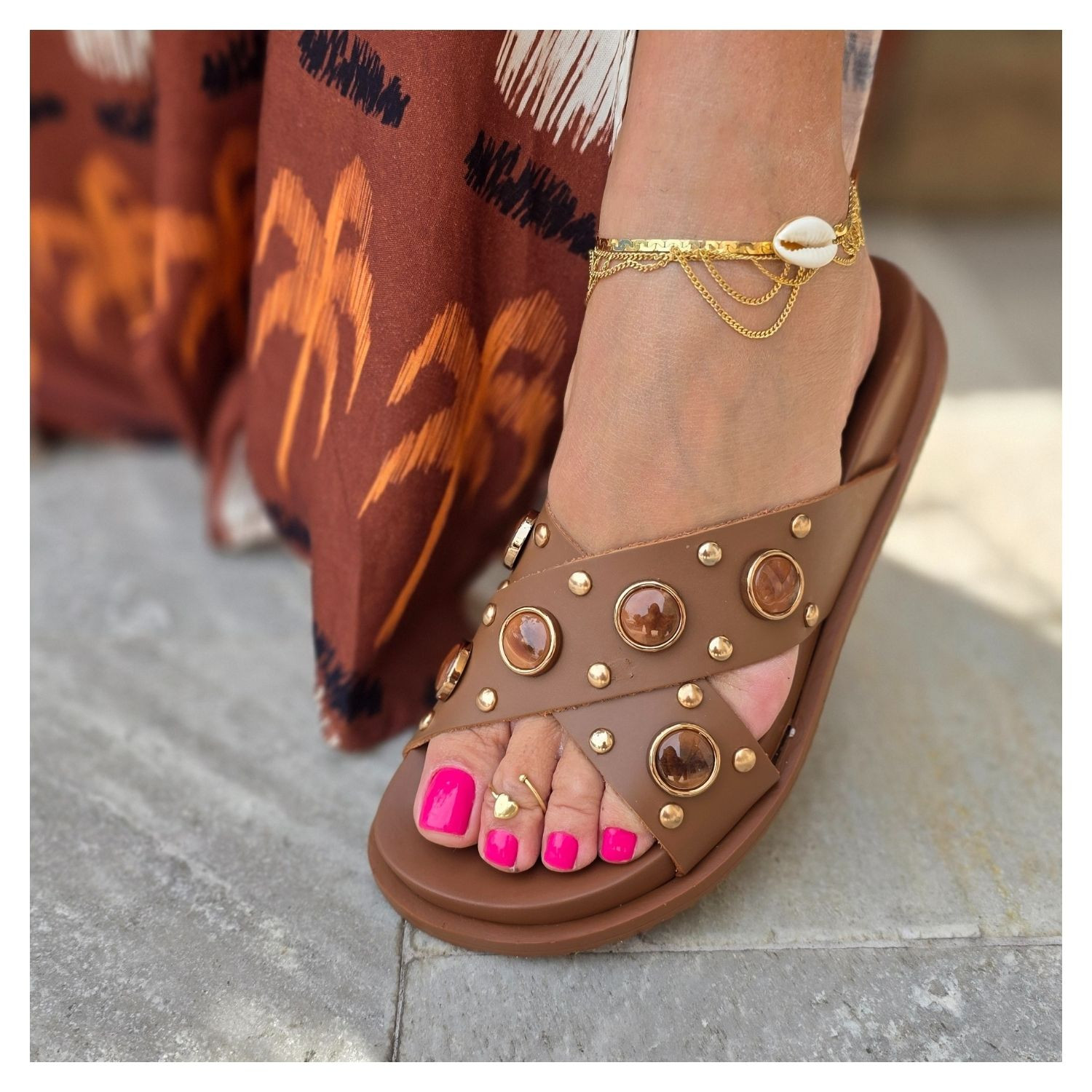 Birken Couro Marrom, Cabedal Tira em  X Com Esferas Caramelo, Sola Super Confy.