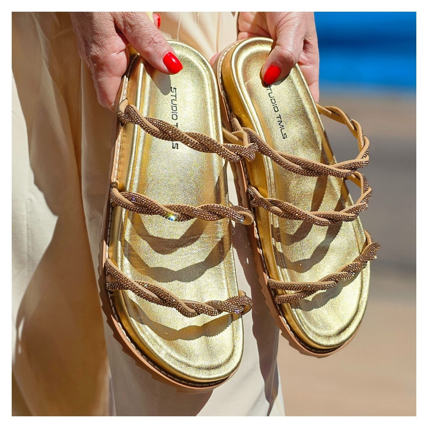 Birken Dourada Metalizada Couro Ecológico, Tiras Finas Com Strass Dourado Torcido.