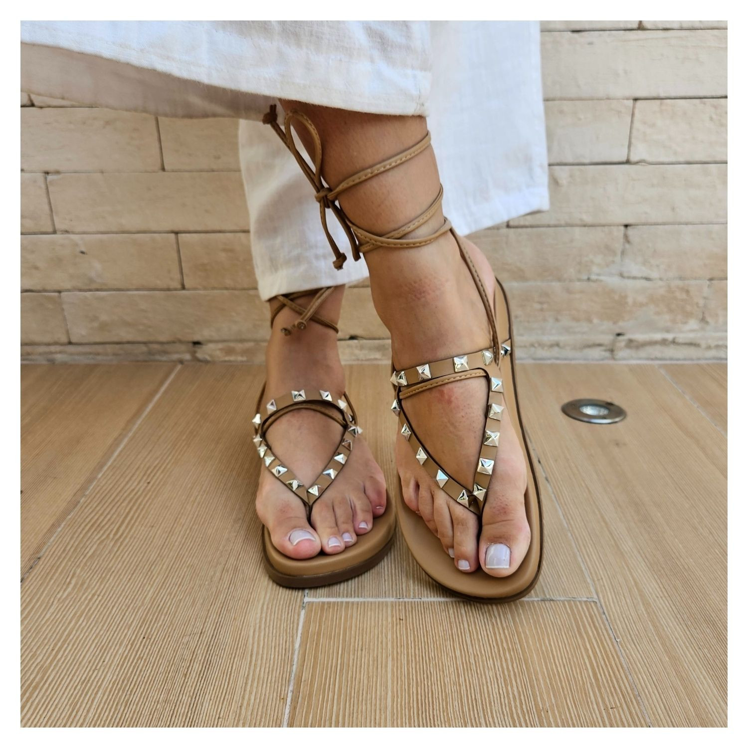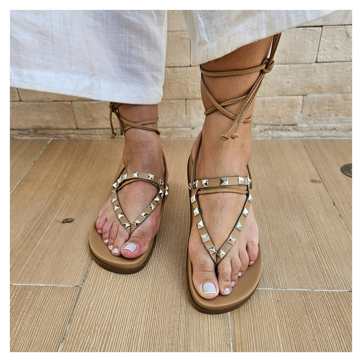 Birken em Couro Bege, Cabedal Triangular com Spikes Prateados, Tira Para Amarração no Tornozelo Removível Sendo Possível Usar Das Duas Formas.