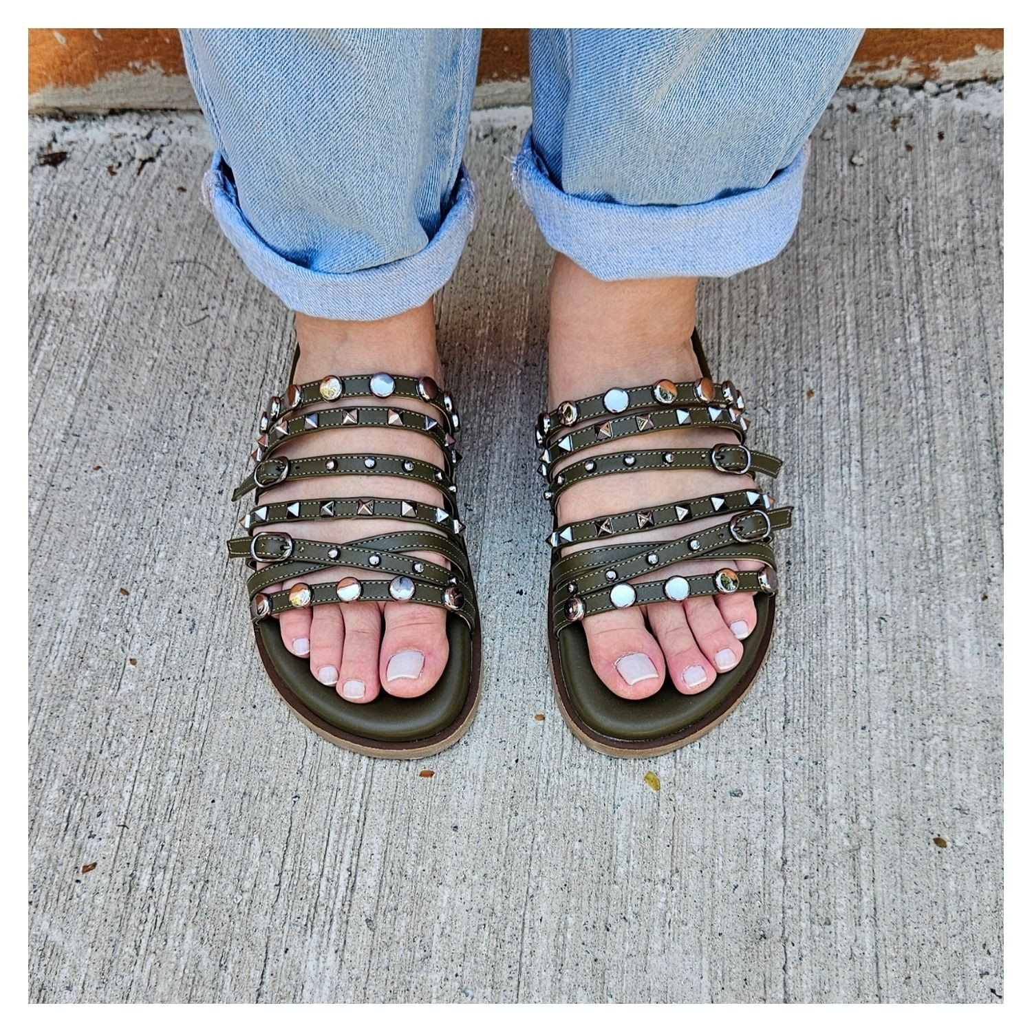 Birken Verde Militar, Sete Tiras Finas Com Tachas, Esferas e Spikes Onix, Sola Confy.