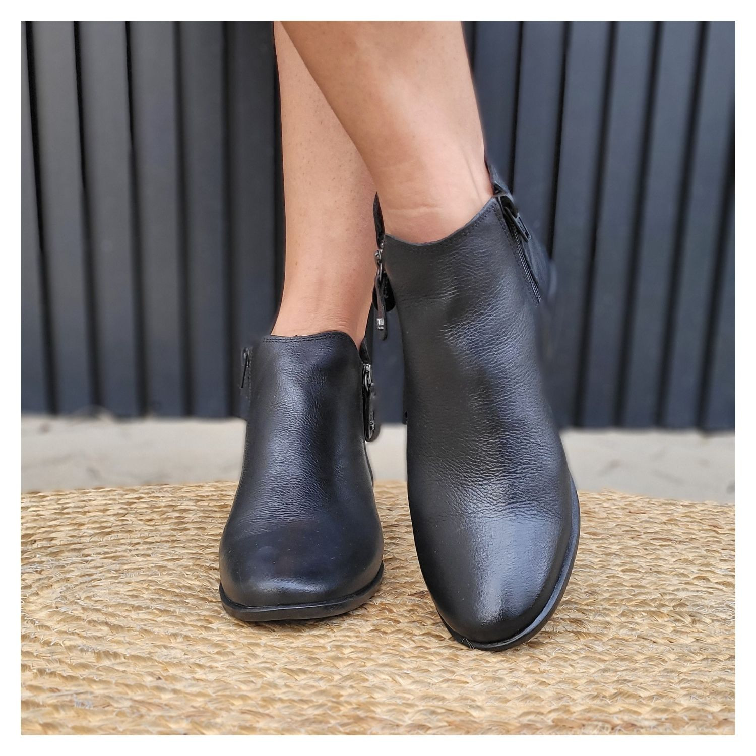 Bota em Couro Preto Lisa, Cano Baixo, Zíper Lateral e Fake.