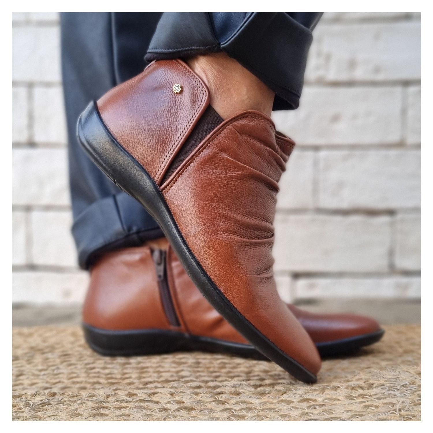 Bota em Couro Enrugado Caramelo Lisa, Cano Baixo Com Elástico E Zíper Lateral.