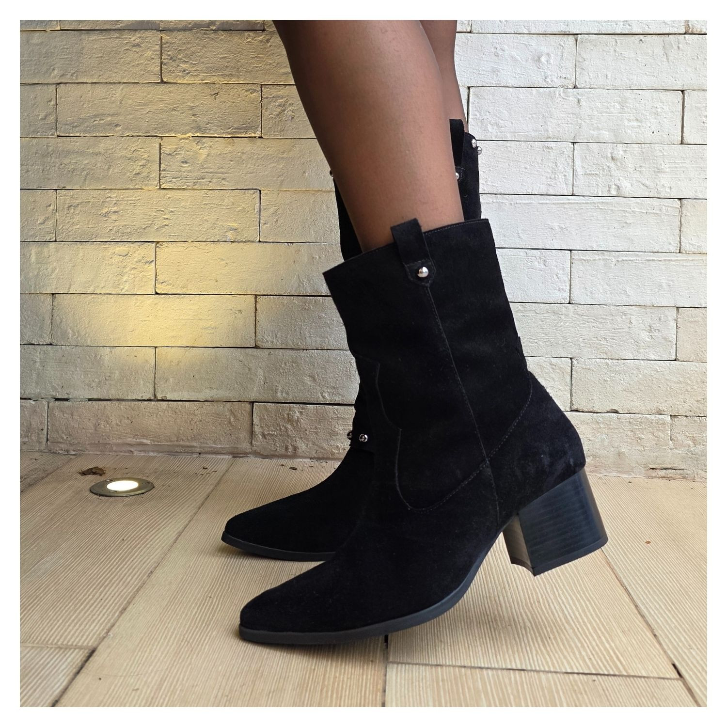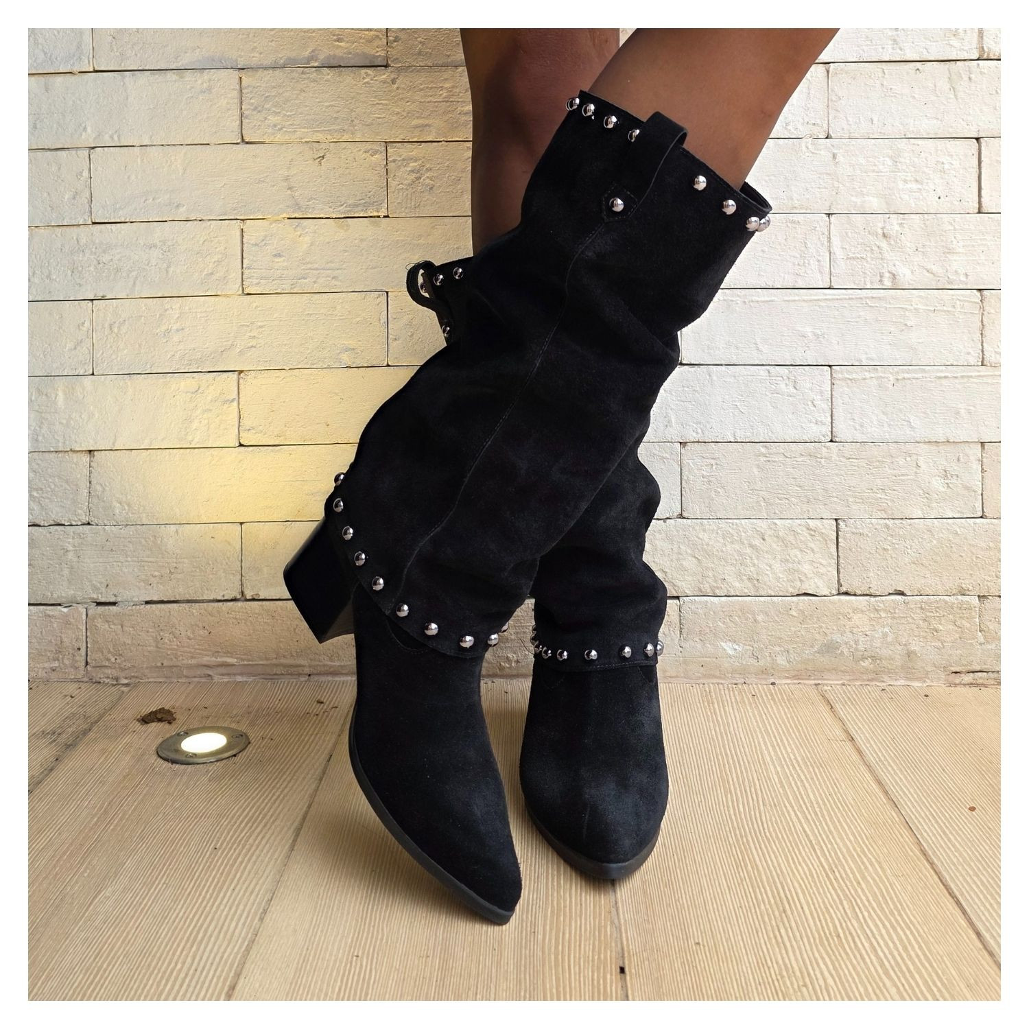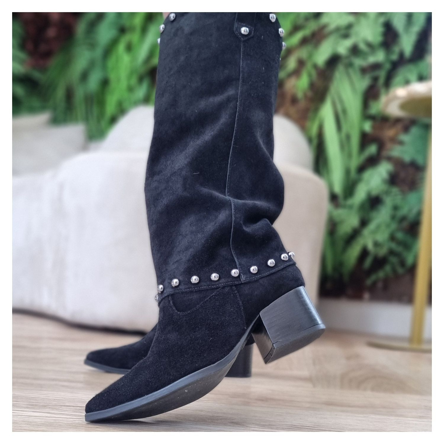 Bota Couro Nobuck Preto Cano Médio Liso E Salto Fachetado Preto Médio, Manta Removível Com Esferas Prata Em Volta.
