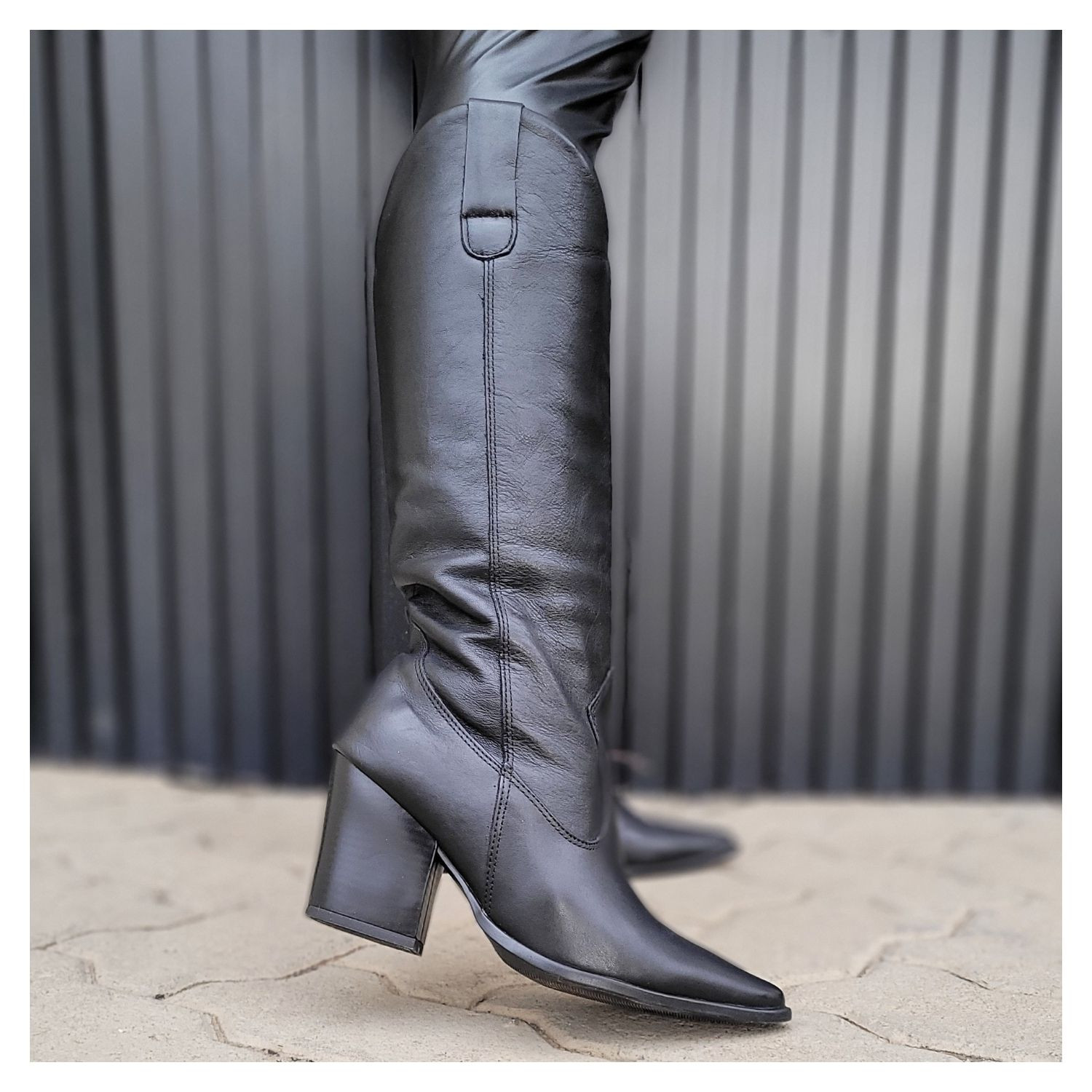 Bota em Couro Lisa Preta Cano Alto Bico Fino Salt Bloco Madeira.