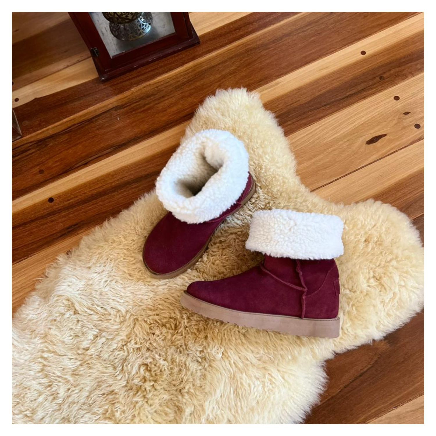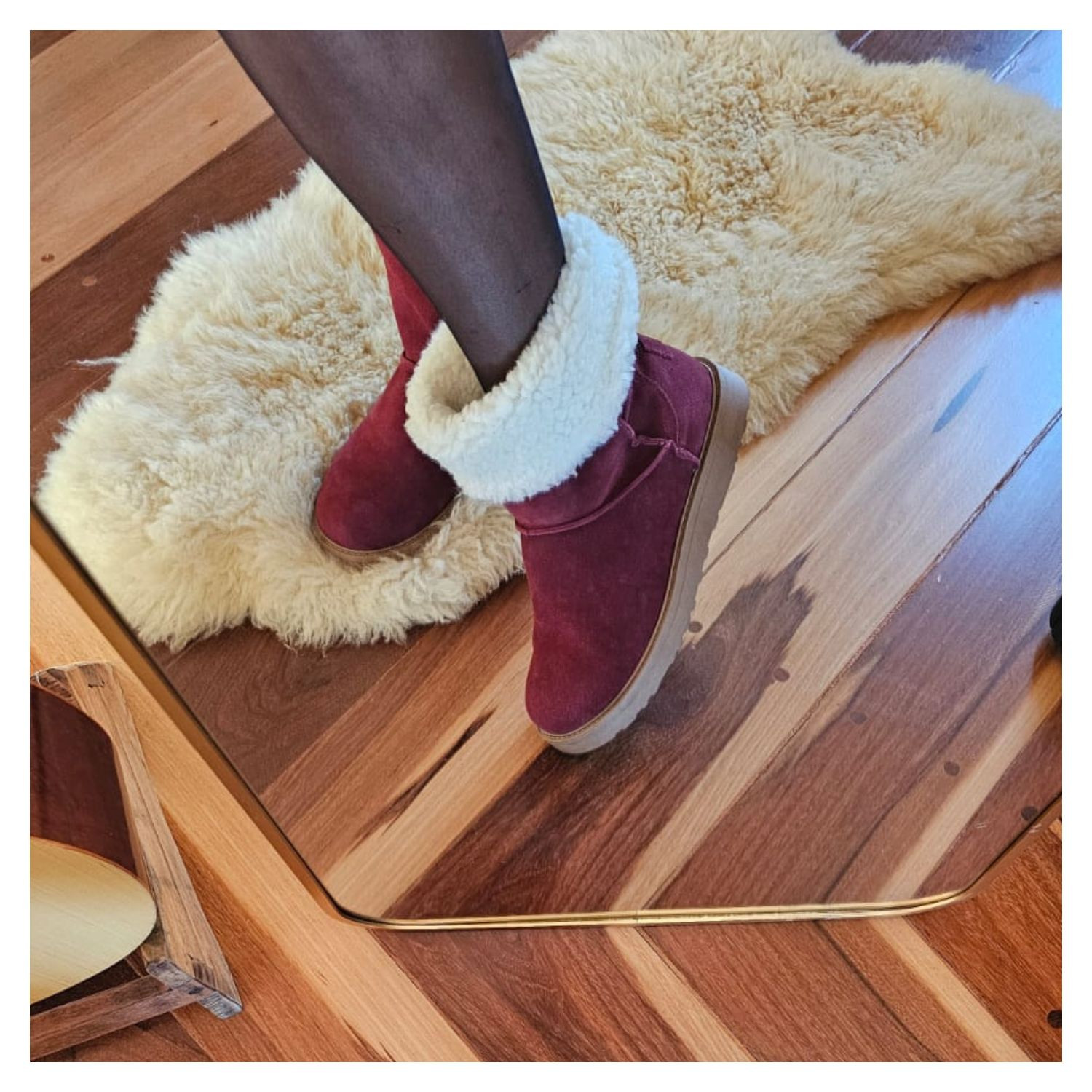 '*Bota em Nobuck Vinho, Dentro Pelo Branco Sola Reta Bege Emborrachada, Bico Redondo *A forma desse calçado esta pequena! *Atenção: Modelo Menor, Recomendamos Comprar Uma Numeração Maior*