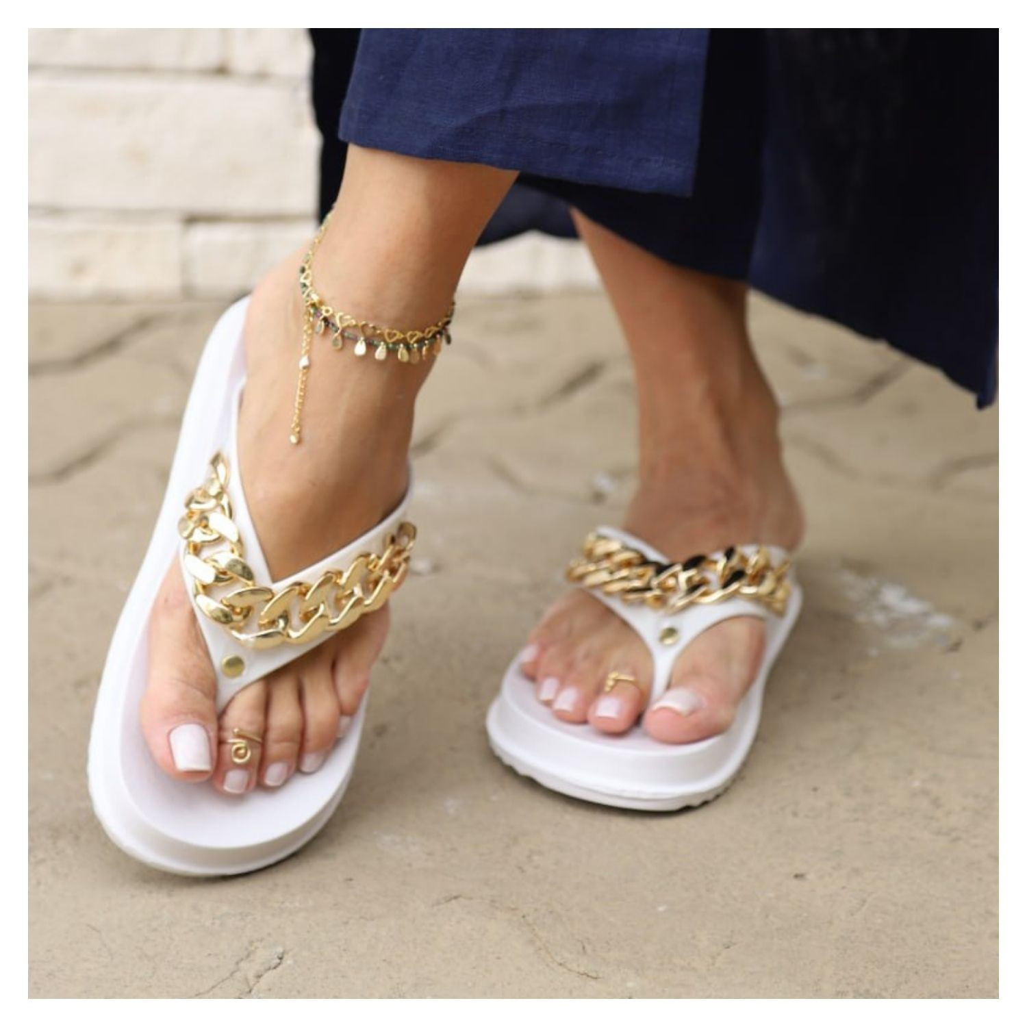 Chinelo em Eva Com Tira Grossa Emborrachada Com Maxi Elos Dourados - Cor Branco.