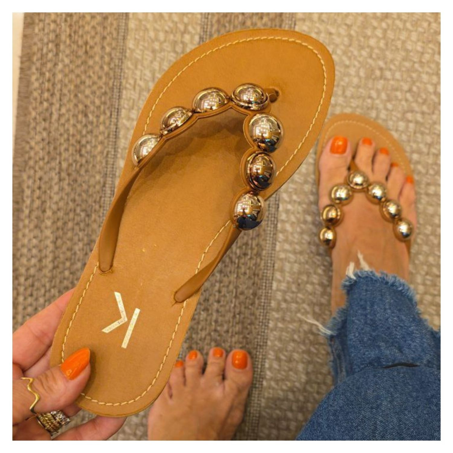 Chinelo Caramelo Sola Emborrachada, Tira De Dedo Com Esferas Acrilicas Bronze Metalizadas Lisas.