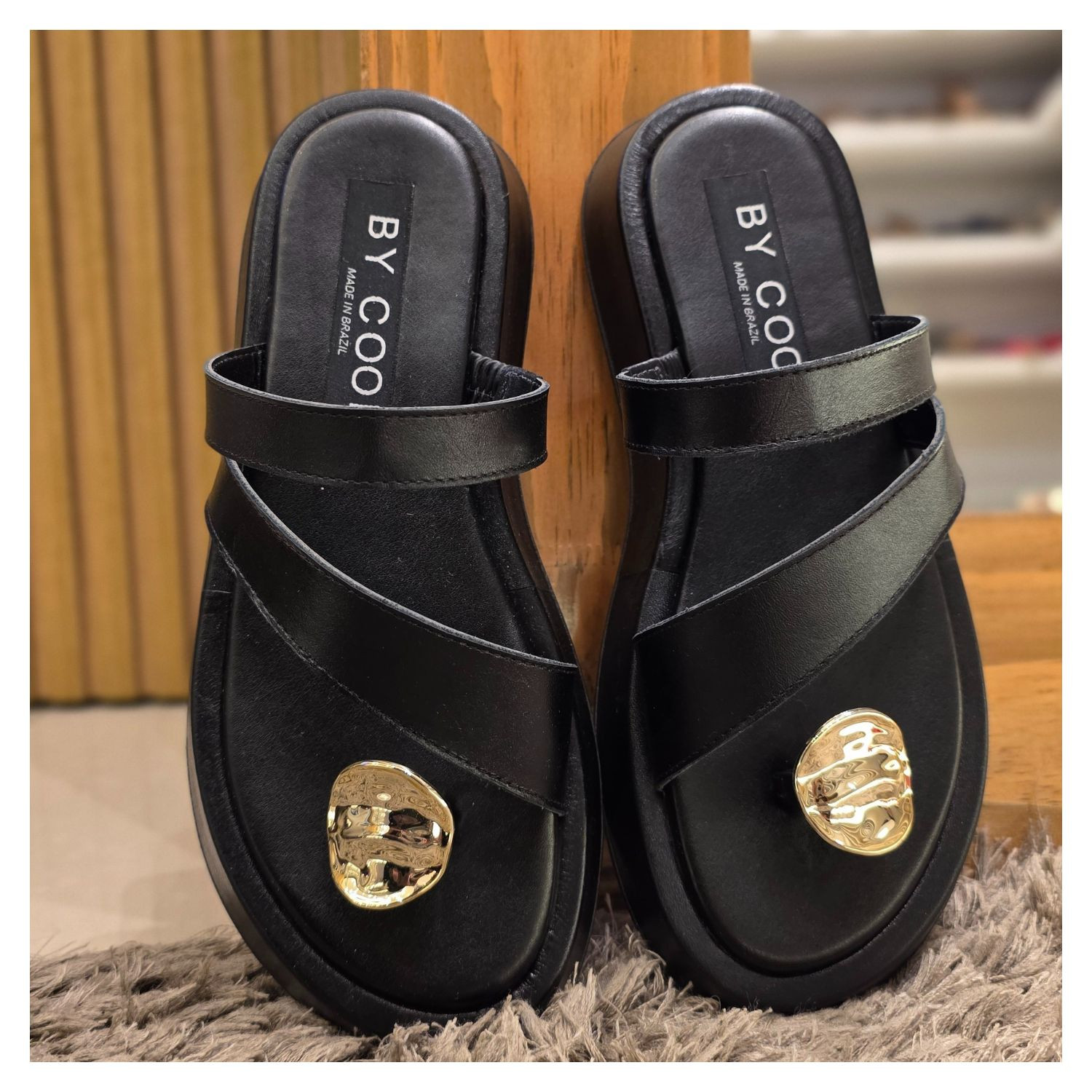 Flat em Couro Preto, Tiras Com Chapa no Meio.
