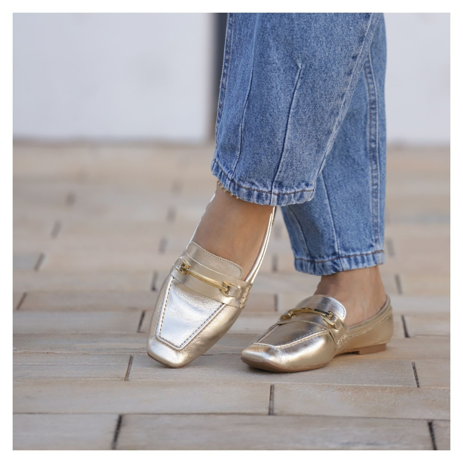 Loafer em Couro Dourado Metalizado, Bridão Bastão Dourado e Frente Reta.