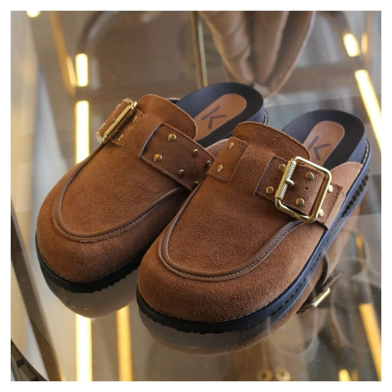 Clog Mule Nobuck Caramelo, Detalhe Tira Com Fivela Dourada e Mini Esferas Metalizadas.