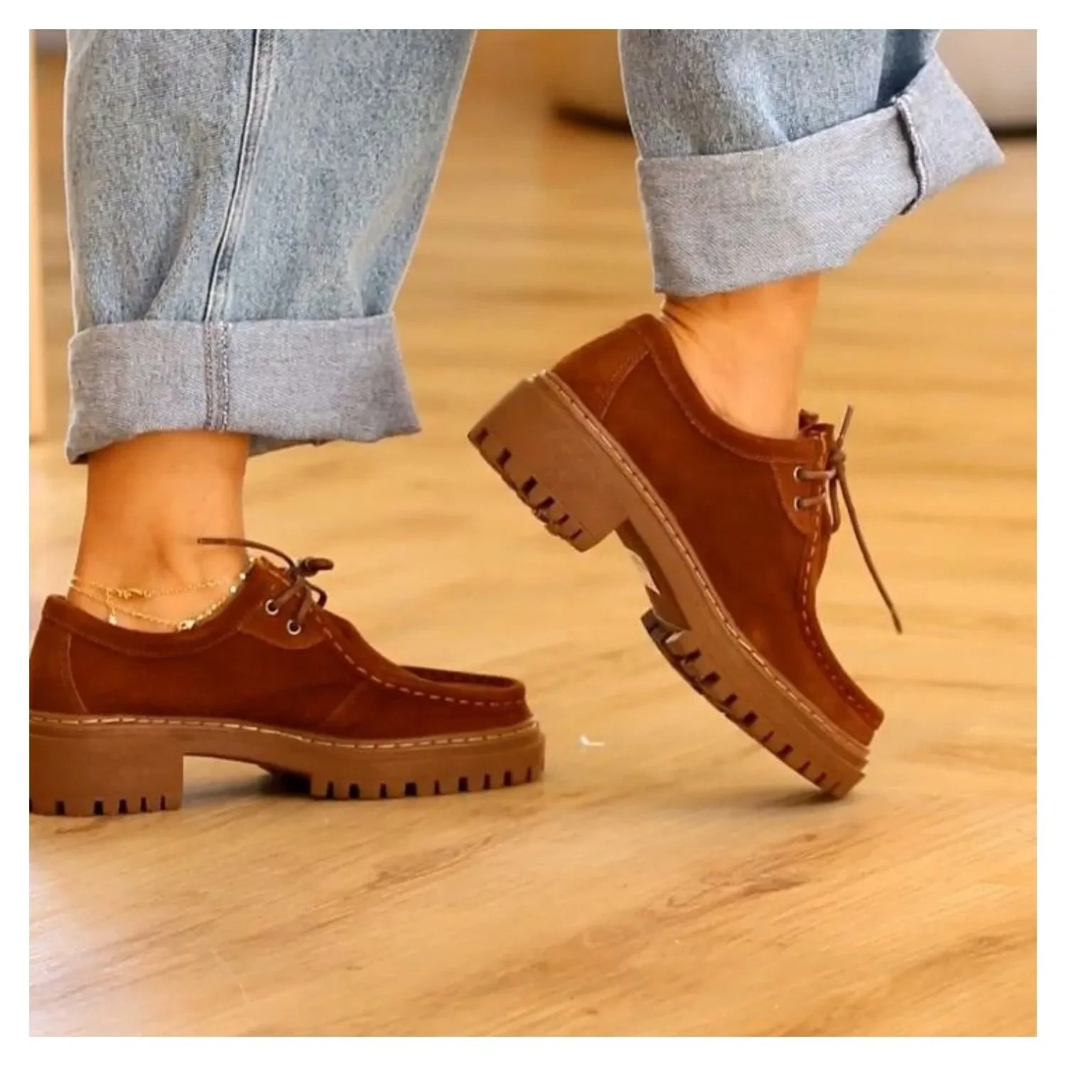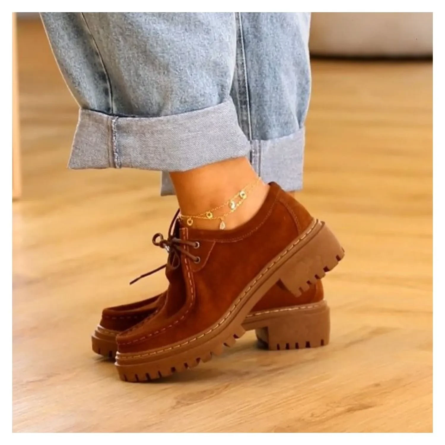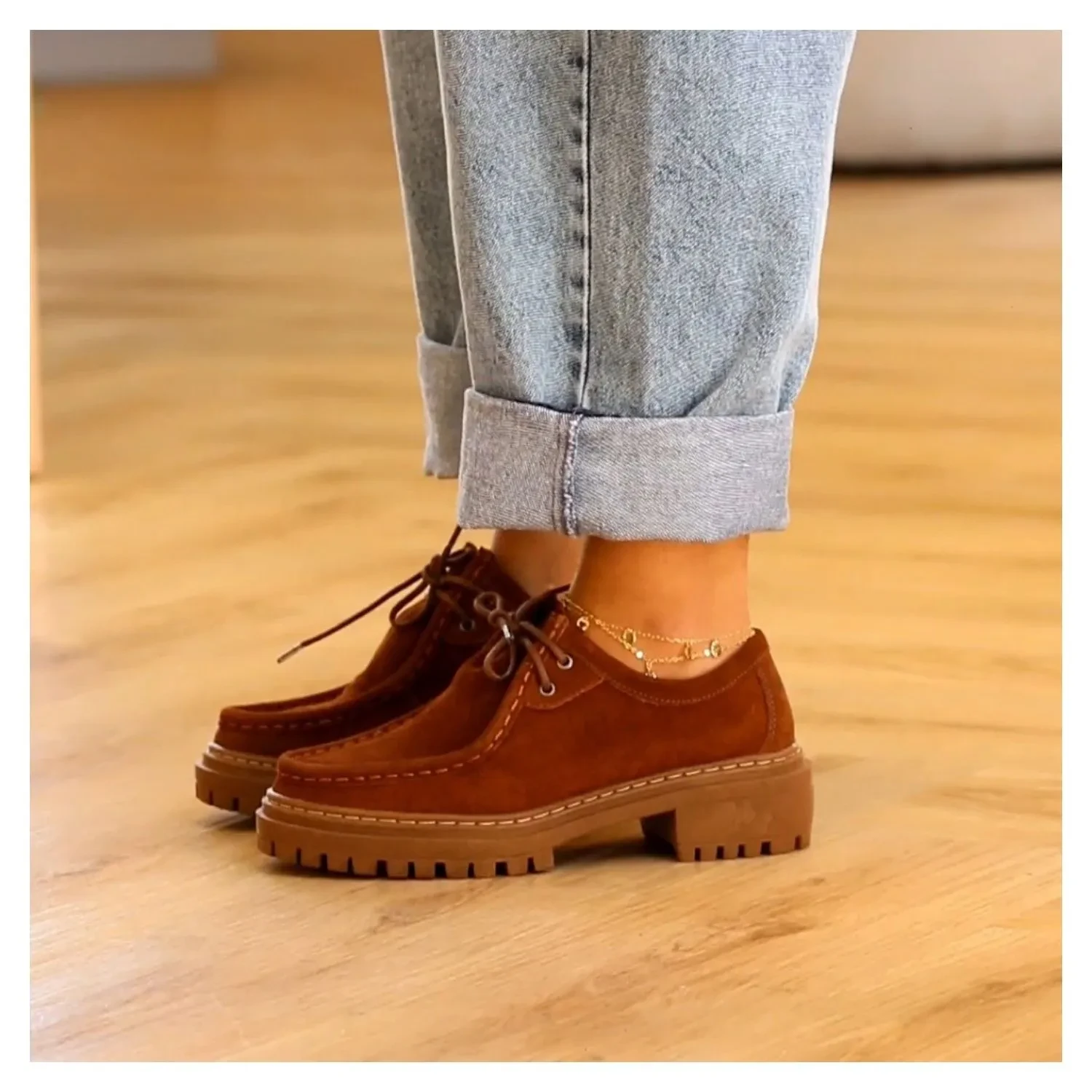 Mocassim Oxford em Couro Suede Liso Caramelo, Salto Tratorado e Amarração Por Cadarço.