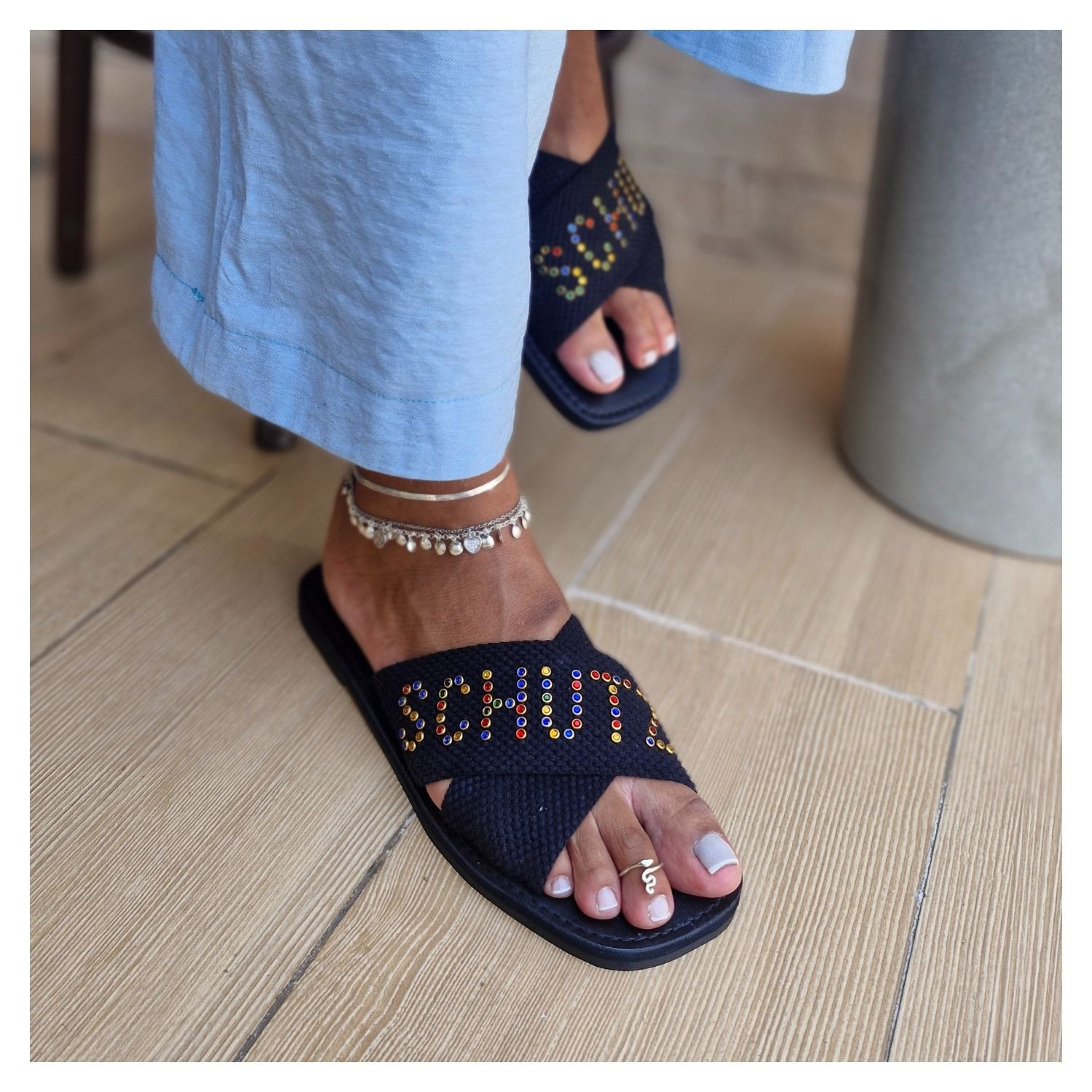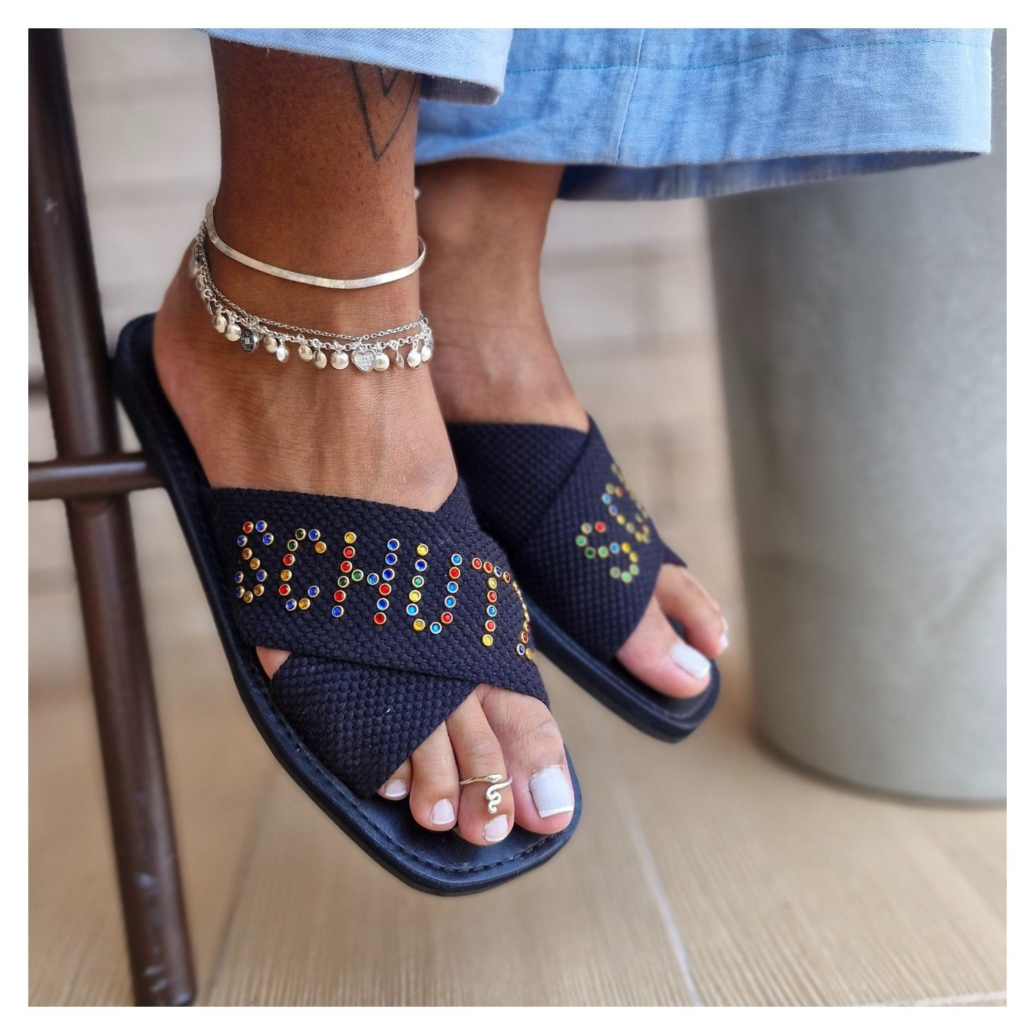 Rasteira Preta Cabedal Tecido Trama em X, Pedras Coloridas Logo Schutz