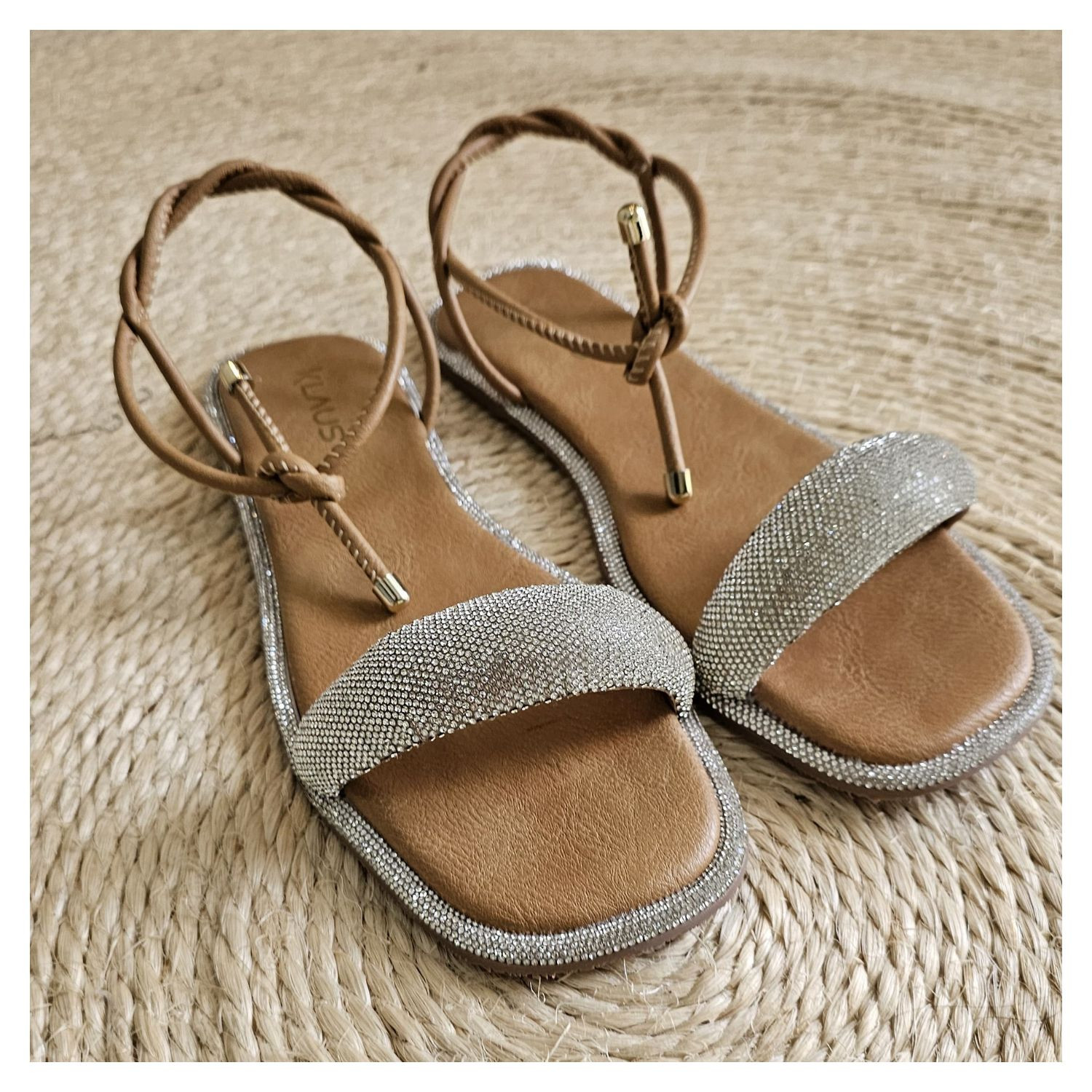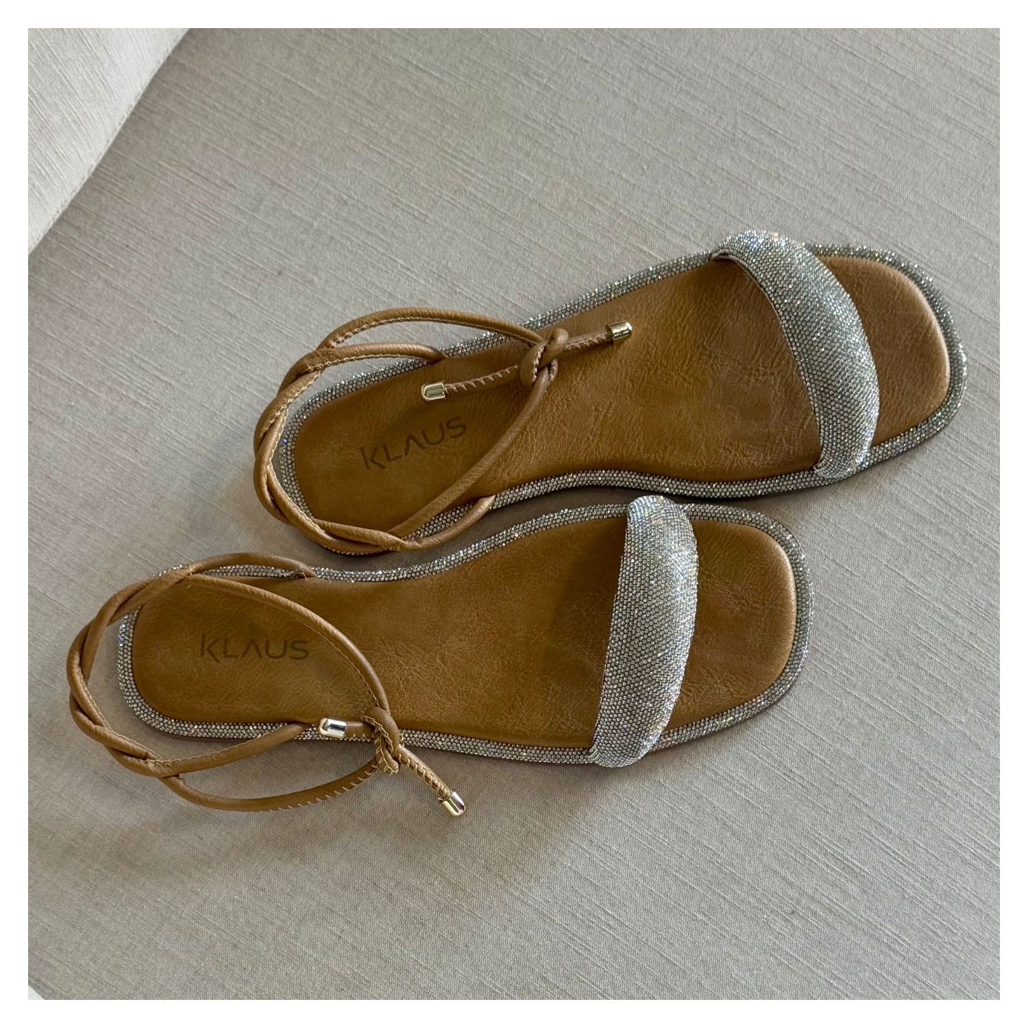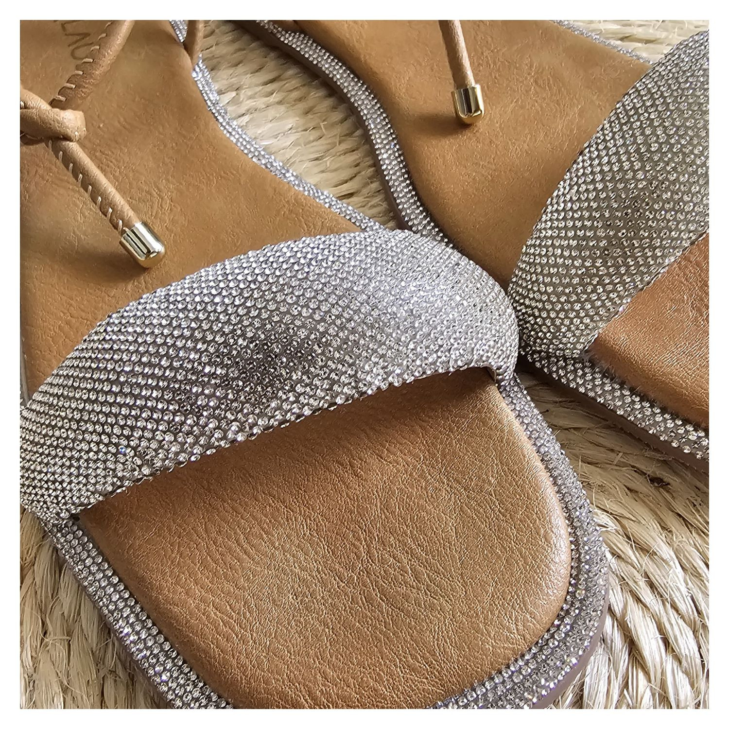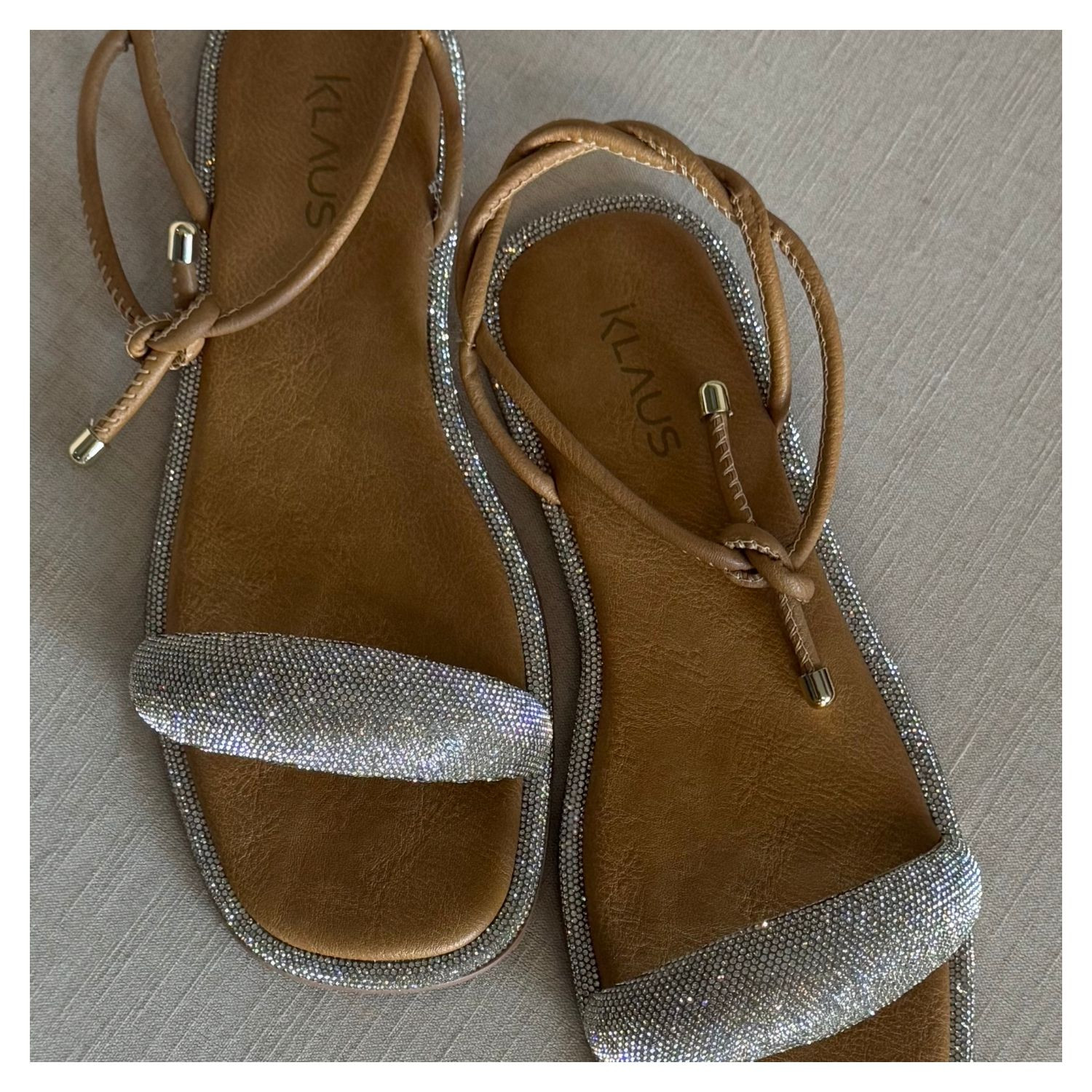 Rasteira em Couro Caramelo, Tira Grossa no Cabedal Com Strass, Tira de Amarrar no Tornozelo.