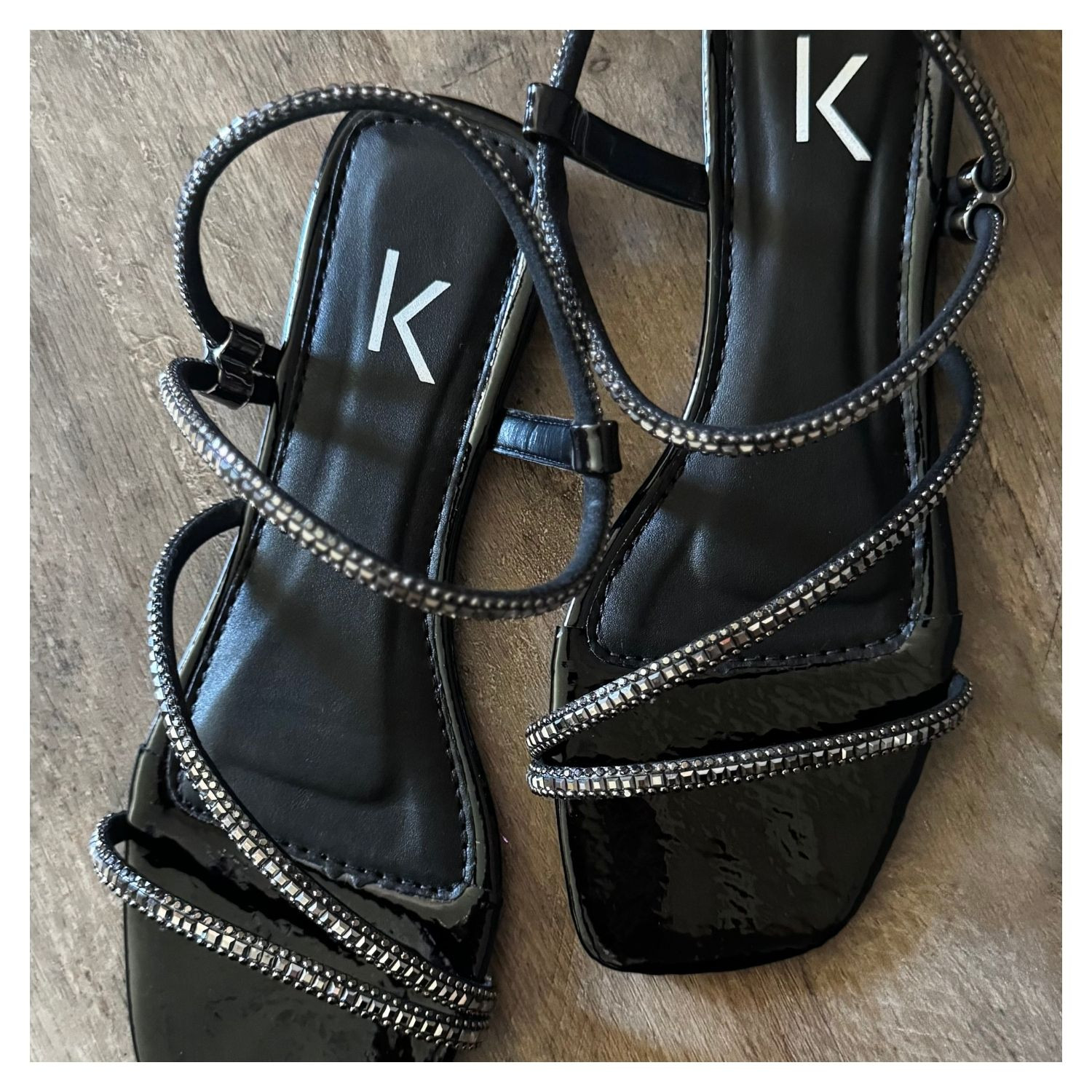 Rasteira Couro Ecológico Preta, Tiras Finas Em Z Com Strass Quadrados Ônix, Ajuste No Tornozelo, Total Black.