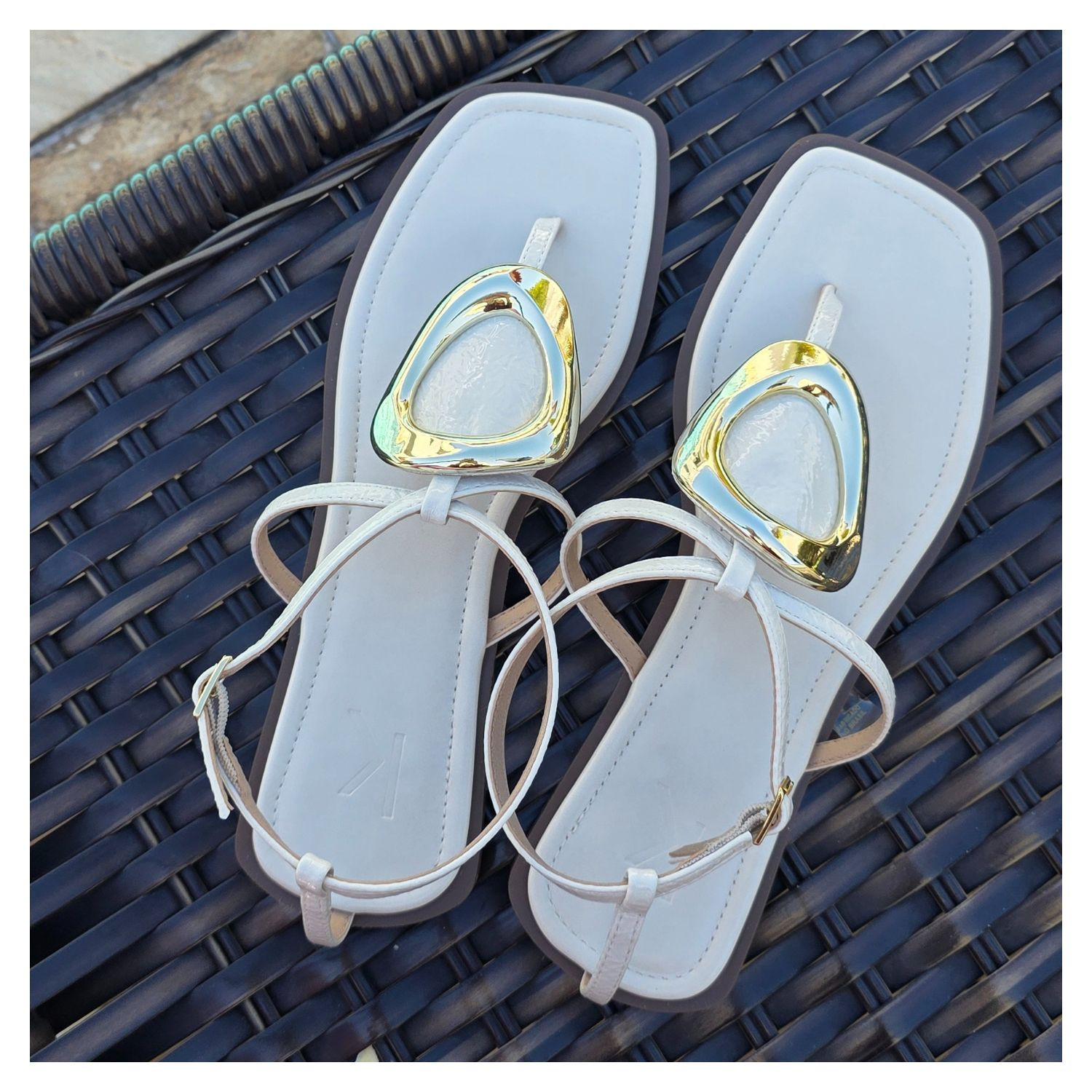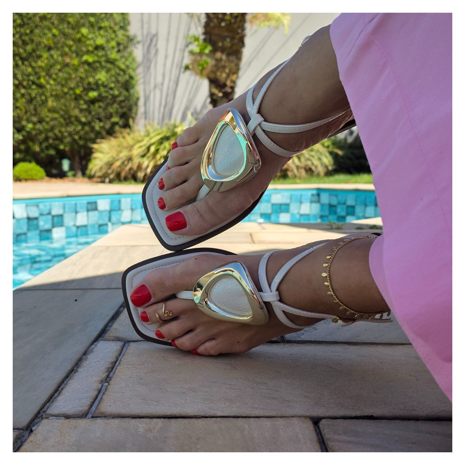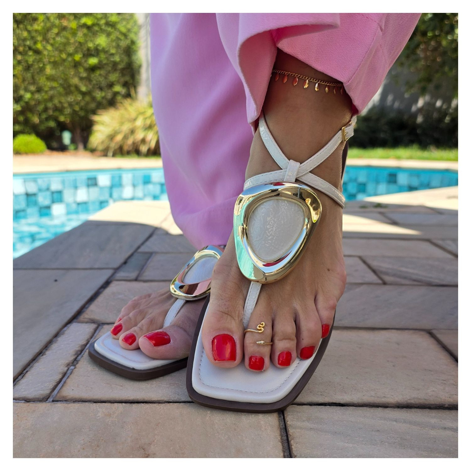 Rasteira Off White Verniz, Tiras Finas, Cabedal Com Maxi Chapa Oval Dourada, Sola Flat Frente Reta.