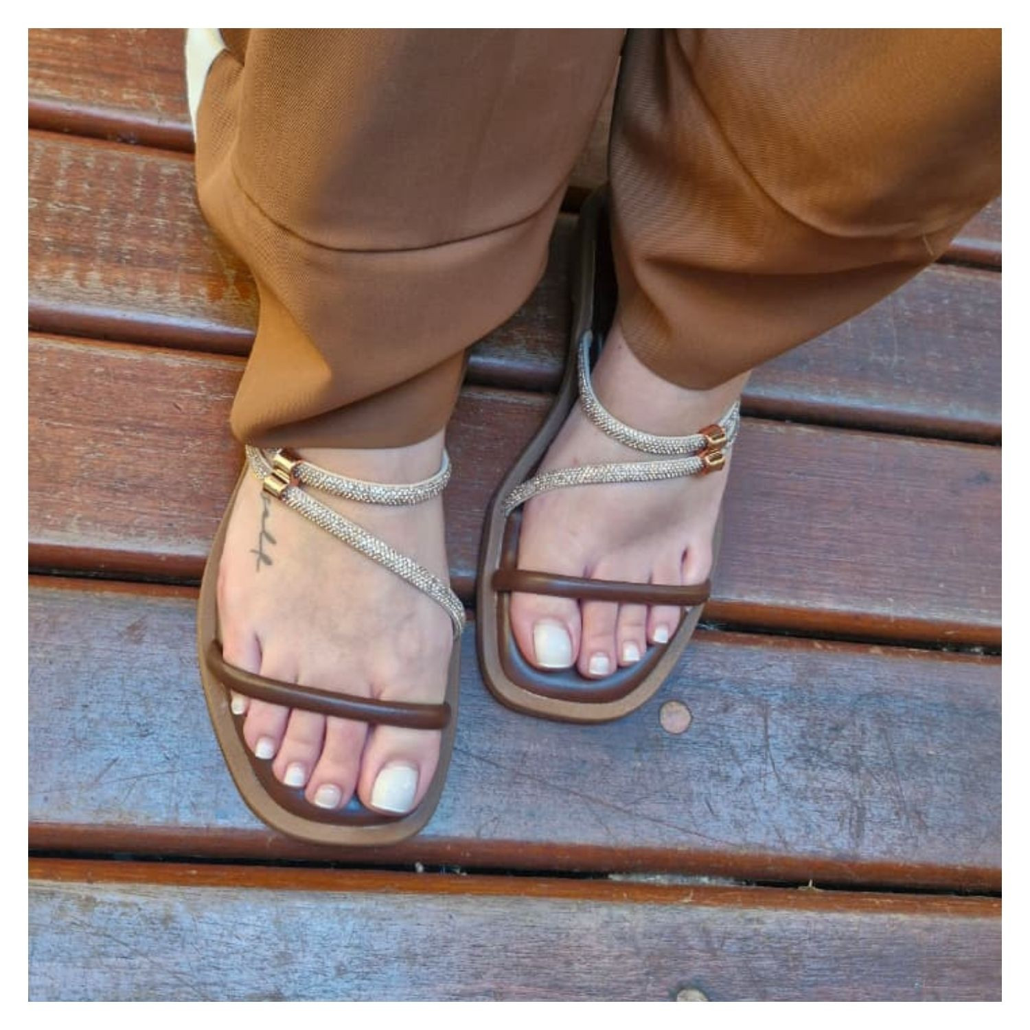 Rasteira Marrom e Caramelo, Tiras Finas Lisas e Com Stras, Sola Confy.