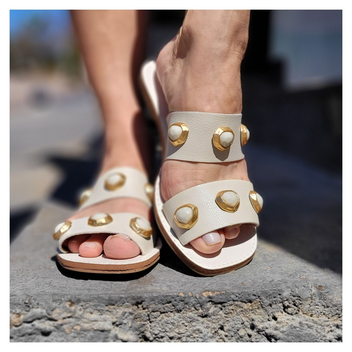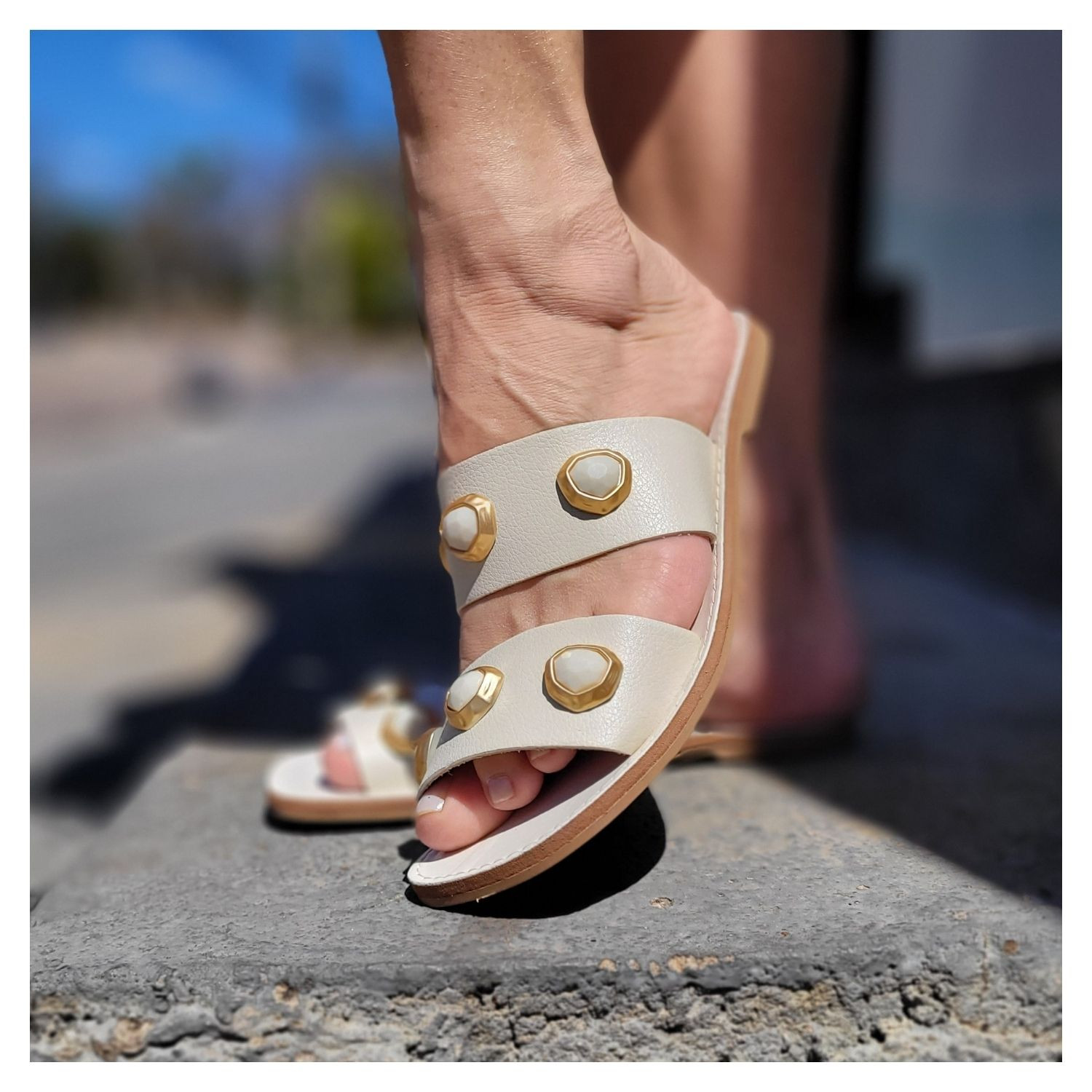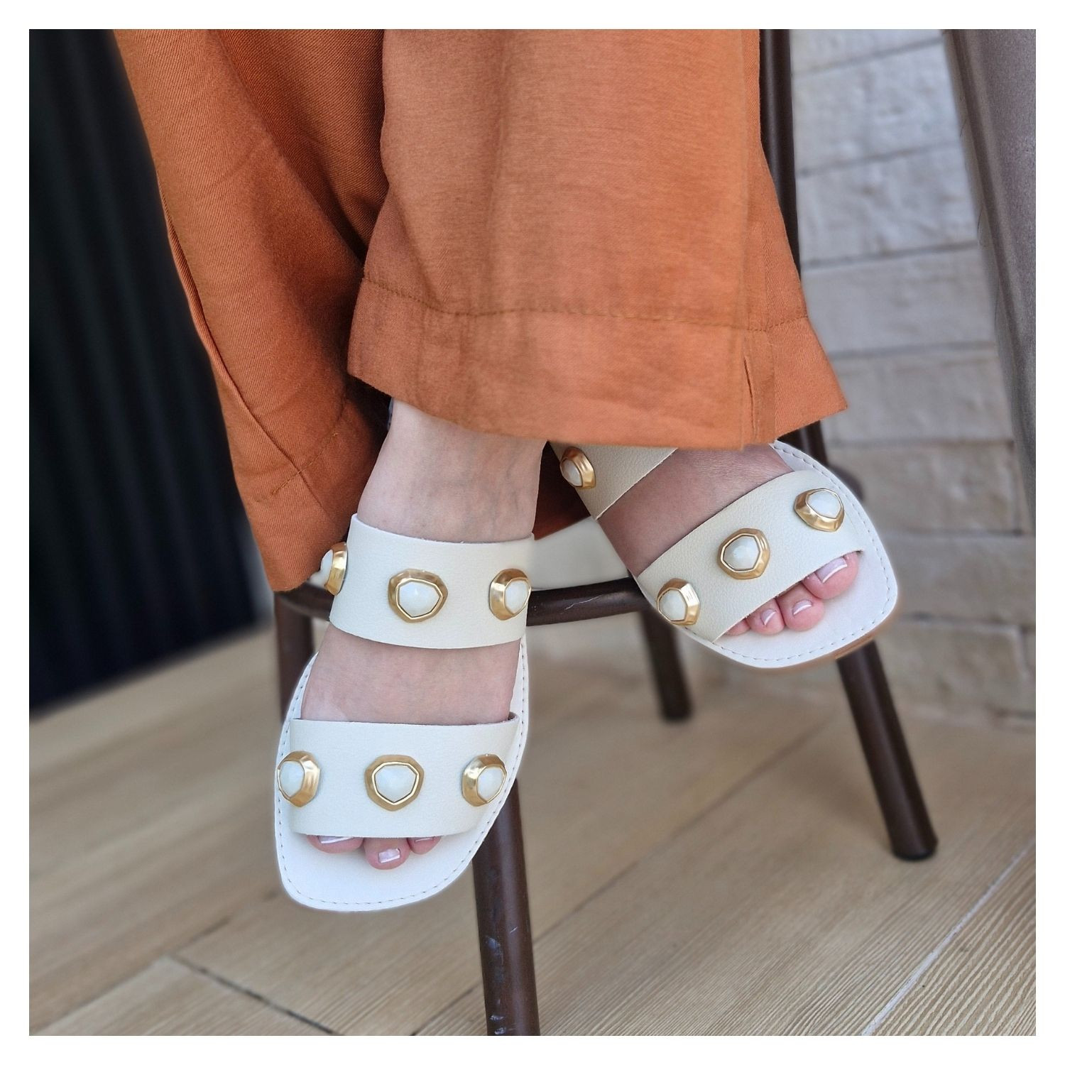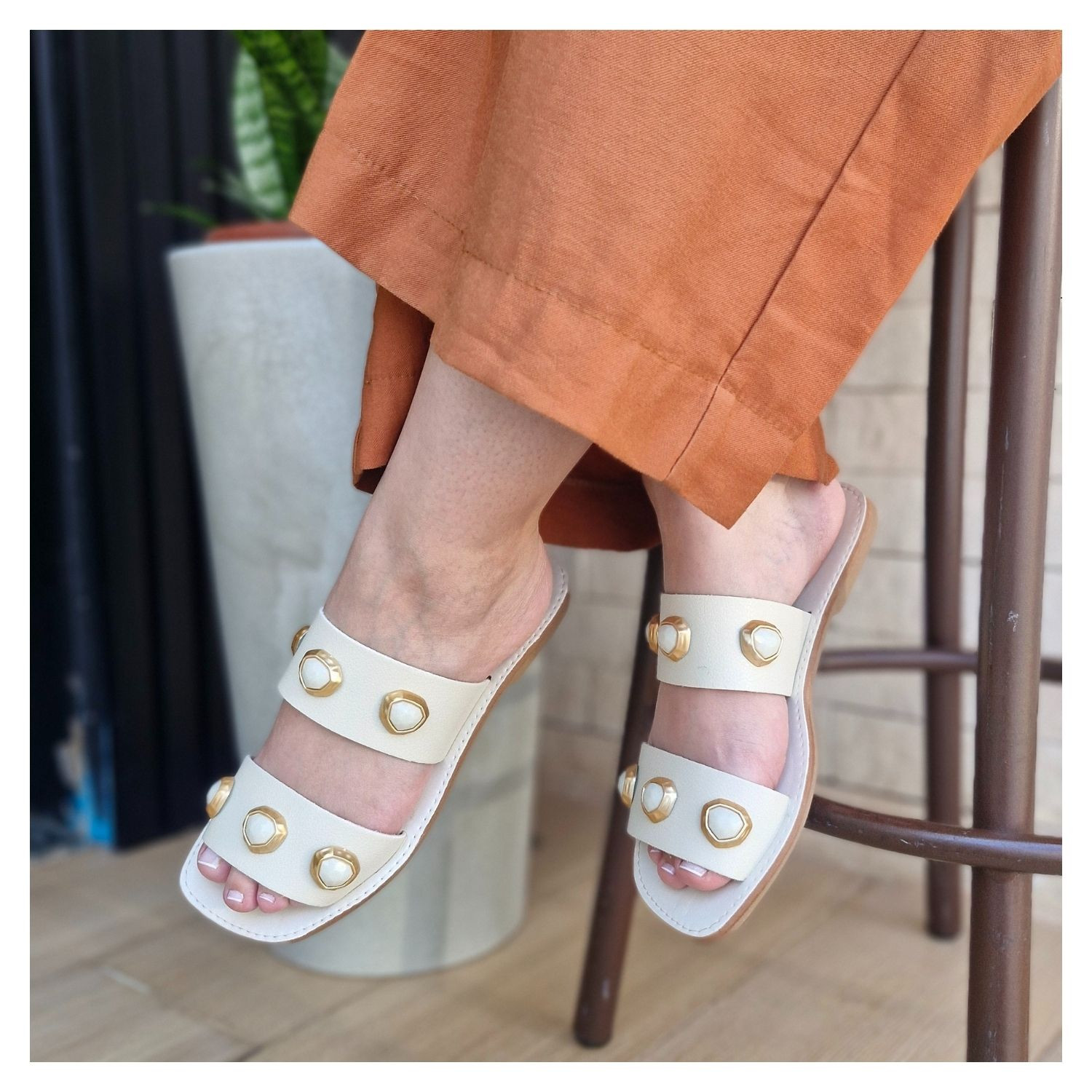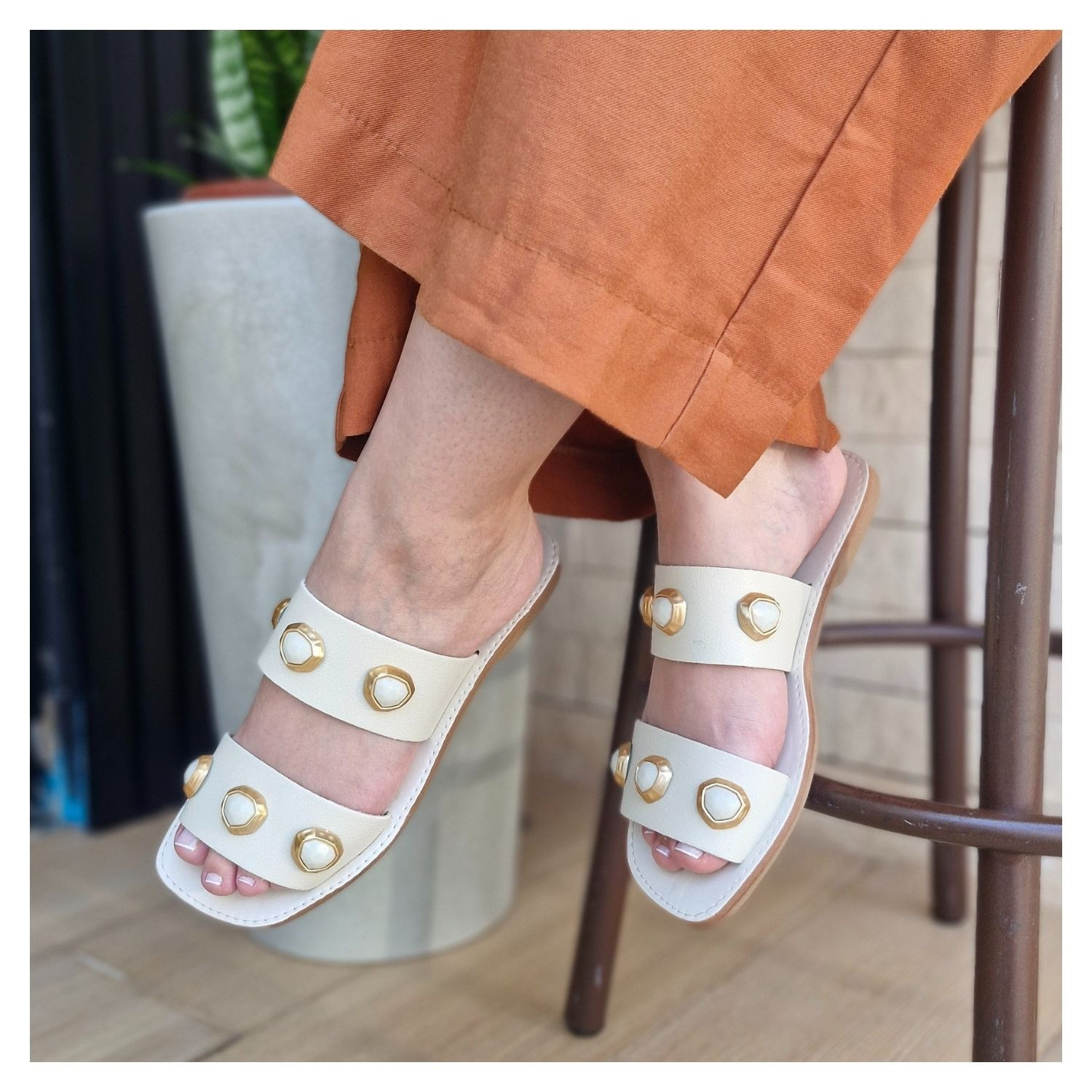 Rasteira Duas Tiras Largas Off White Com Pedras na Tira e Bordas Douradas.