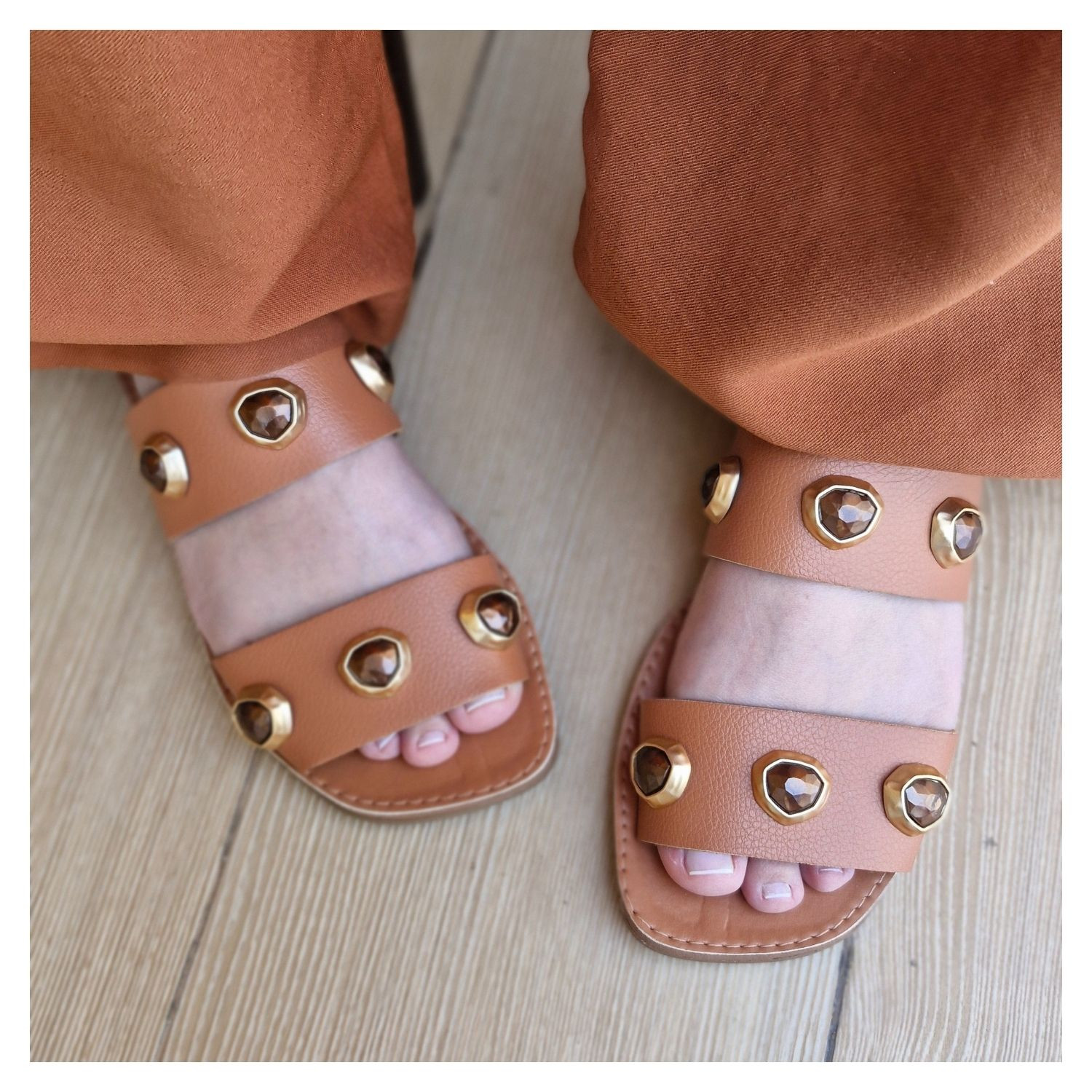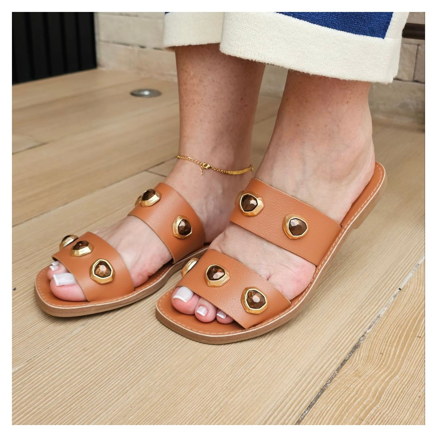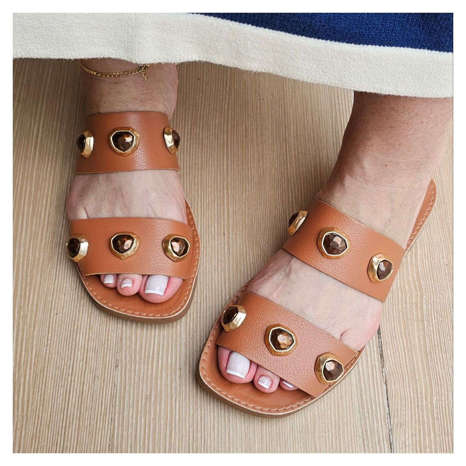 Rasteira Duas Tiras Largas Caramelo Com Pedras na Tira e Bordas Douradas.