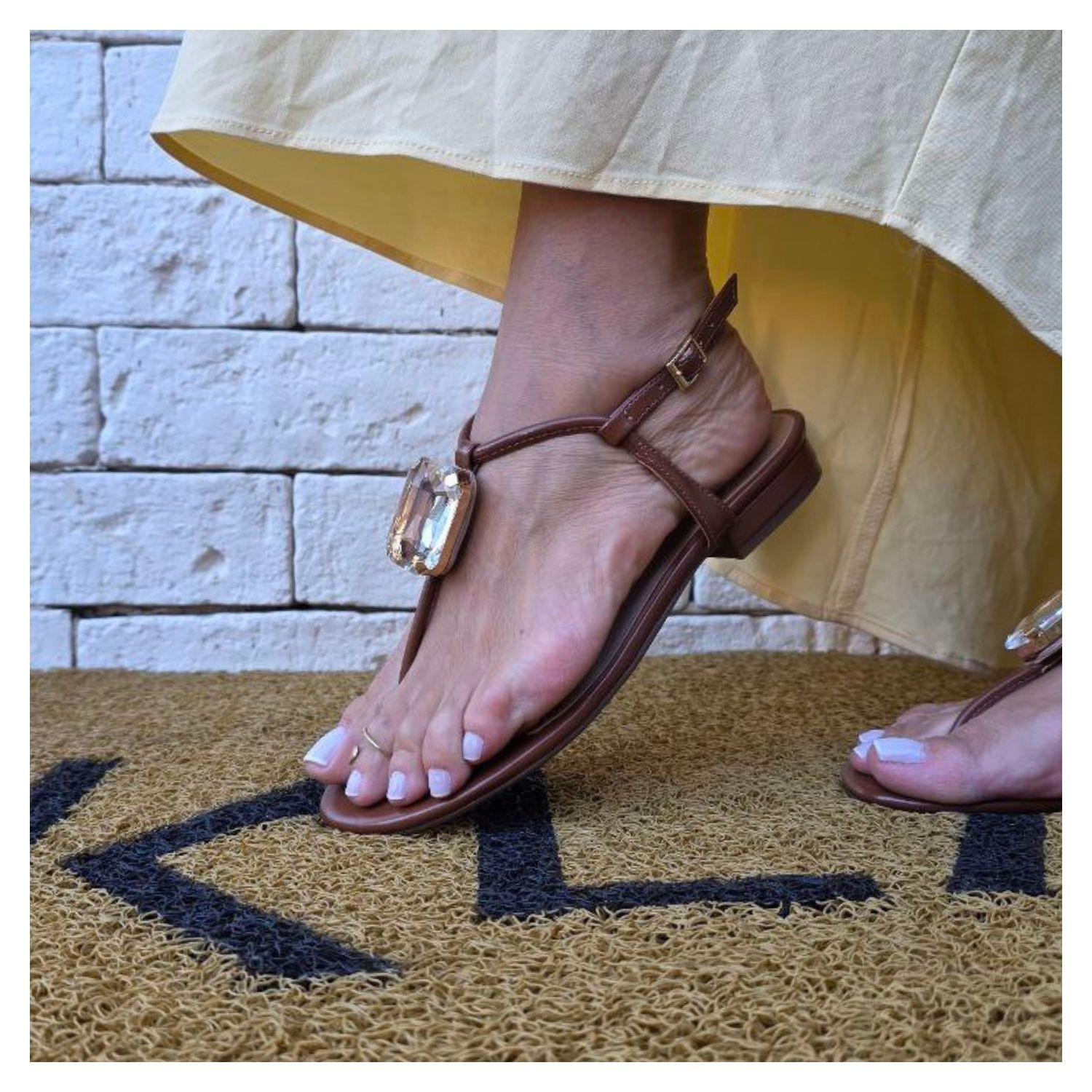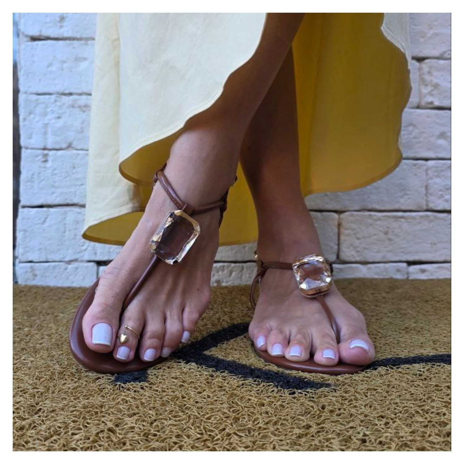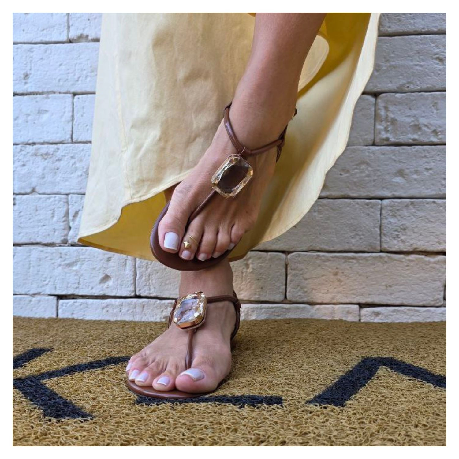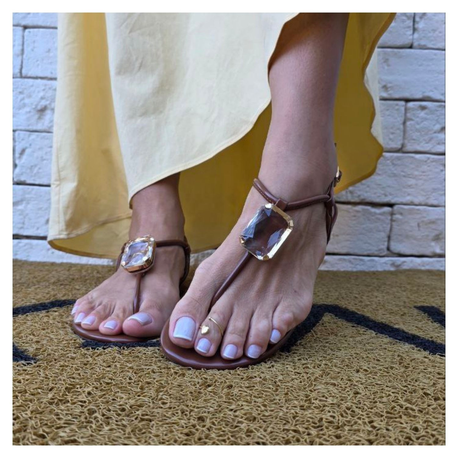 Rasteira Marrom Tira Fina, Max Pedras Retangular Metalizada, Saltinho.