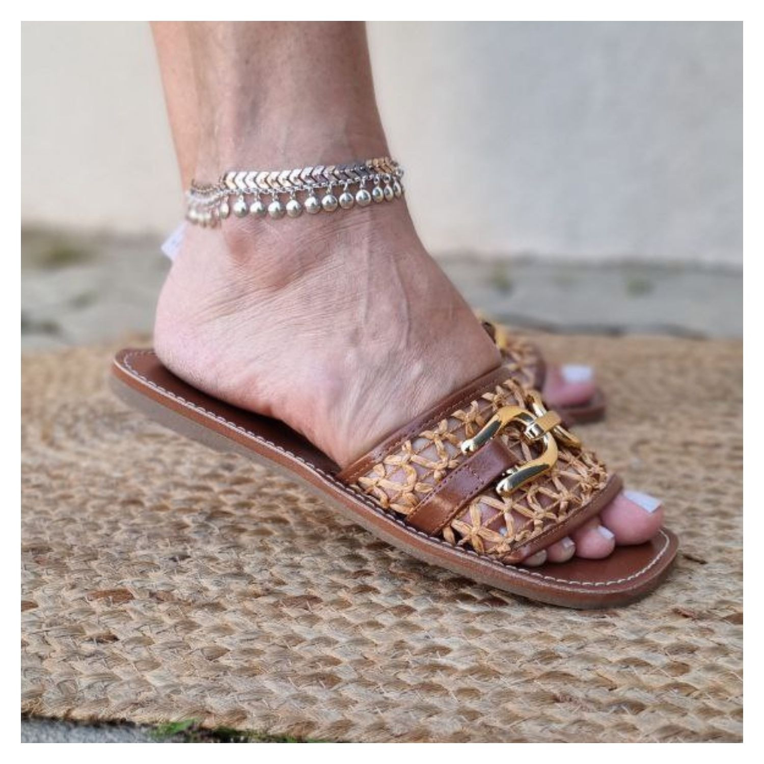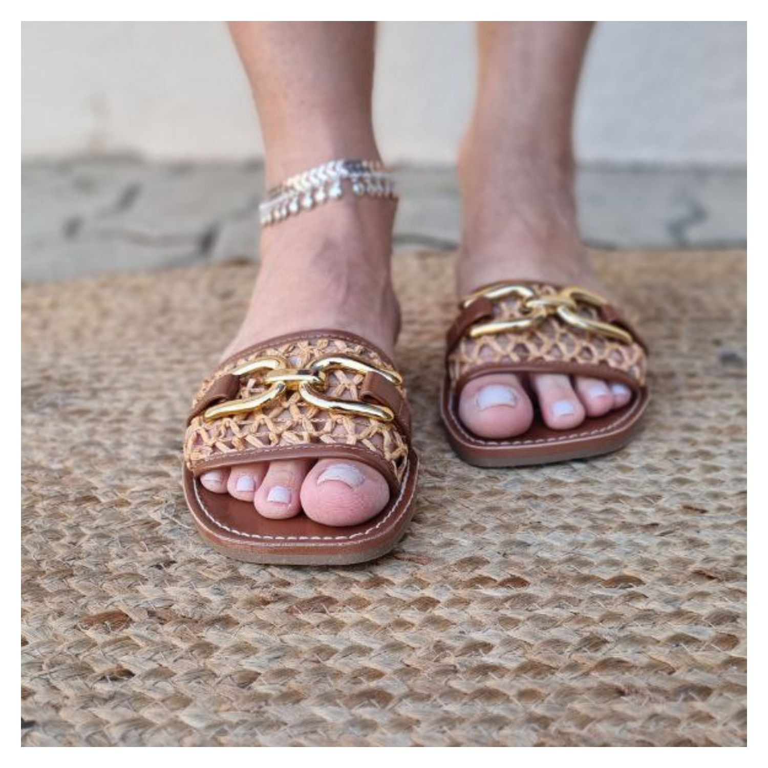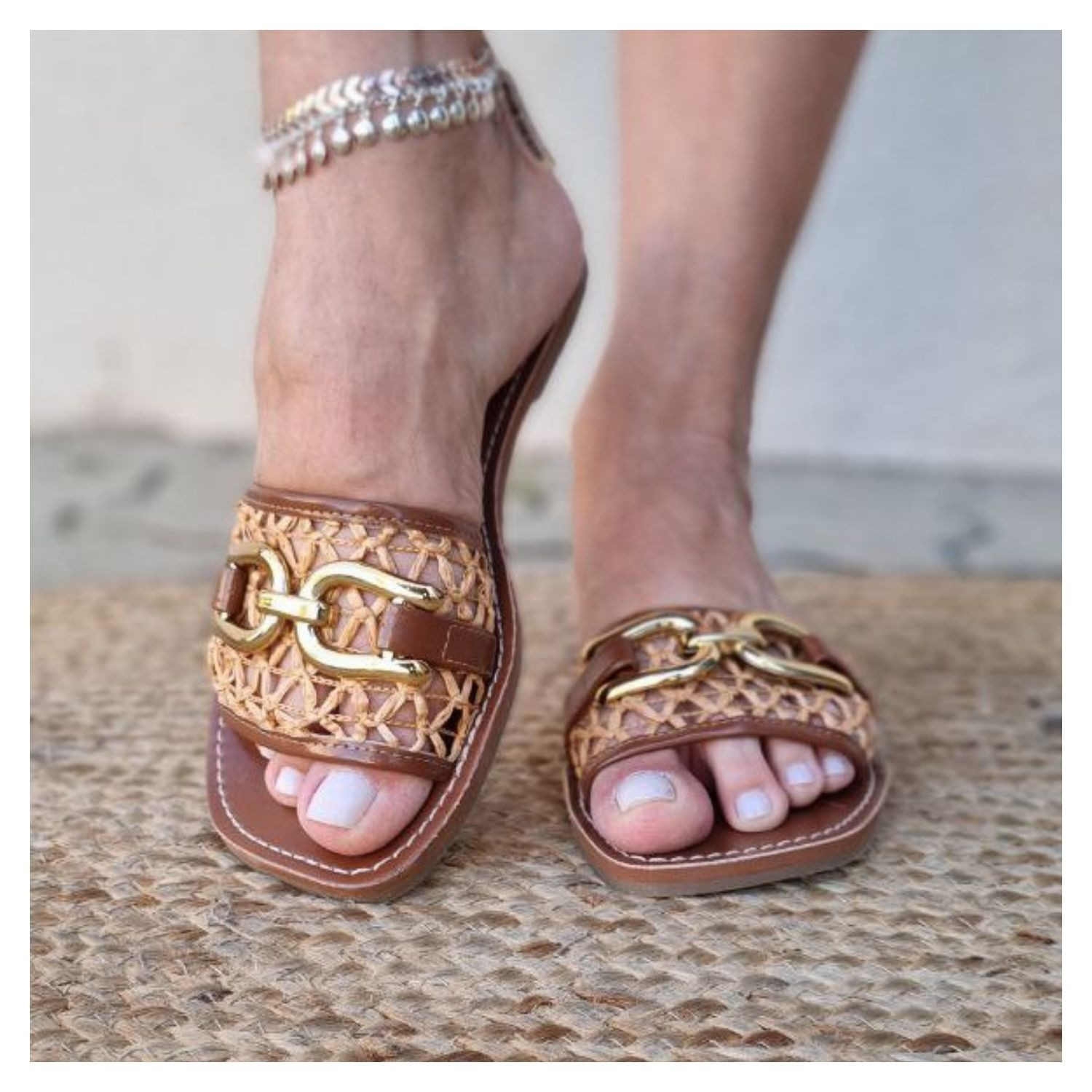 Rasteira Marrom Tira Grossa Cabedal Toda Palha Tramada, Max Bridão Dourado.