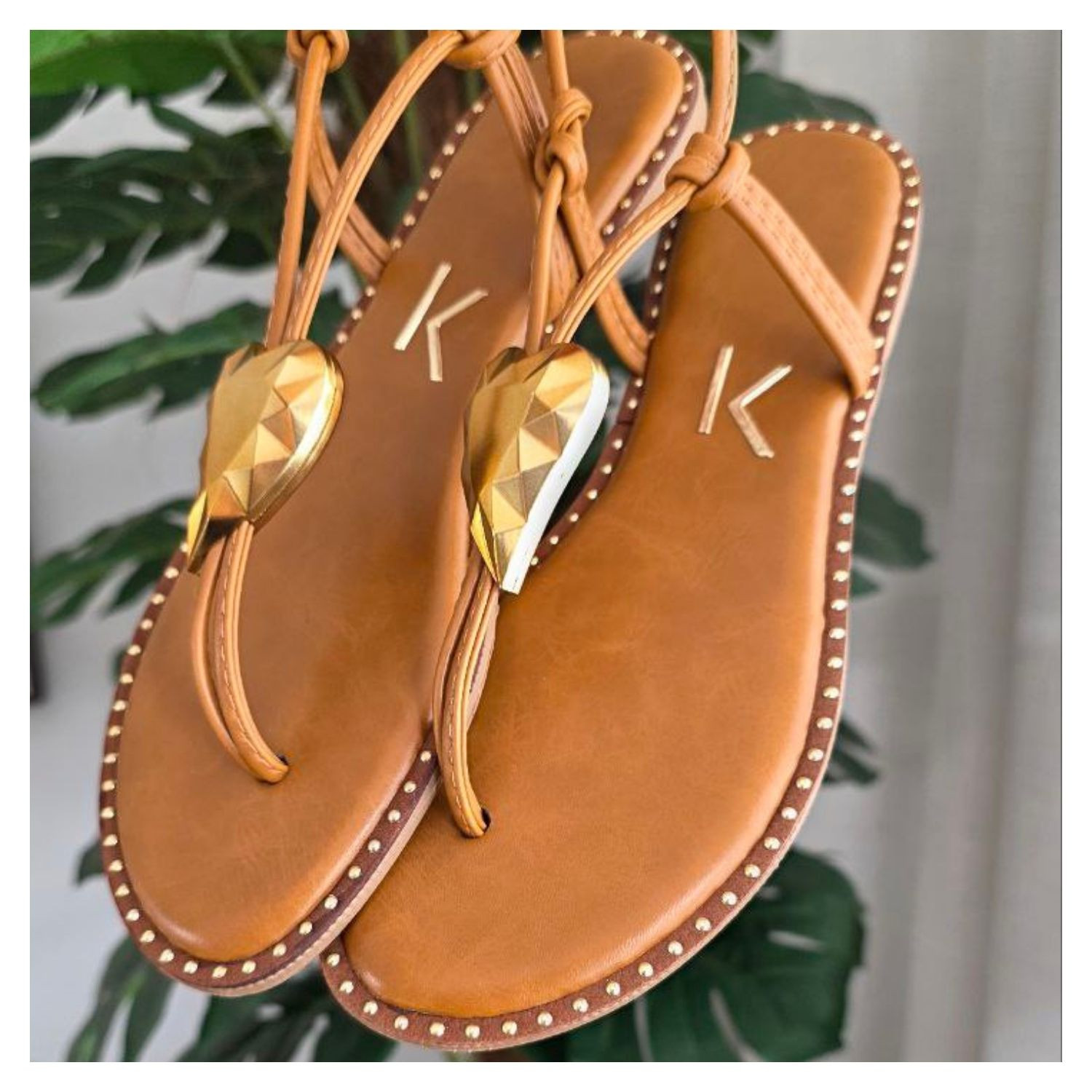 Rasteira Marrom Caramelo Tira Fina Com Coração Dourado Martelado, Borda Mini Esferas.