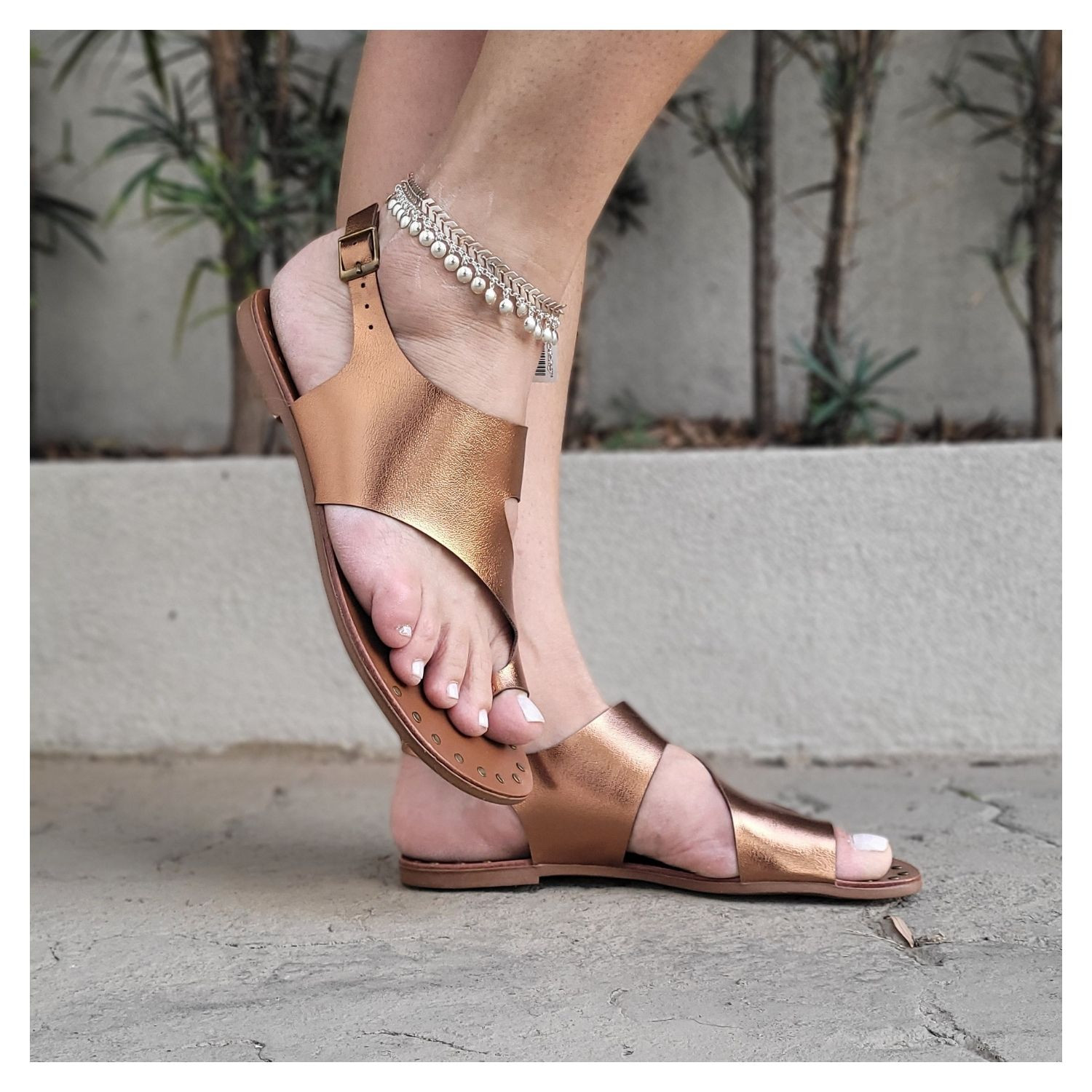 Rasteira Cabedal Recortes a Laser Liso Bronze Metalizado, Sola Flat Esferas na Borda.