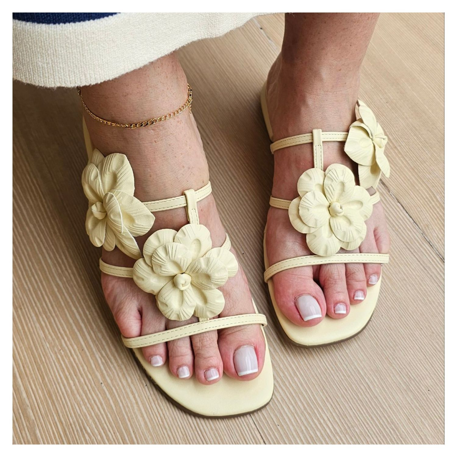 Rasteira Toda Amarelo Manteiga, Saltinho Quadrado, Cabedal Com Tiras Finas e Duas Flores Aplicação.
