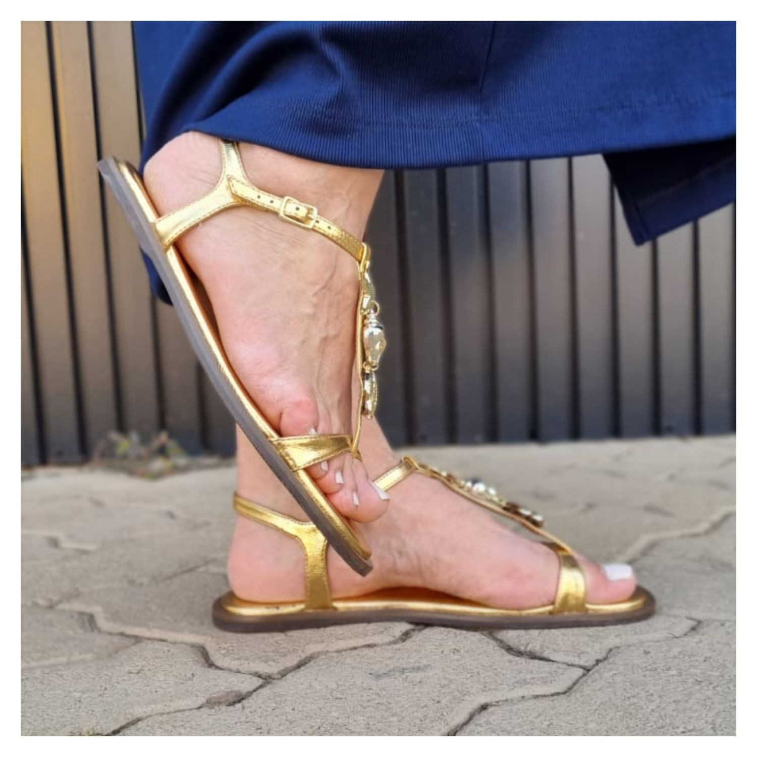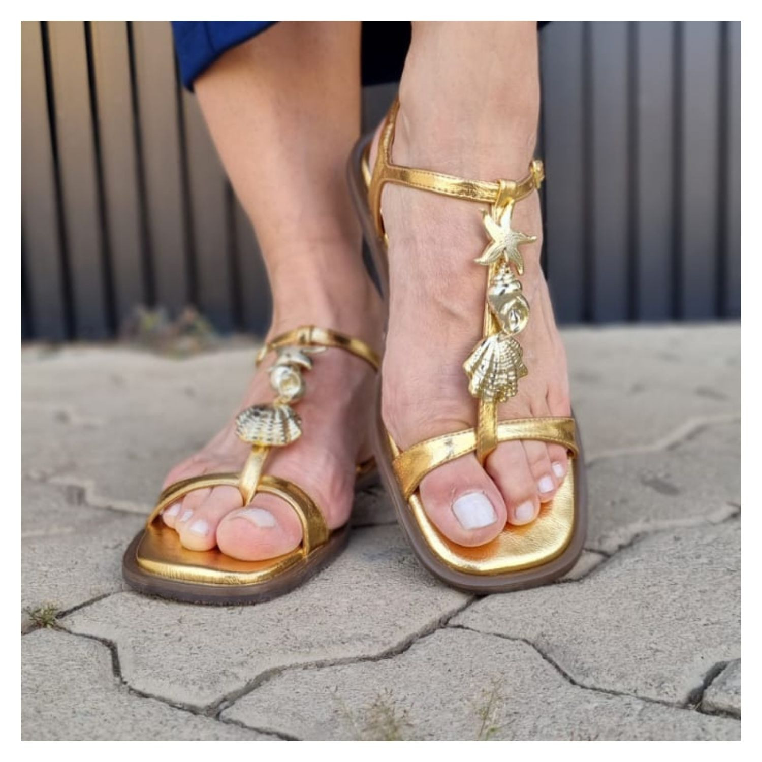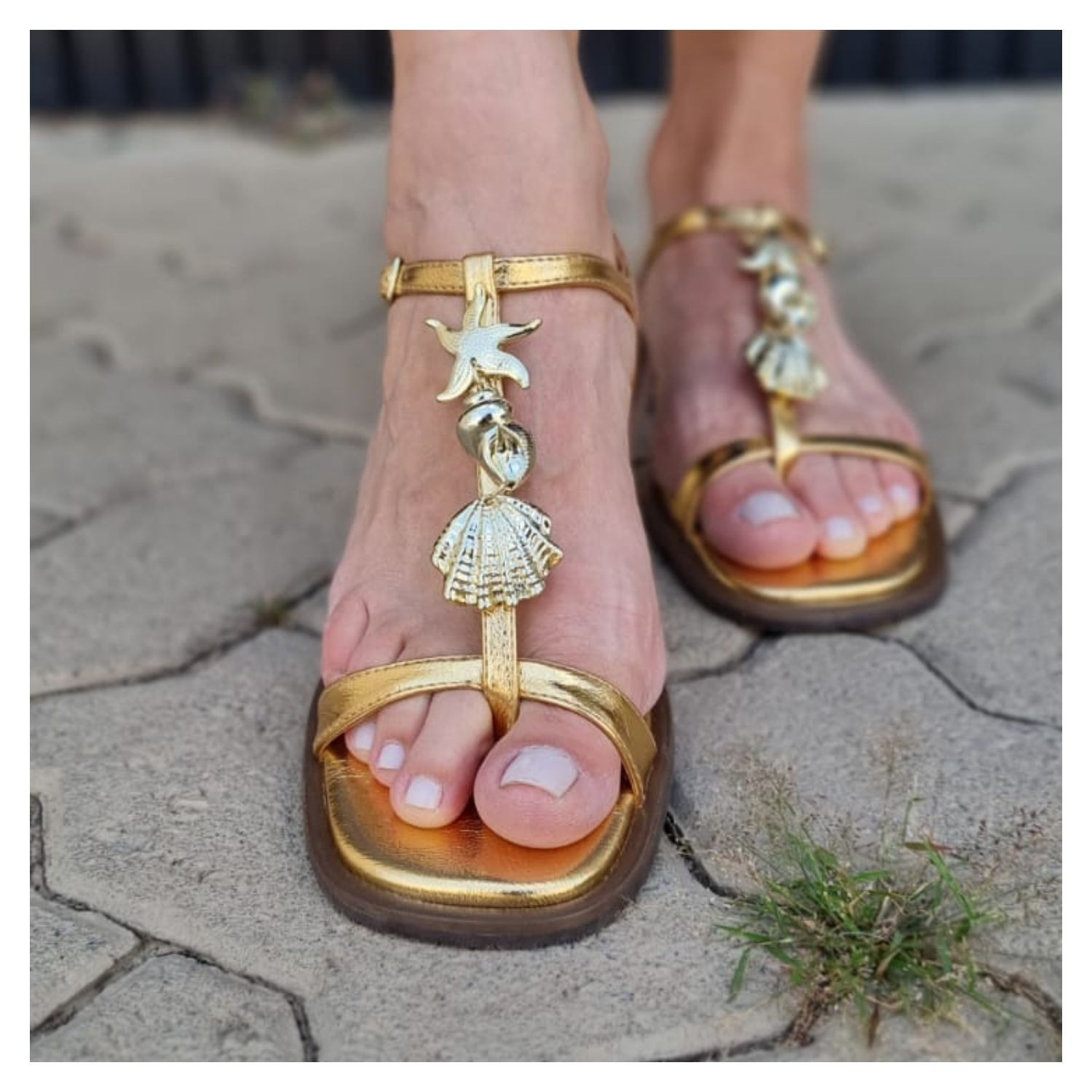 Rasteira Dourada Metalizada Tiras Finas Com Pingentes Tema "Mar".