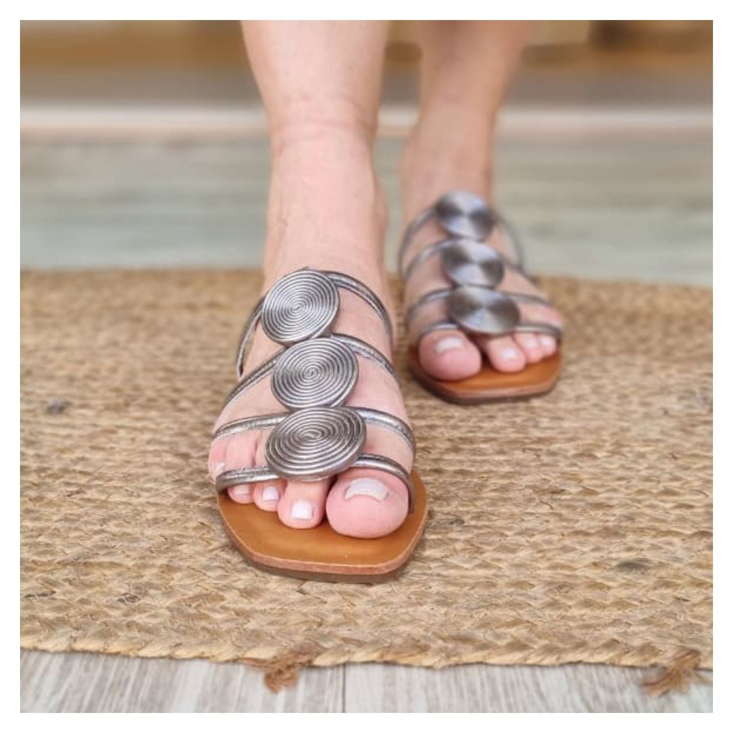 Rasteira Couro, Cabedal Com Tres Formas Espiral Onix Metalizado.