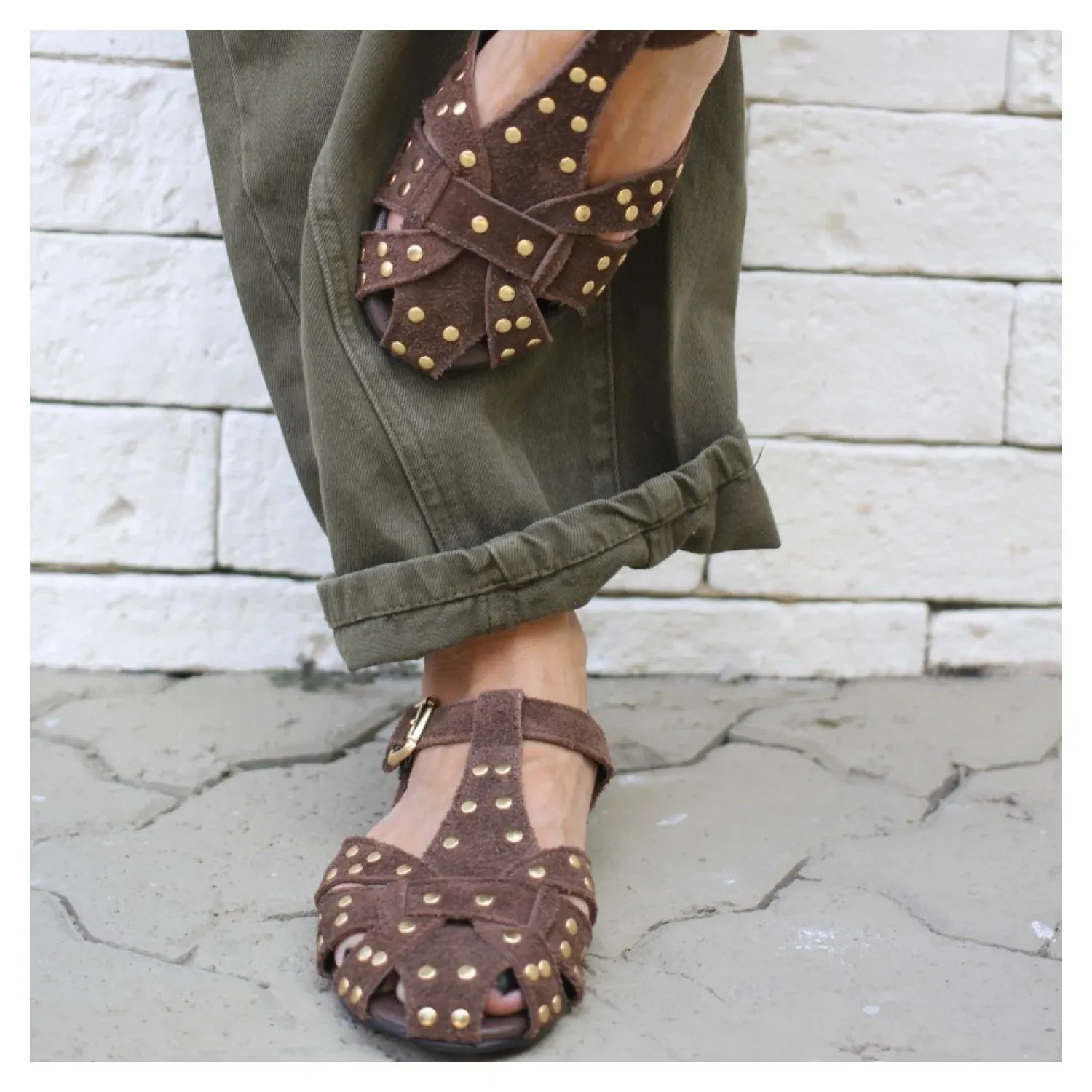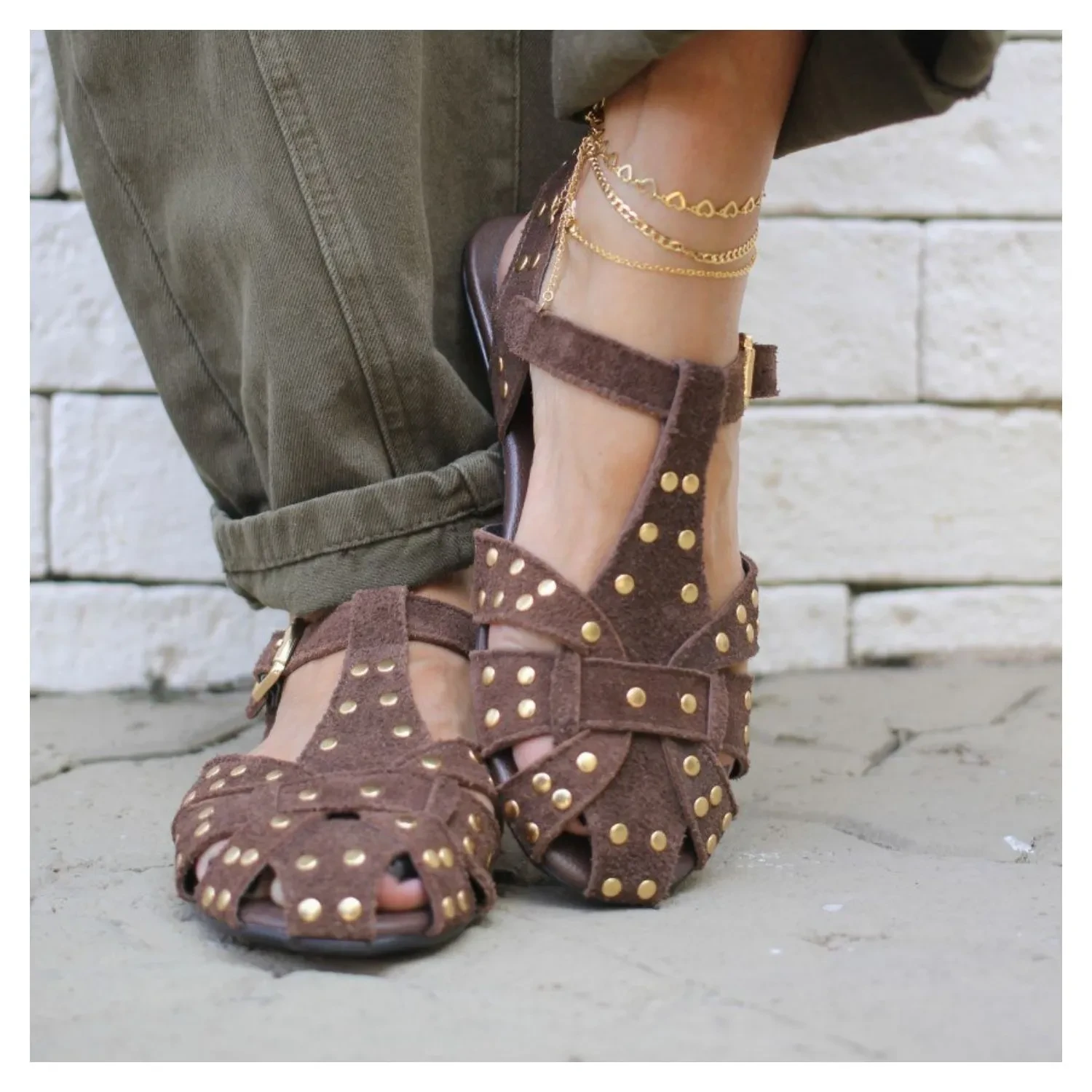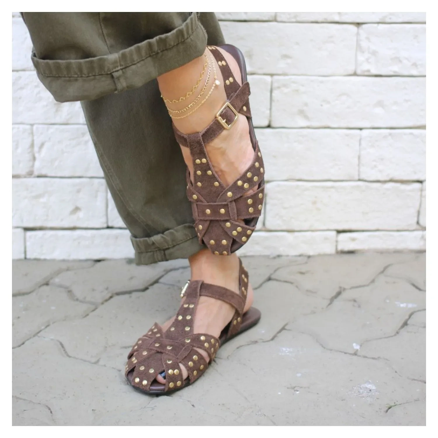 Rasteira Fisherman Nobuck Marrom, Esferas Douras e Fivela Para Ajuste Lateral.