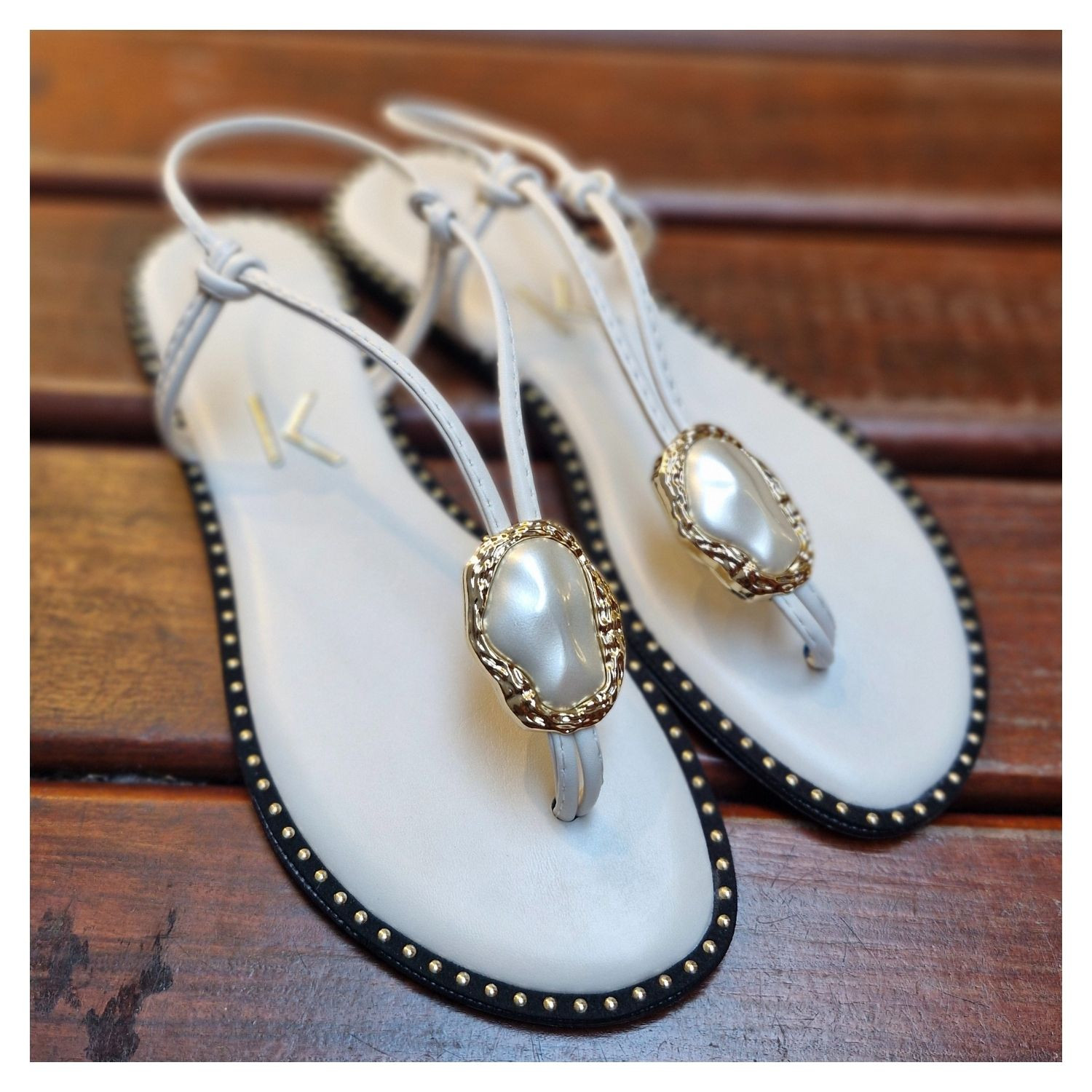 Rasteira Off White Tira Fina Com Max Pedra Dourada Martelada, Borda Preta Com Mini Esferas Metalizadas.