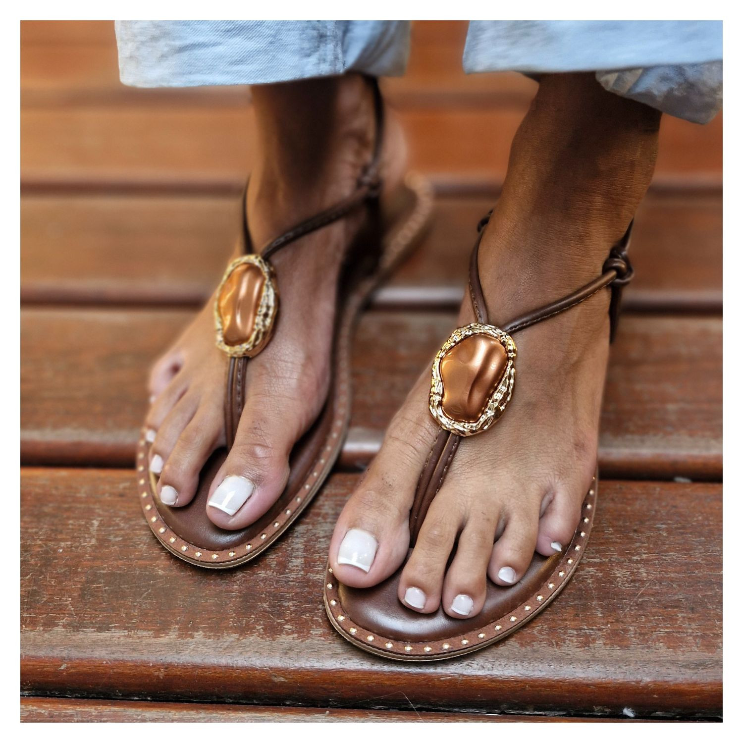 Rasteira Marrom Tira Fina Com Max Pedra Dourada Martelada, Borda Preta Com Mini Esferas Metalizadas.