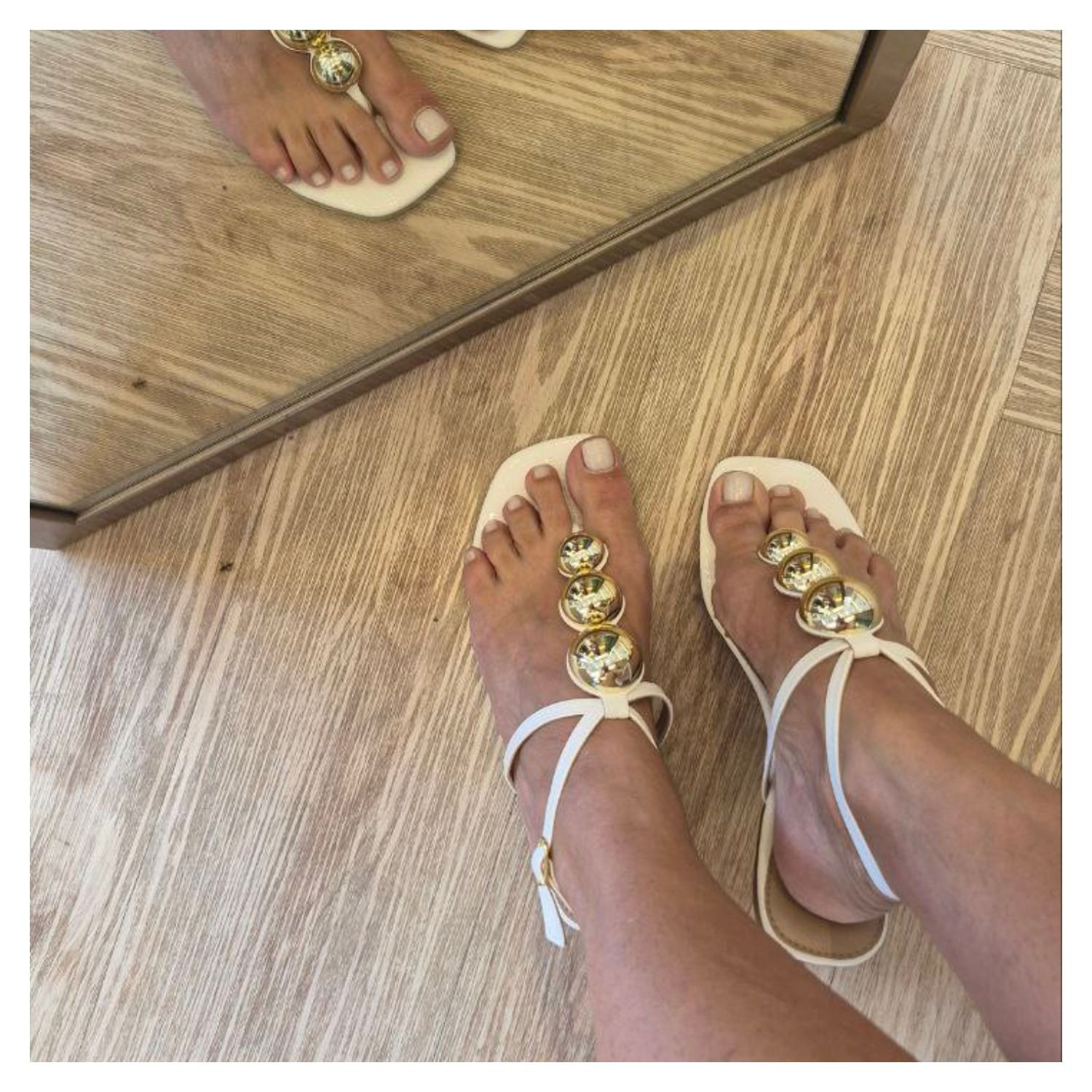 Rasteira Off White, Tiras Finas, Esferas Metalizadas Douradas e Tira Que Prende no Tornozelo.