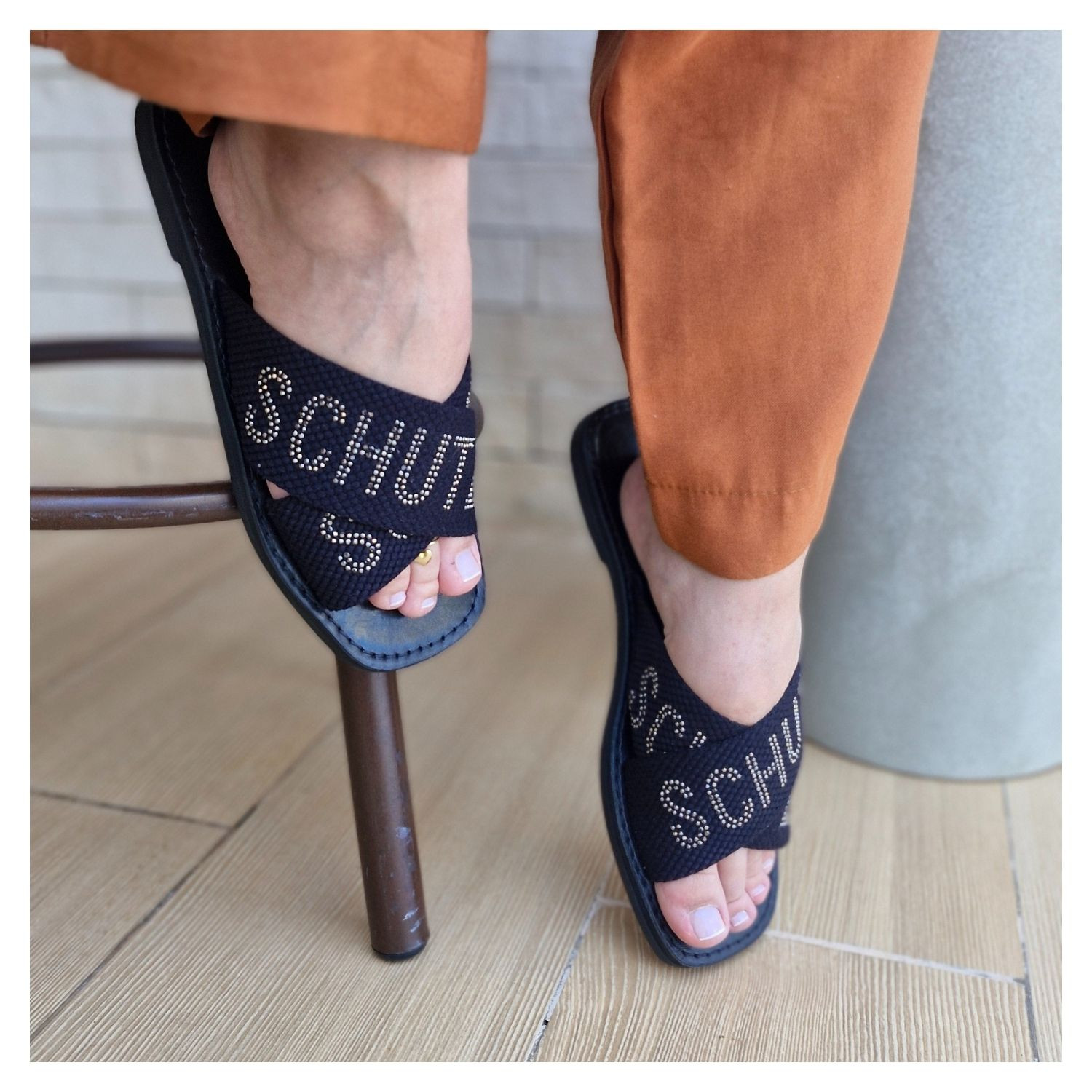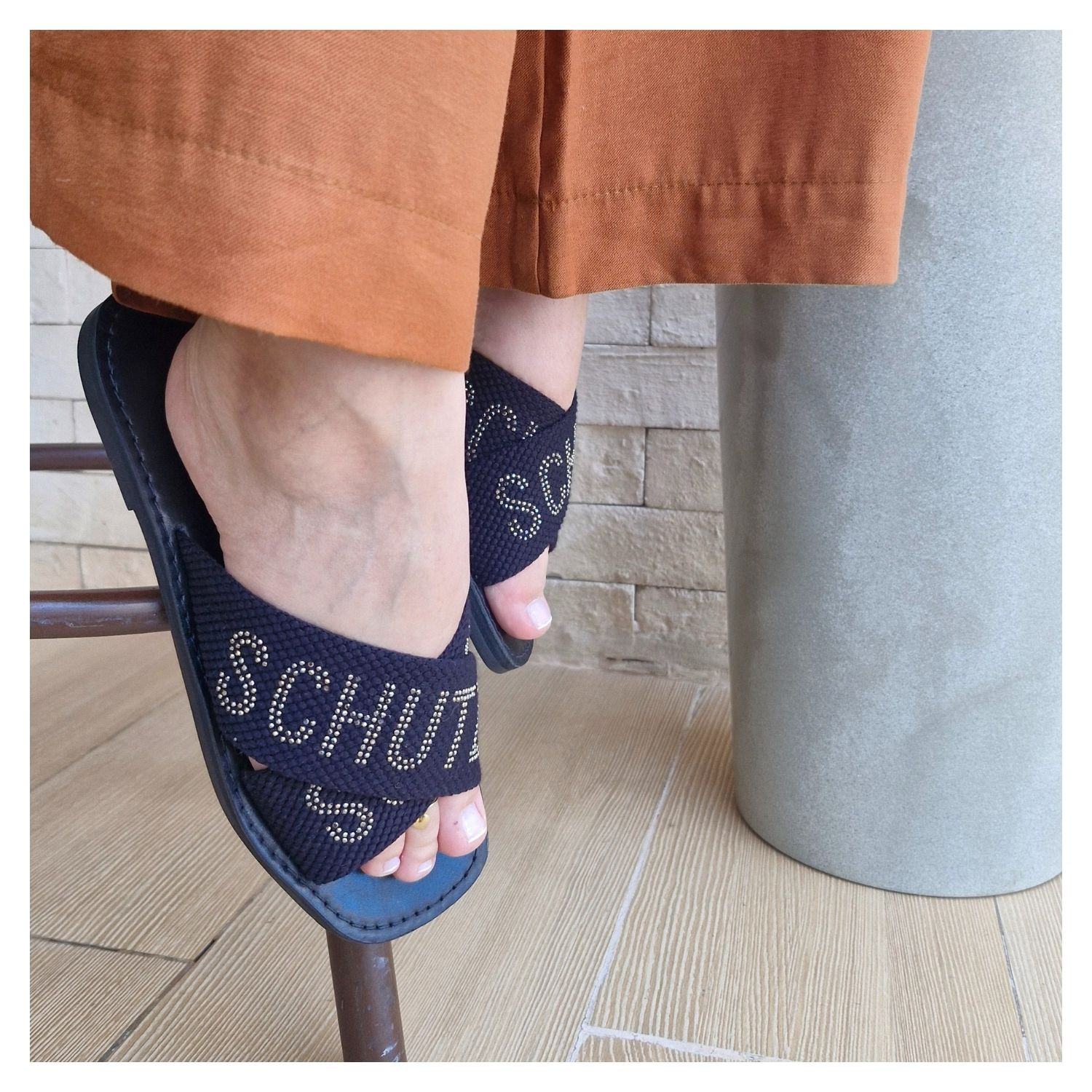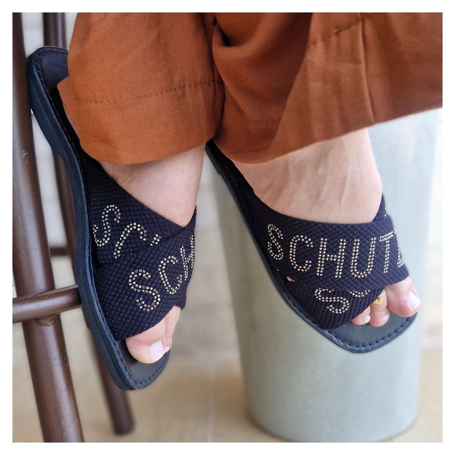 Rasteira Preta Cabedal em X Corda Escrita Logo Schutz em Stras Prateados.