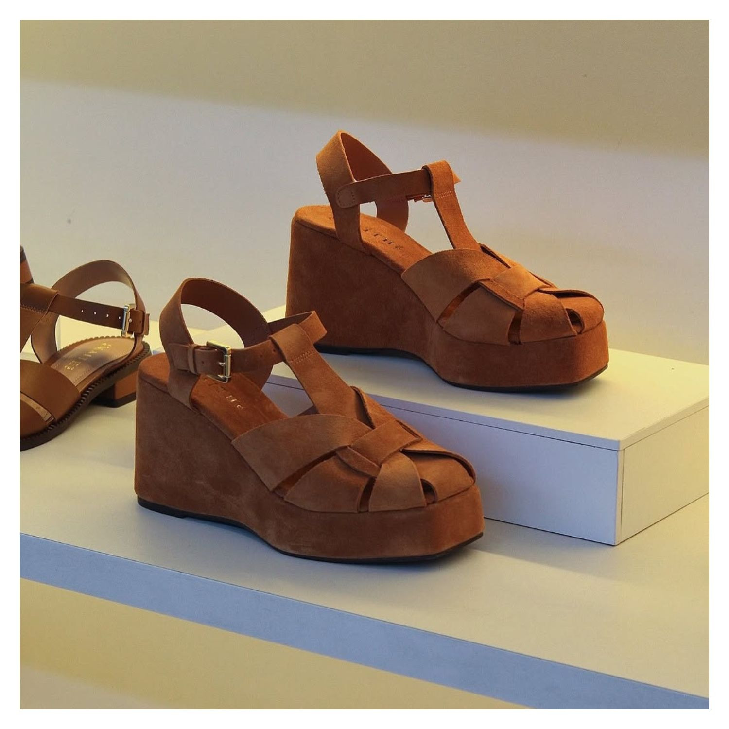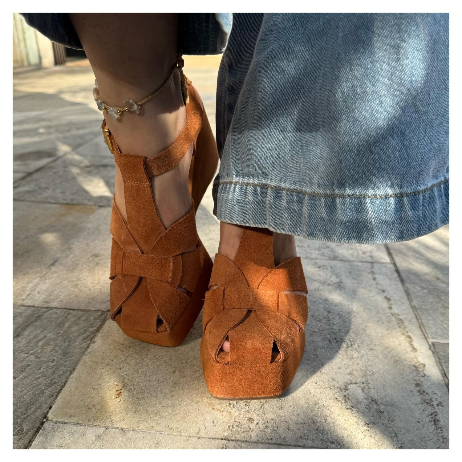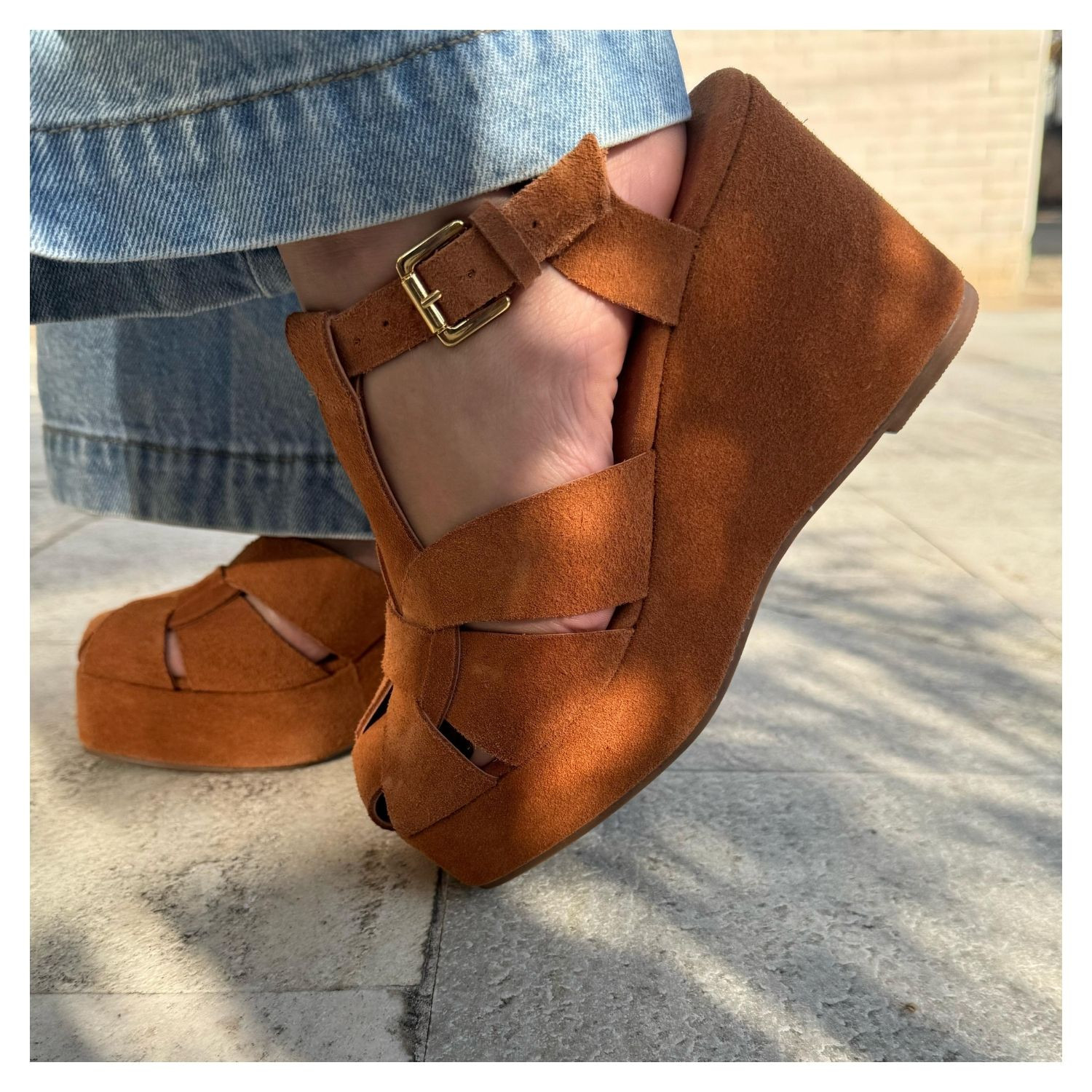 Sandália Anabela Em Camurça Caramelo Lisa Frente Fisherman