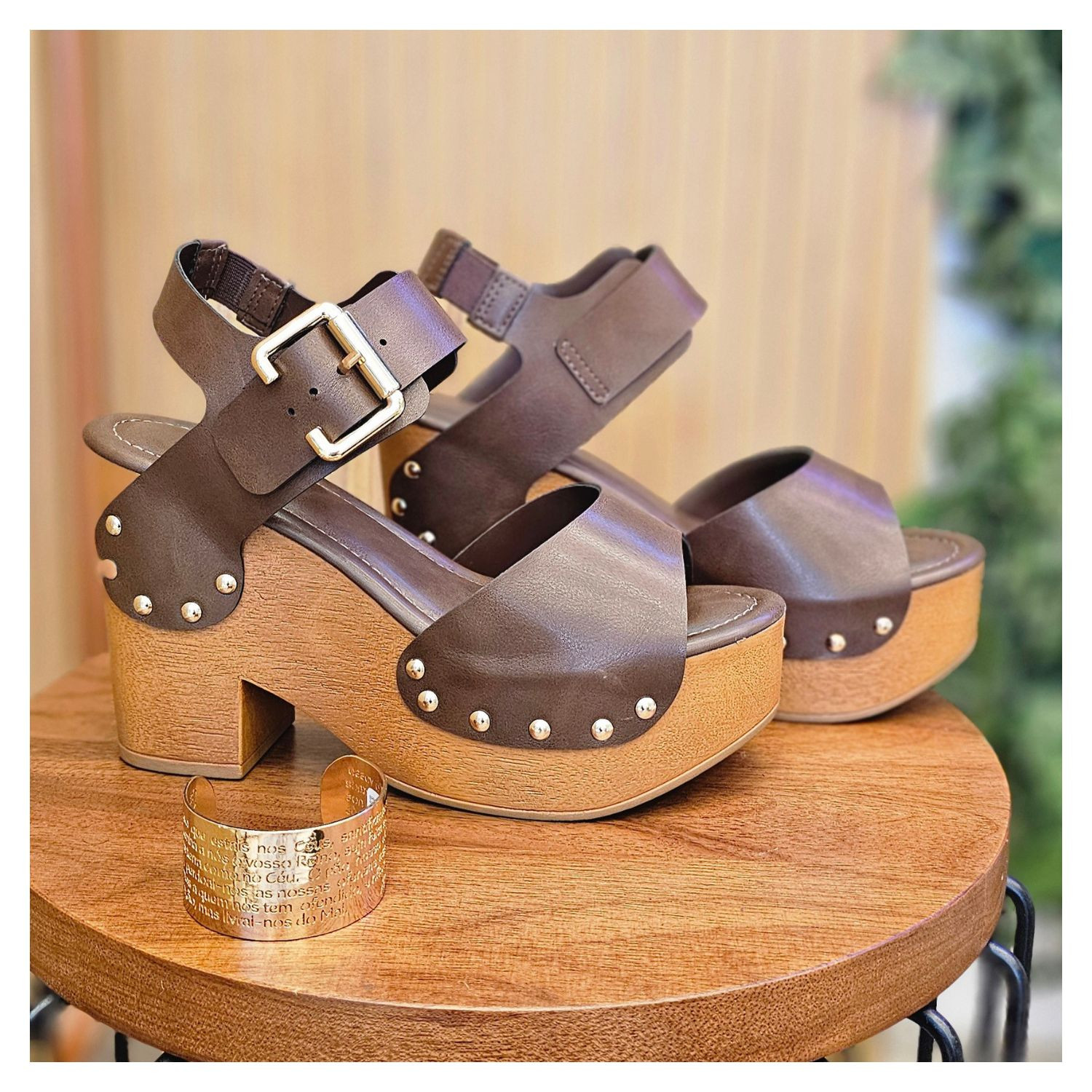 Sandália Salto Plataforma Madeira, Couro Ecológico Marrom Liso, Duas Max Fivelas, Borda Com Esferas Douradas.