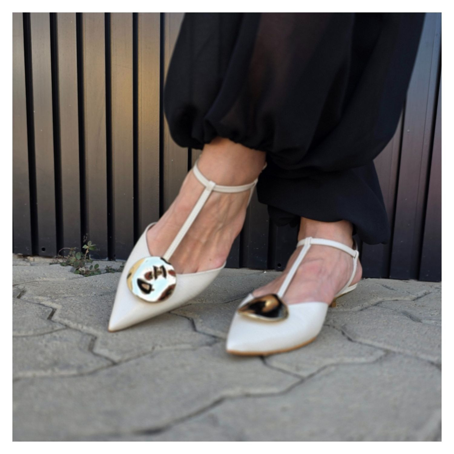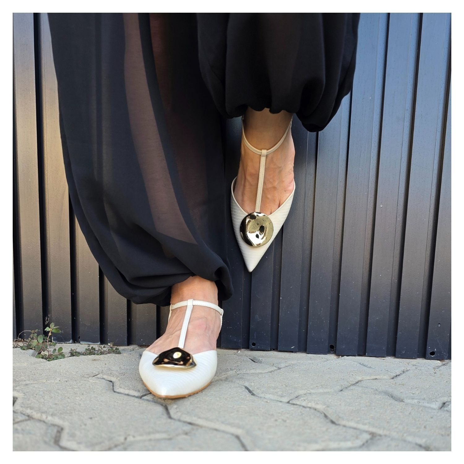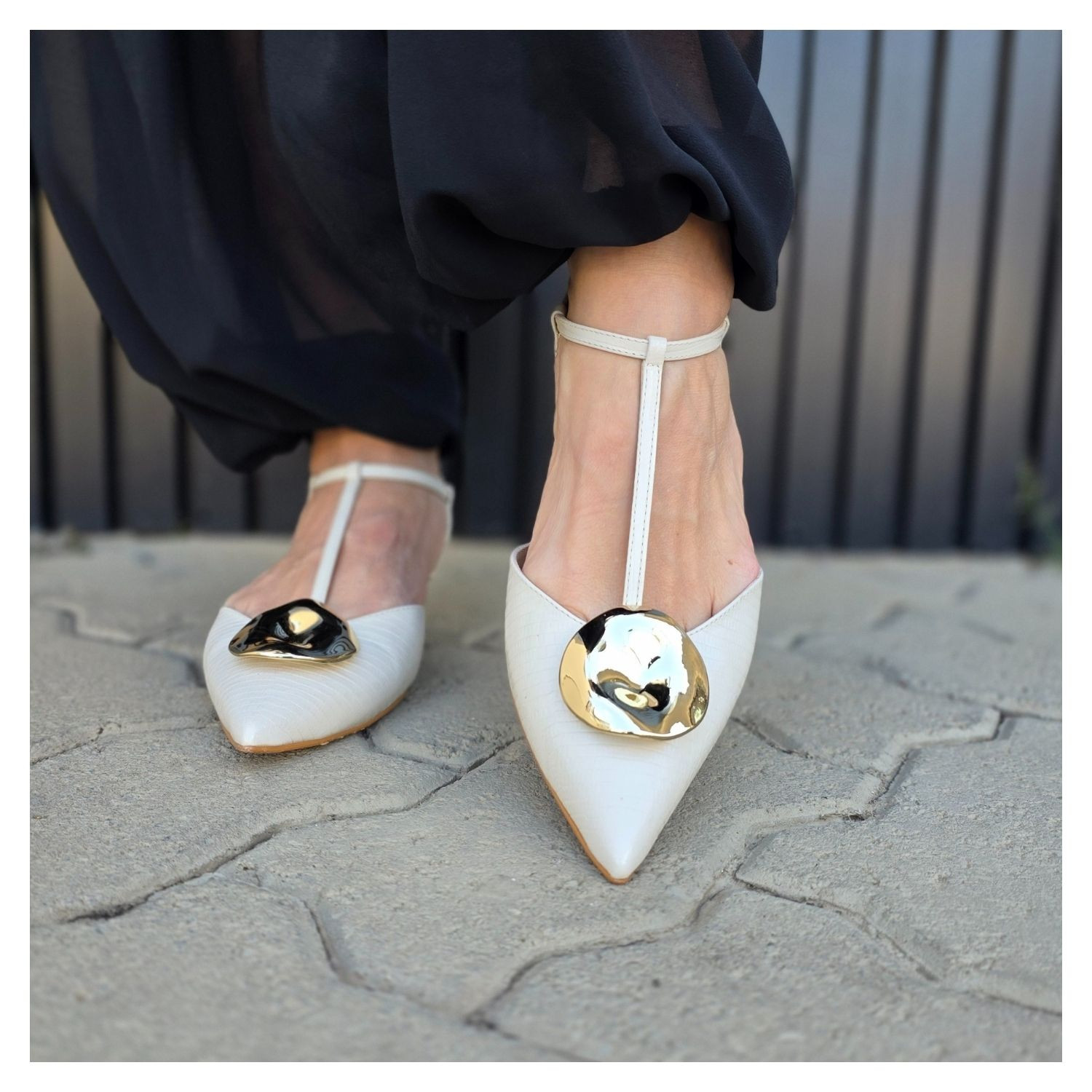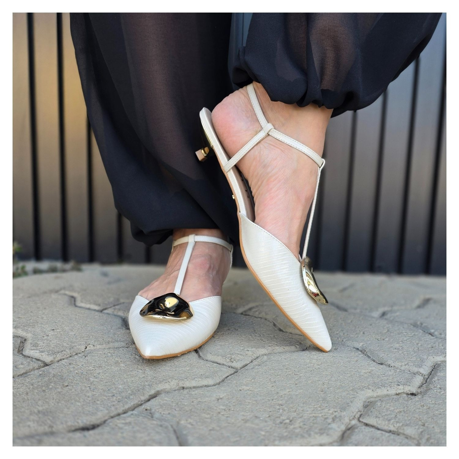 Sandália Couro Croco Off White, Bico Fino, Max Chapa Dourada, Saltinho Fino.