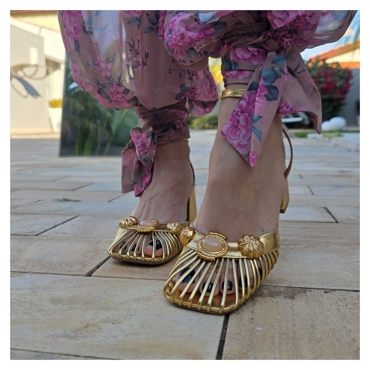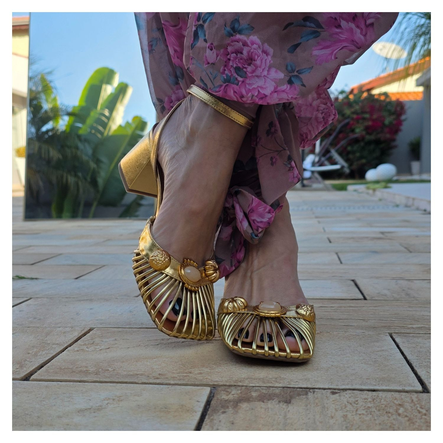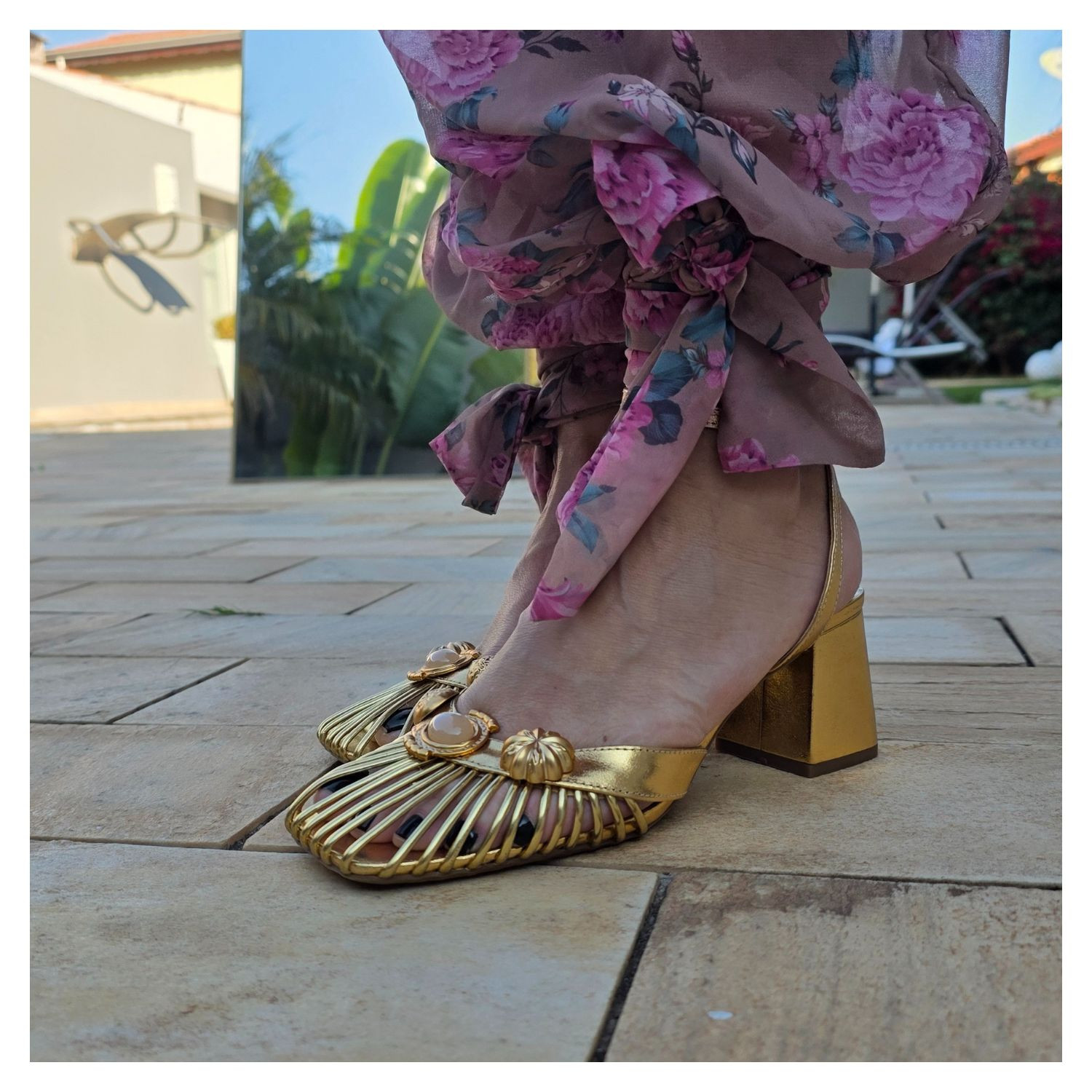 Sandália Metalizada Dourada, Frente Fechada Em Fios Dourados Com Chapas Ovais e Pedras Dentro, Uma Tira Fina Com Fivela Que Prende O Tornozelo, Salto Bloco Alto.