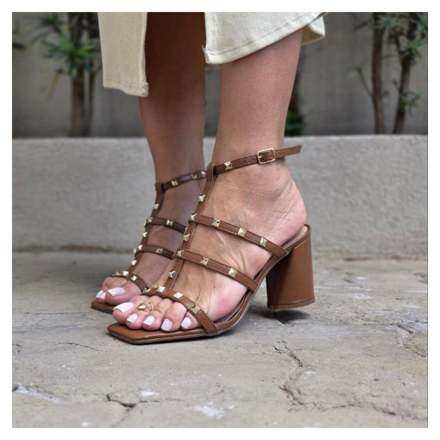 Sandalia Marrom Cabedal Tiras Finas Com Spikes Dourados, Salto Redondo.
