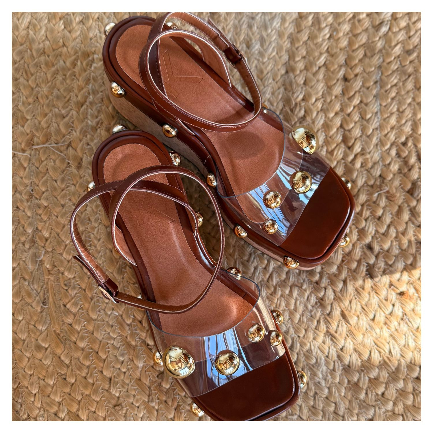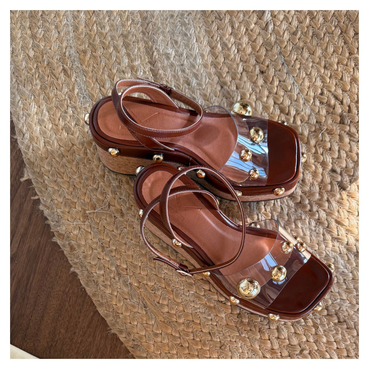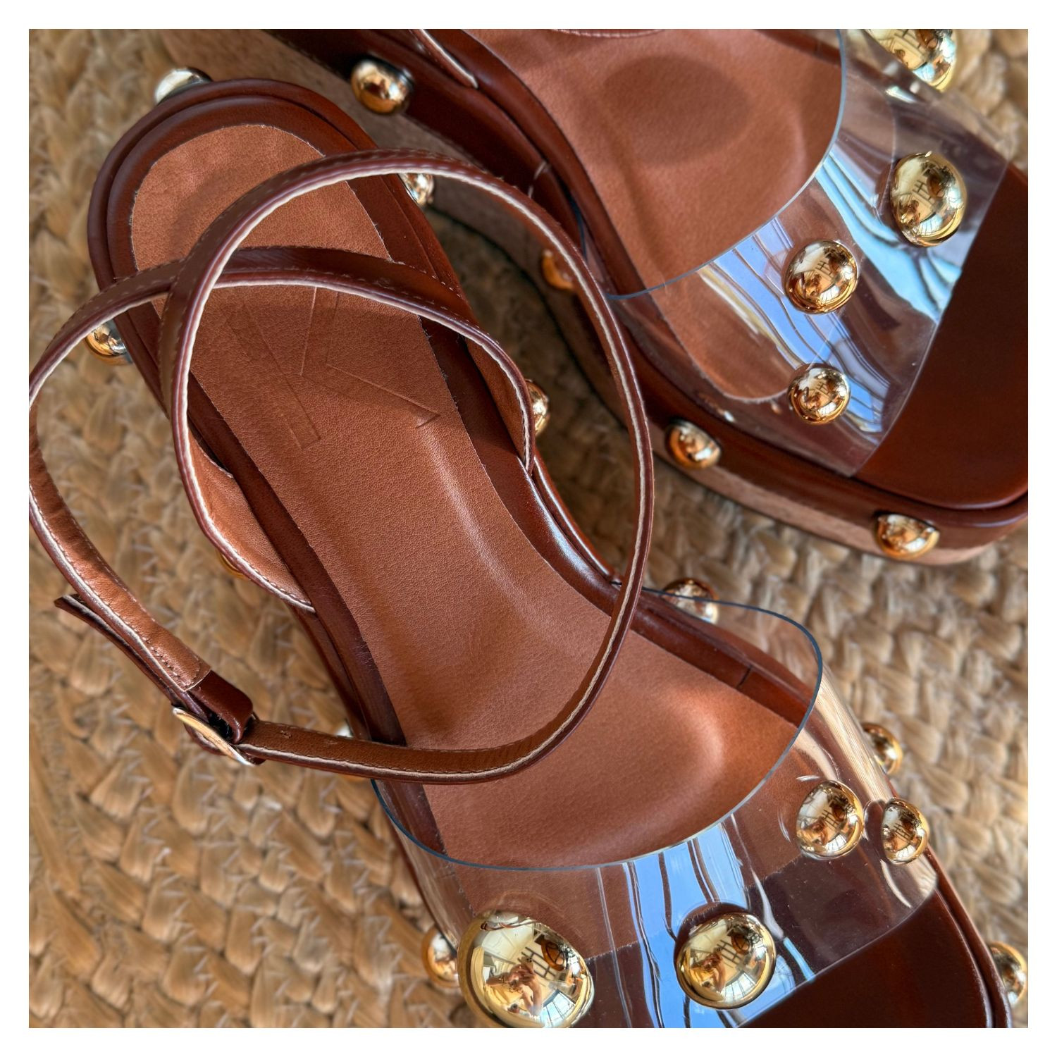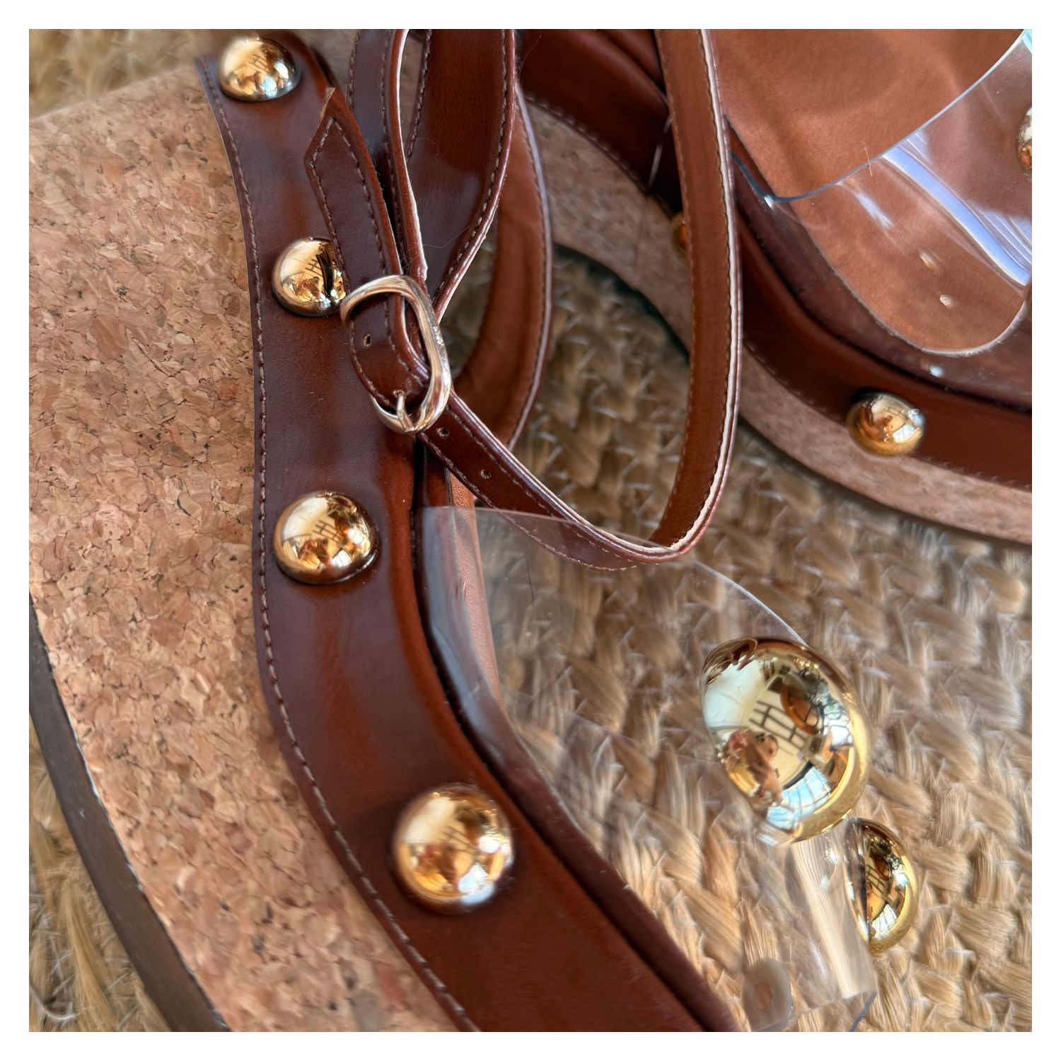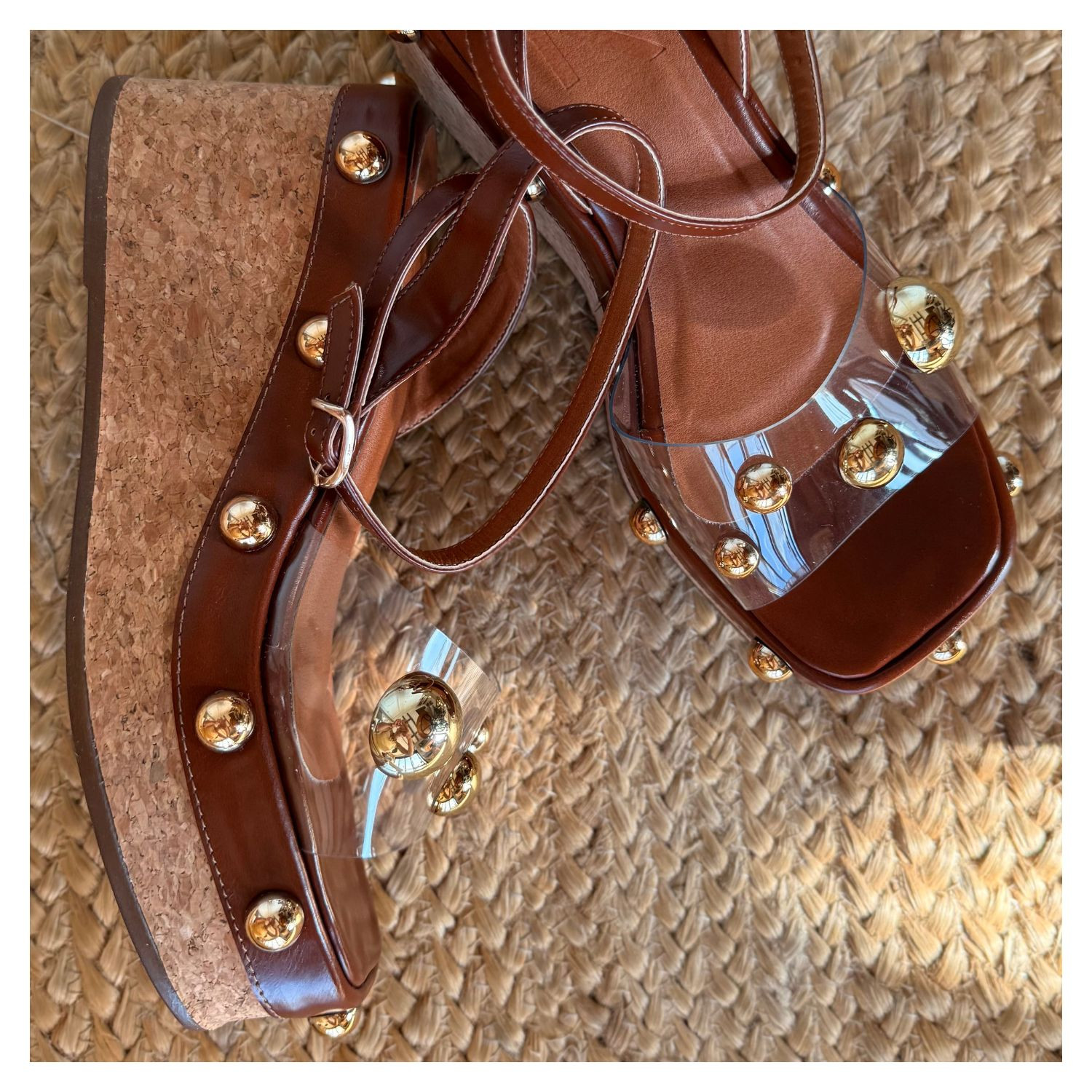 Sandália Anabela Média Marrom, Uma Tira Grossa De Vinil Com Max Meias Esferas Douradas E Envolta Da Sola Em Cortiça, Uma Tira Fina Que Amarra O Tornozelo.