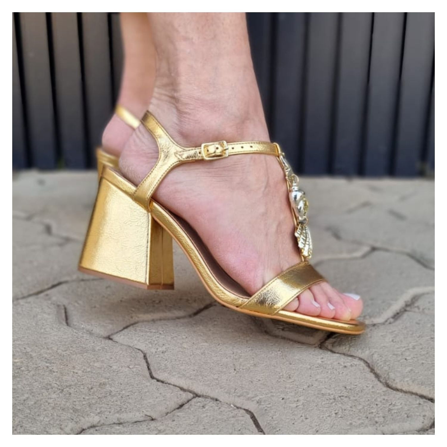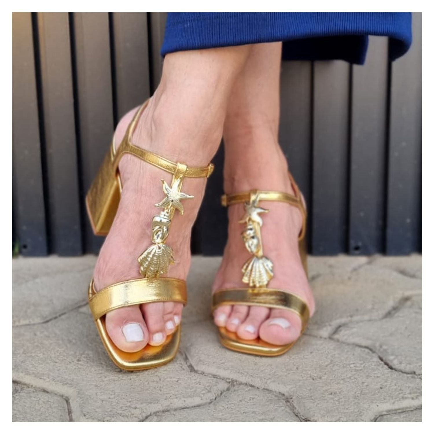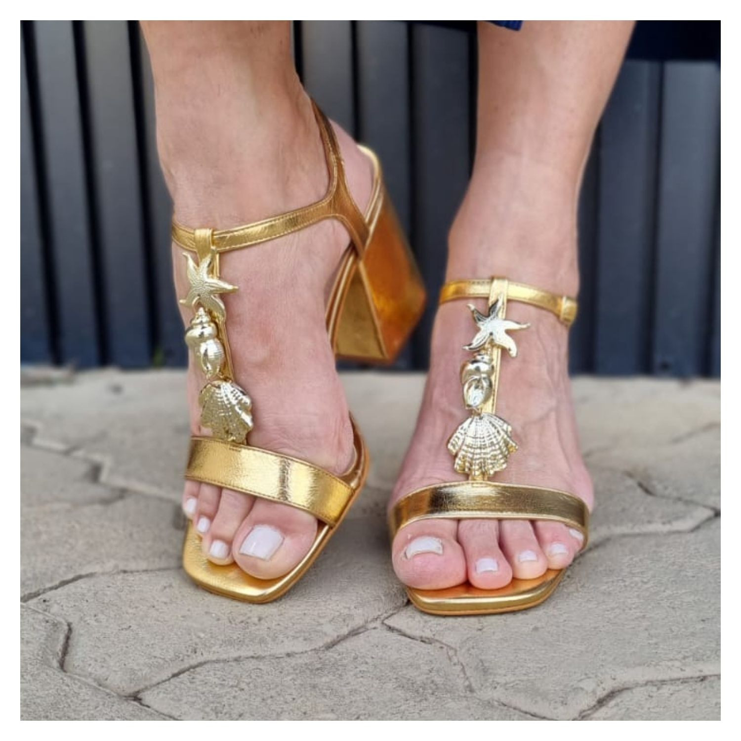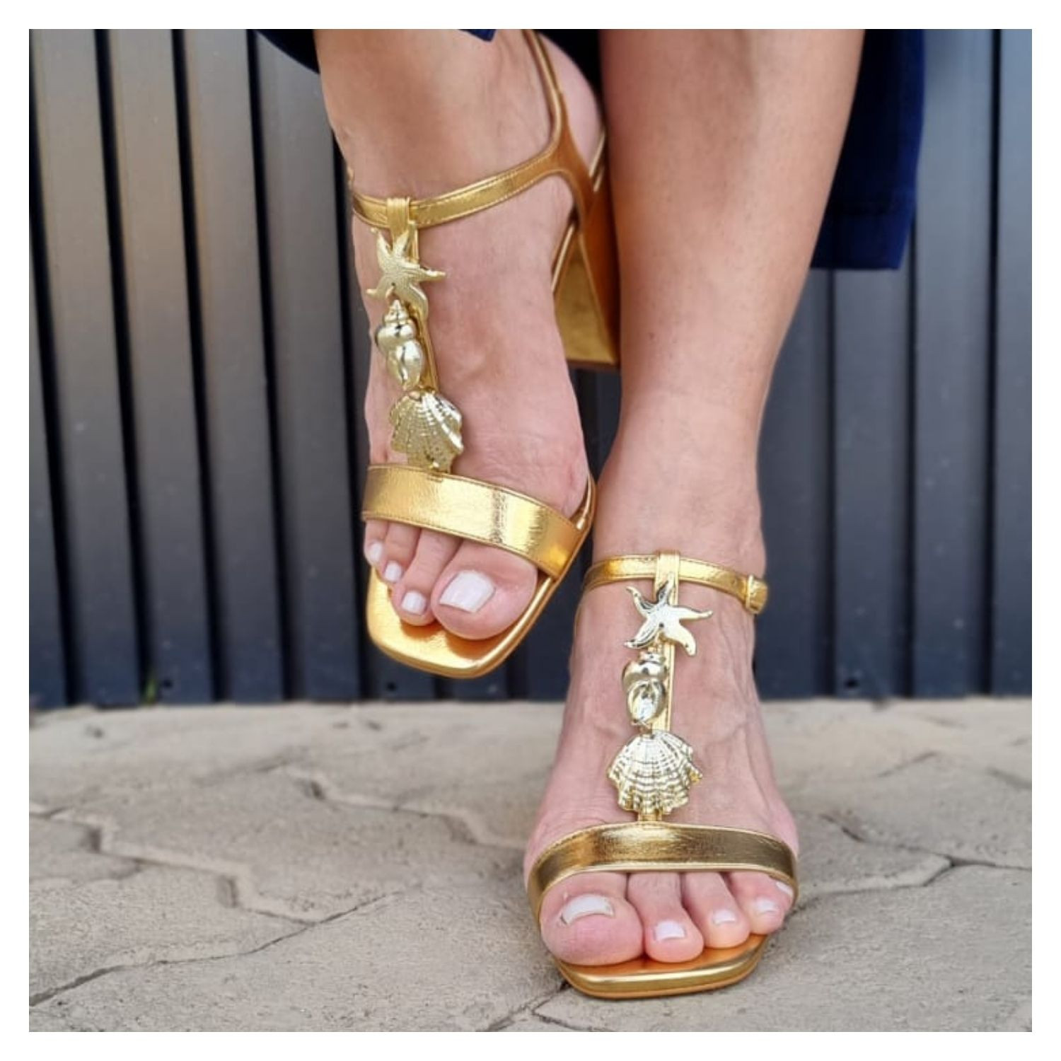 Sandalia Dourada Metalizada, Salto Bloco, Cabedal Tiras Finas Com Conchas do Mar.