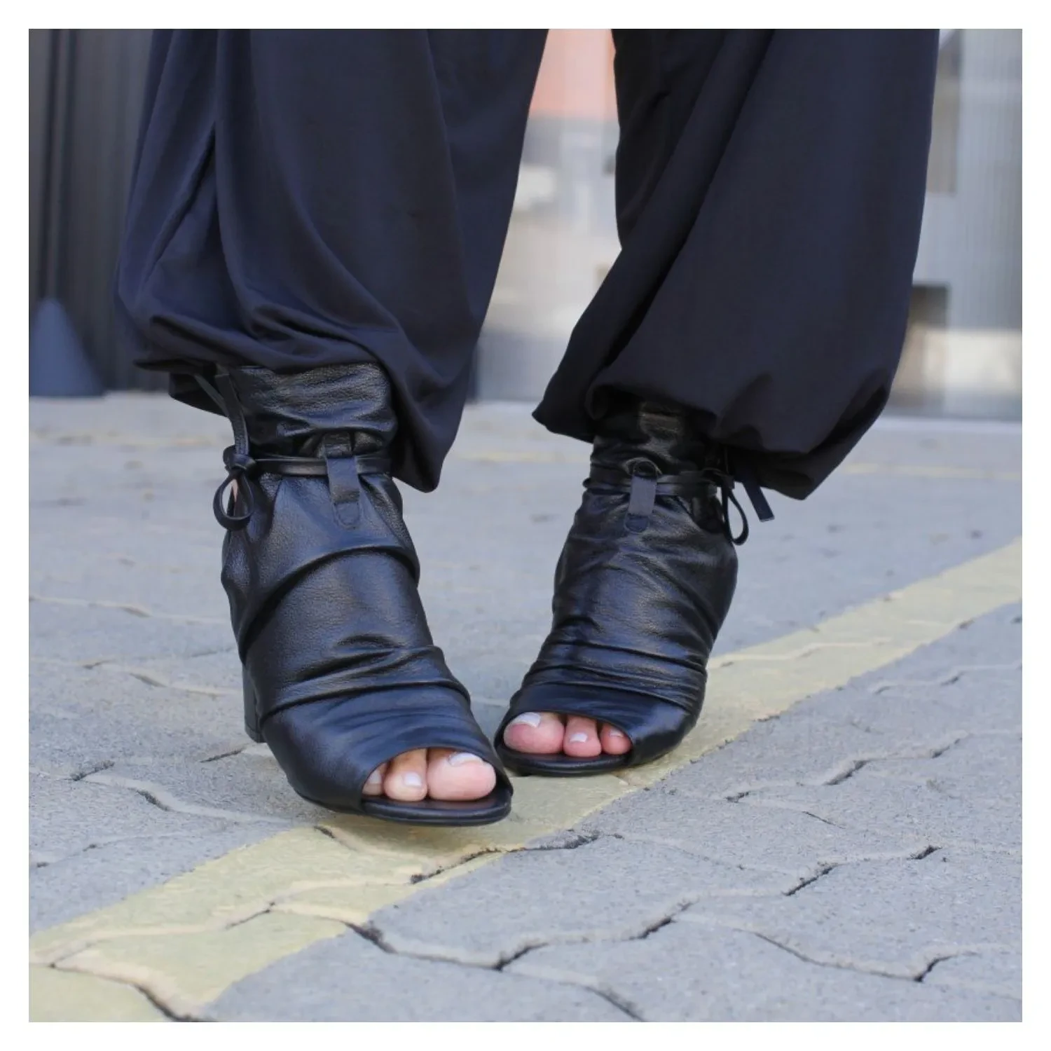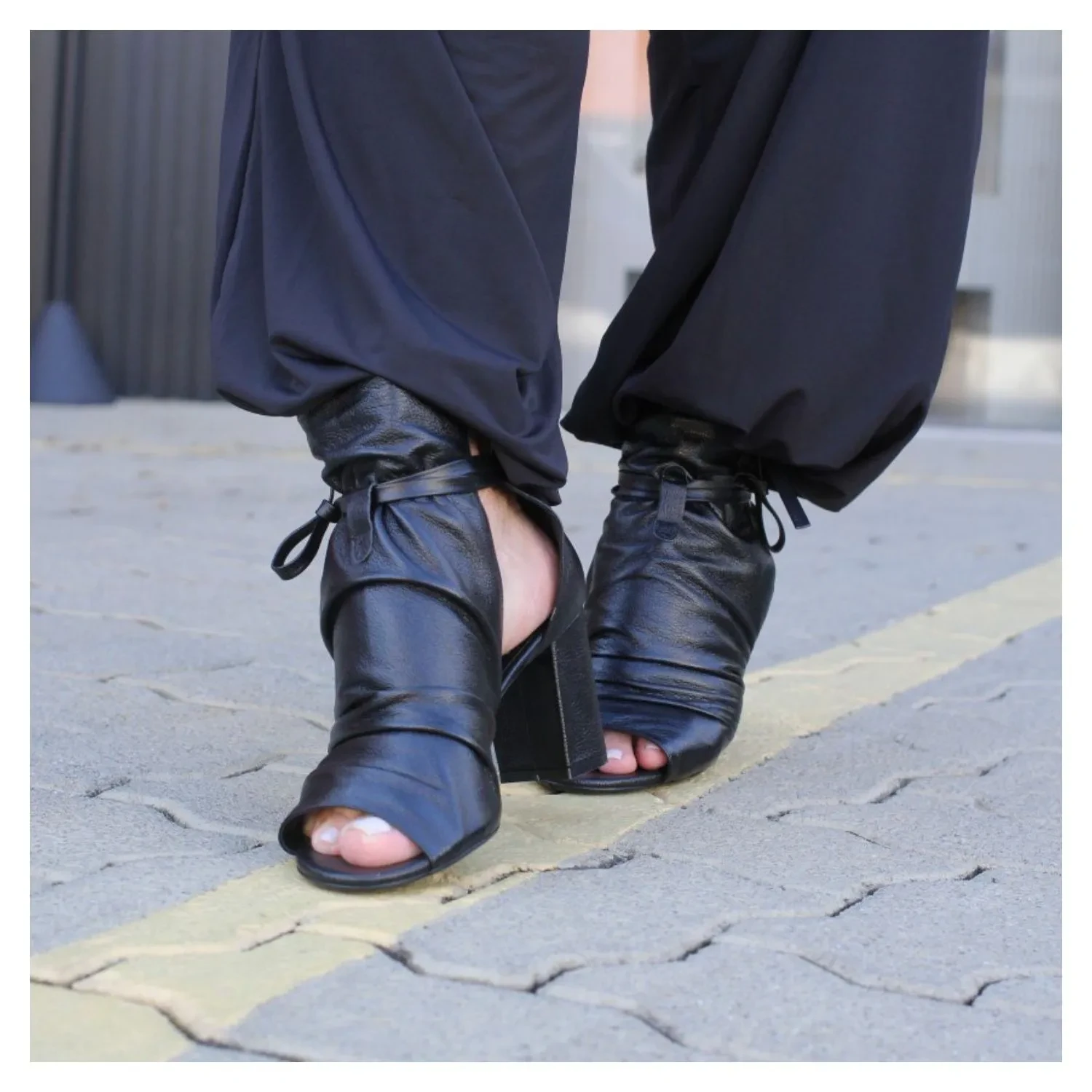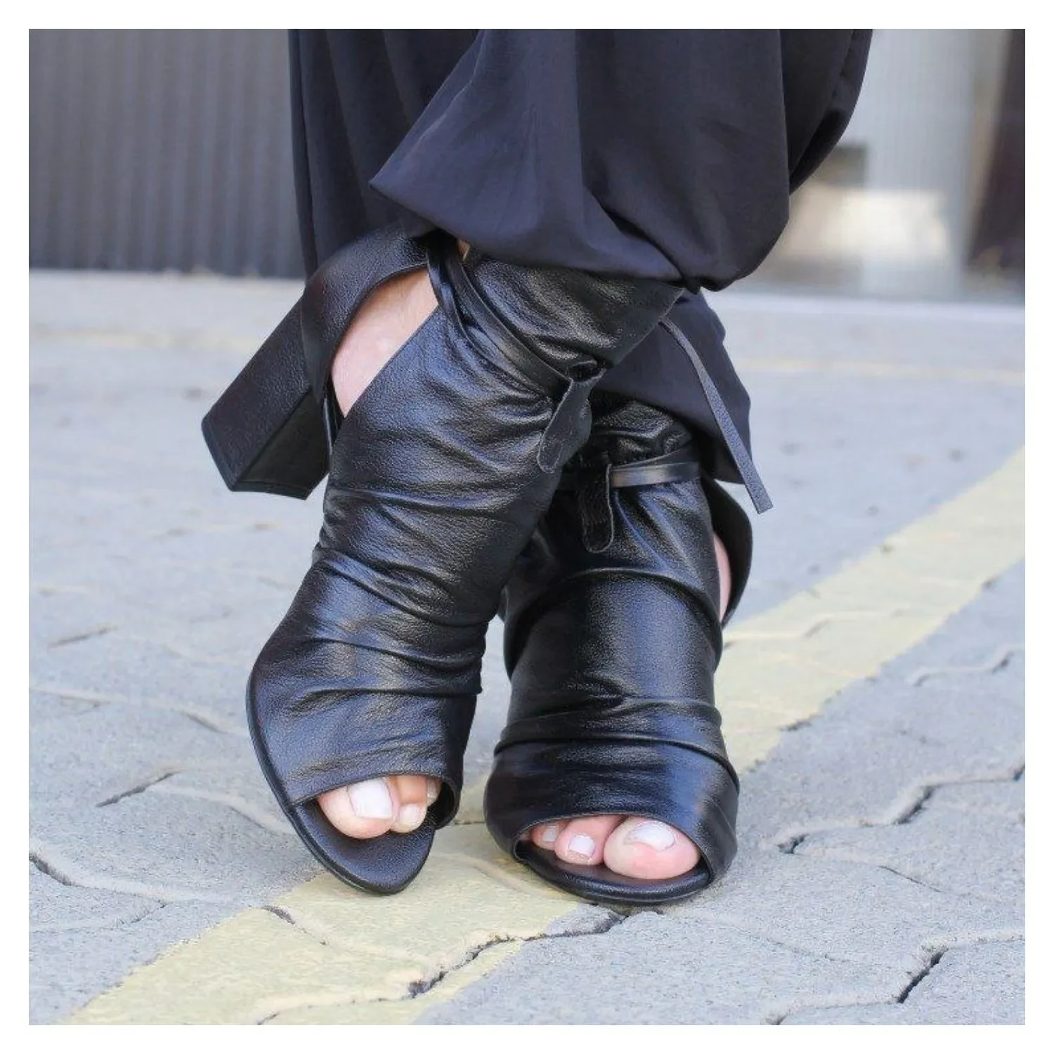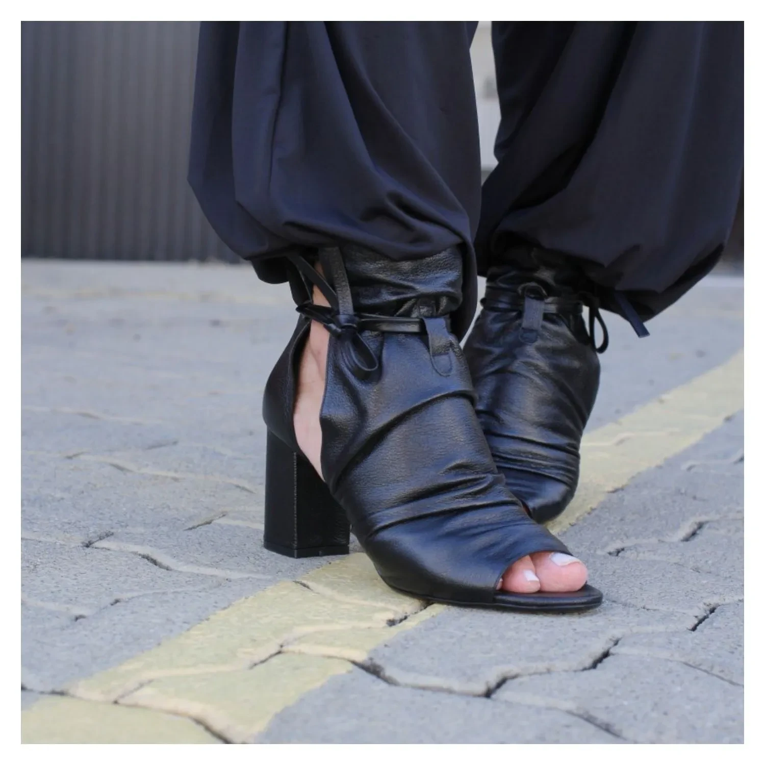 Open Boot Em Couro Preto Pelica, Salto Bloco, Tiras Amaração e Ajusto.