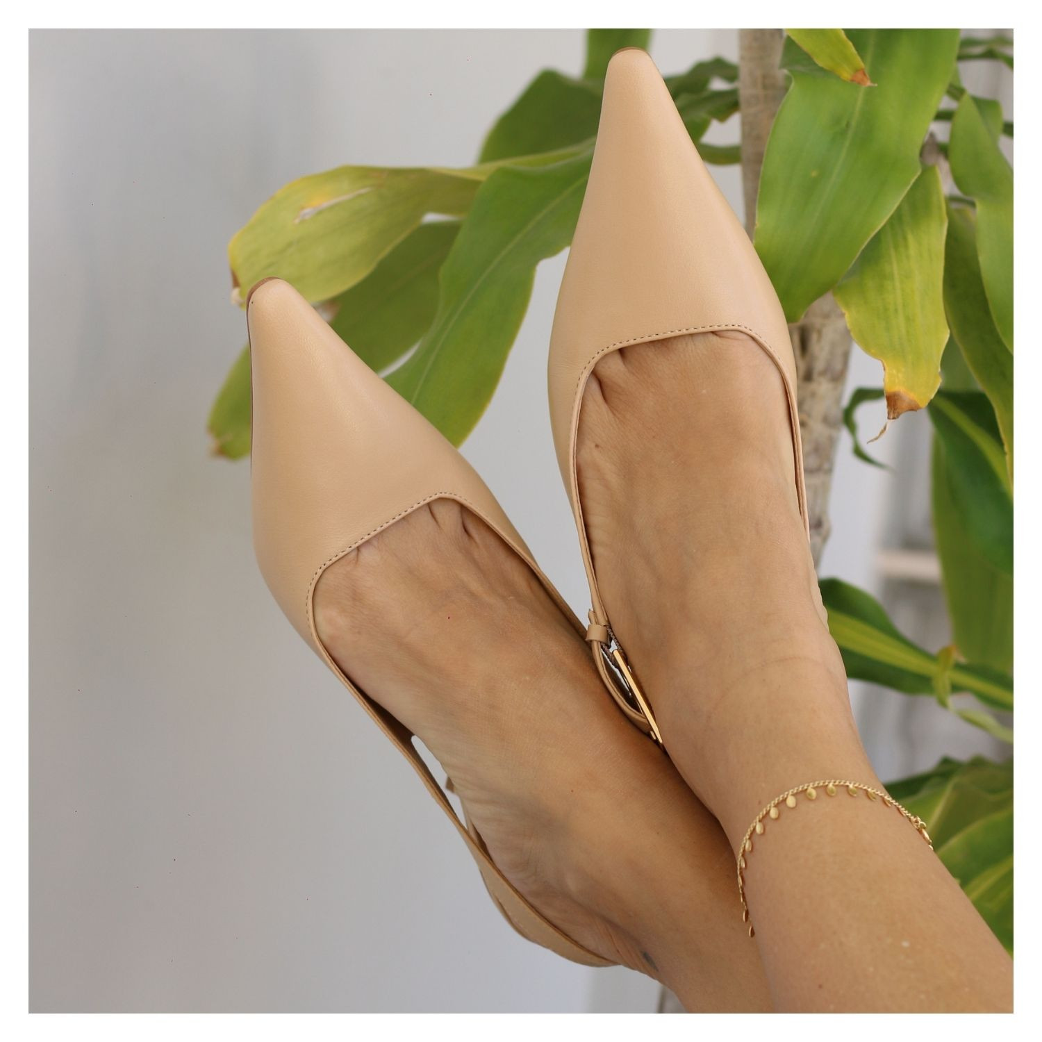 Scarpin em Couro Bege, Salto Fino Triangular, Fivela Larga Lateral Dourada e Recorte Reto No Cabedal.